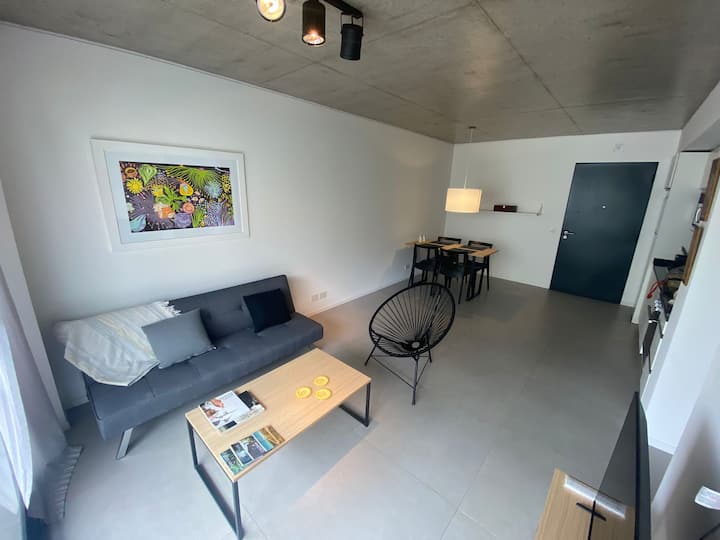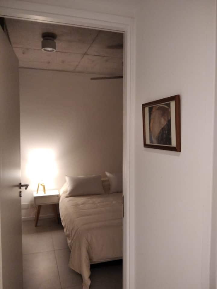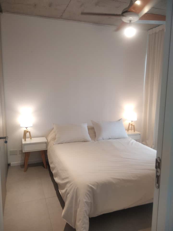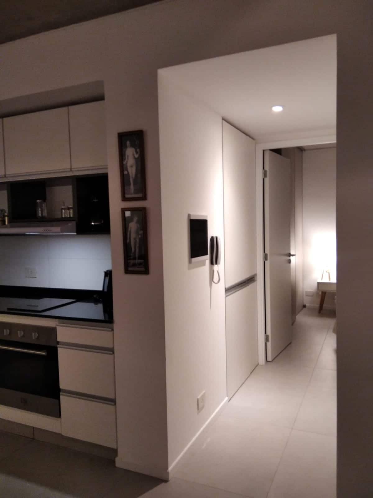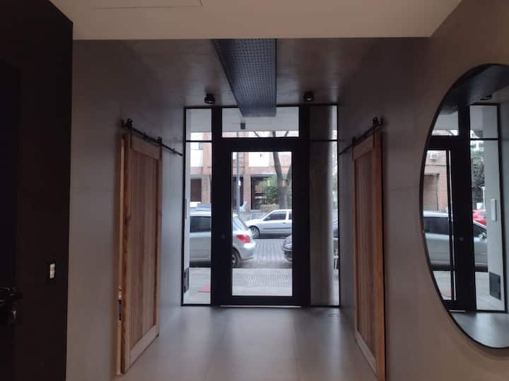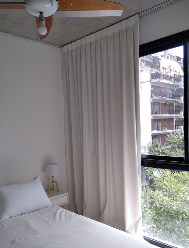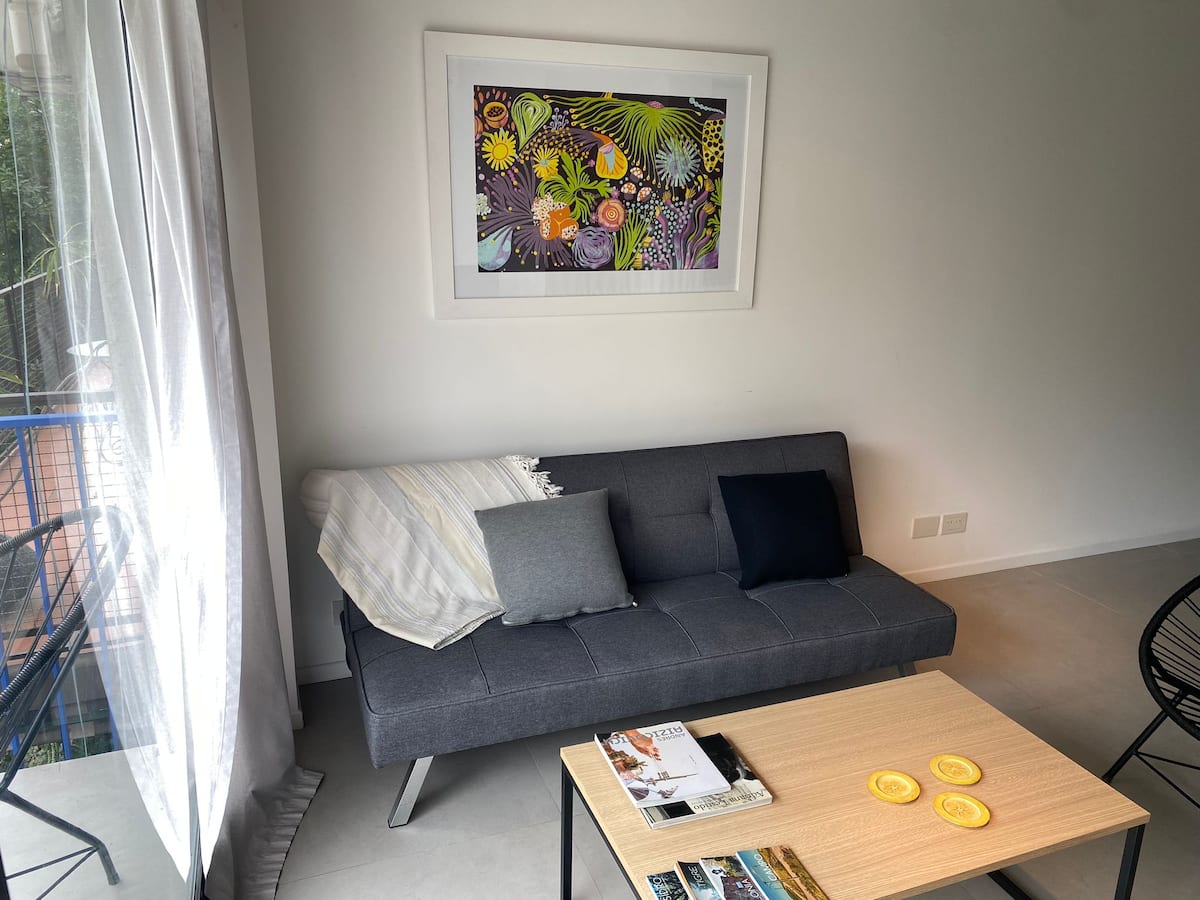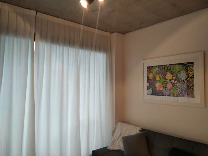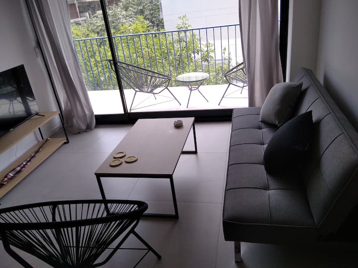 Apartamento de 44 m² em Belgrano, com vista para a copa das árvores e varanda. No térreo, há uma área de cozinha/dining/living integrada à varanda e um quarto com cama de casal, além de 1 banheiro. O imóvel tem TV HD Smart, Wi-Fi, micro-ondas, geladeira com freezer, fogão a gás e ar-condicionado frio/quente; a cozinha inclui forno elétrico, fogão de vidro-cerâmica, chaleira elétrica, torradeira e cafeteira elétrica. O prédio oferece bicicletário no térreo e, no 8º andar, uma área de terraço com