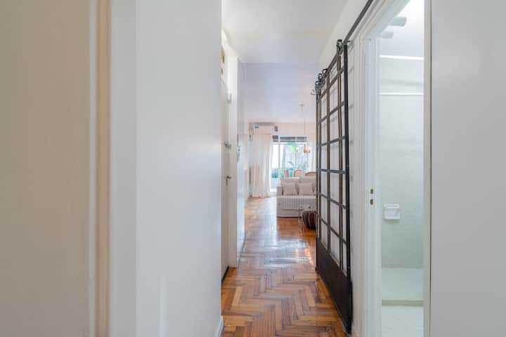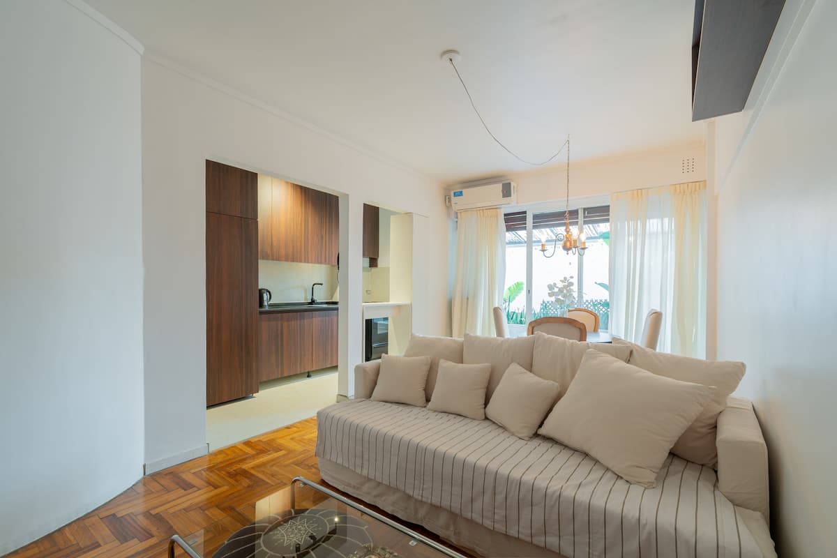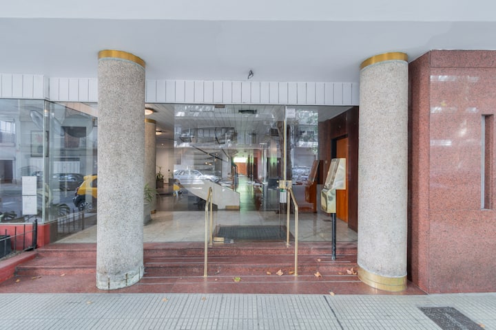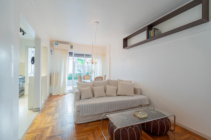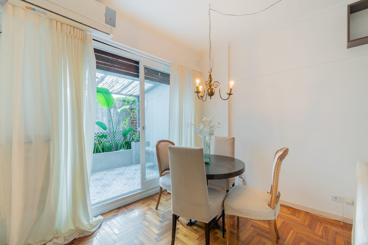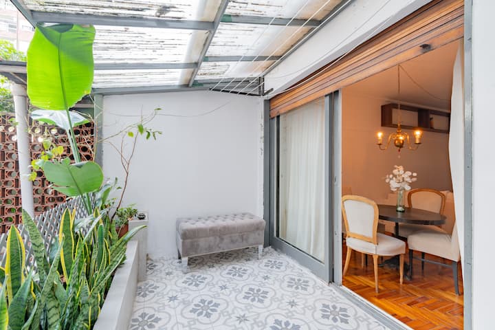 Apartamento de 1 quarto reformado, com terraço privativo e área de churrasco. O imóvel fica em Colegiales e tem cozinha totalmente equipada, incluindo máquina de lavar. A unidade dispõe de serviços com custo adicional, como transfer do aeroporto e limpeza durante a estadia.