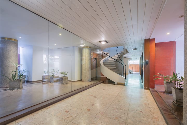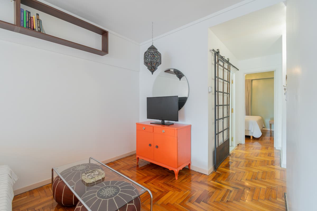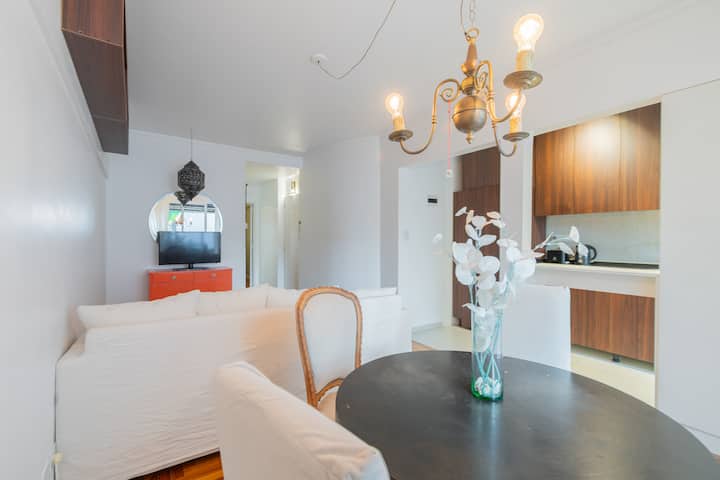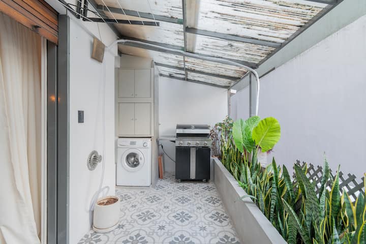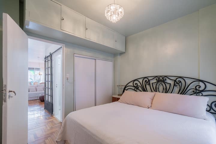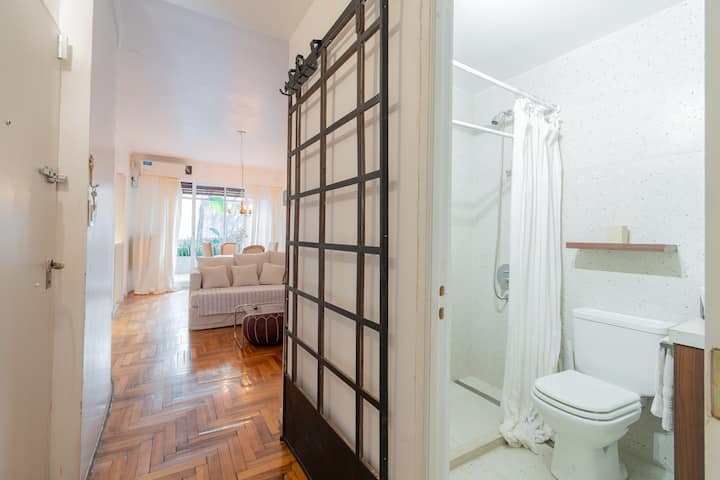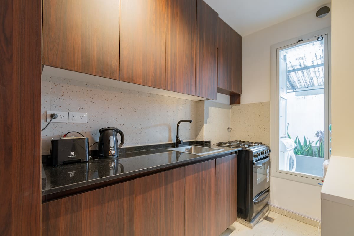 Apartamento de 1 quarto reformado, com terraço privativo e área de churrasco. O imóvel fica em Colegiales e tem cozinha totalmente equipada, incluindo máquina de lavar. A unidade dispõe de serviços com custo adicional, como transfer do aeroporto e limpeza durante a estadia.