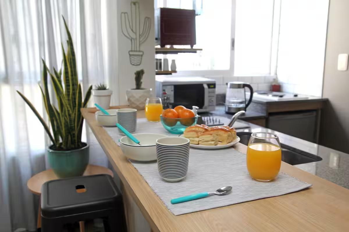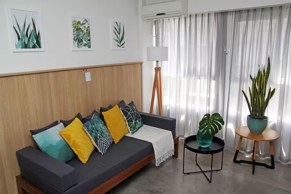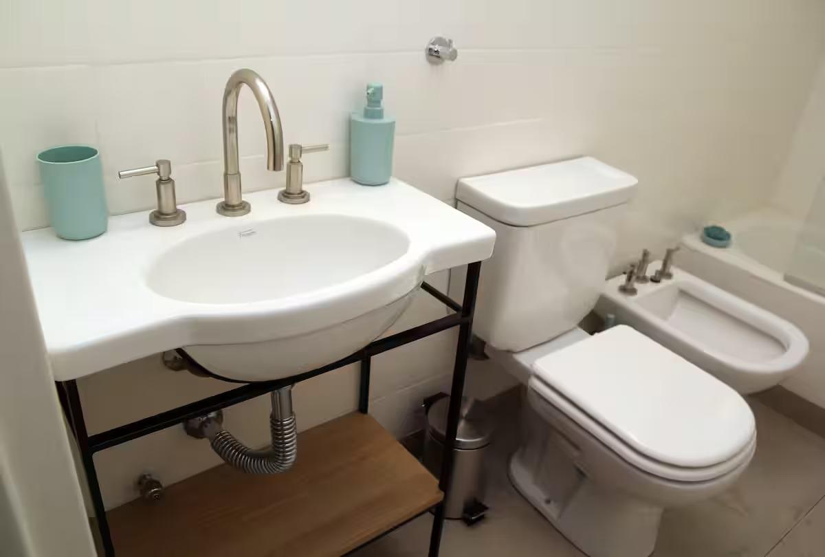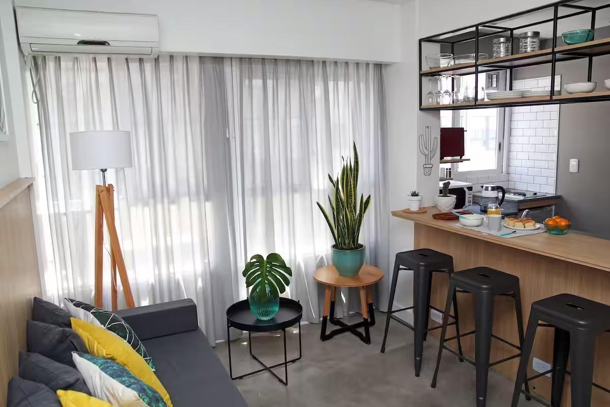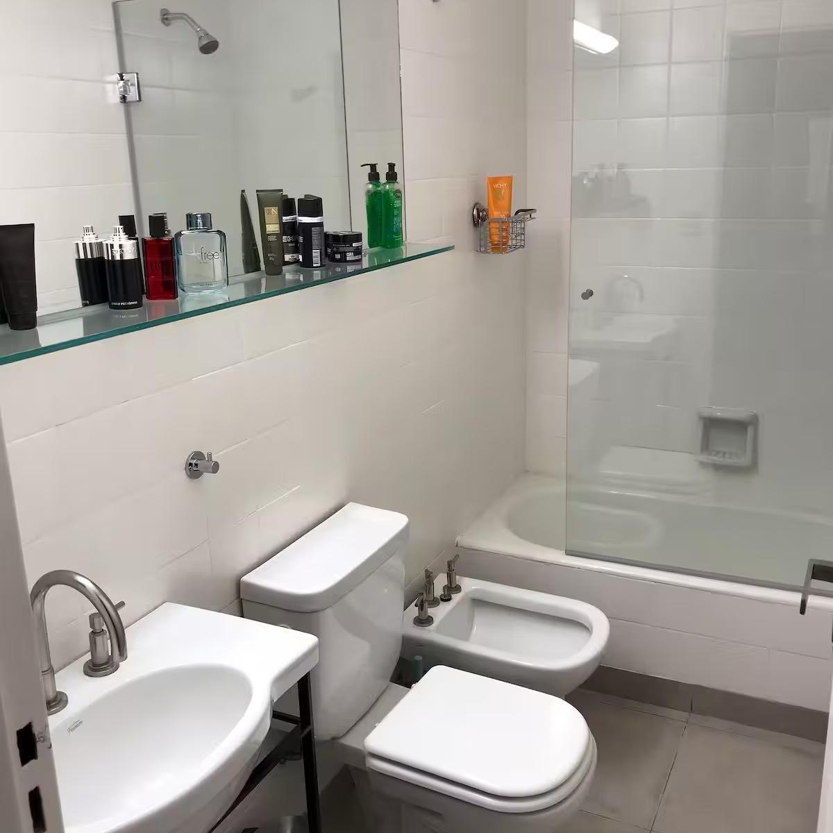 Apartamento de dois ambientes em Hipólito Yrigoyen e San José, em Monserrat, com capacidade para 3 pessoas. Possui quarto com cama de casal, sala de estar e jantar com sofá, cadeiras e mesa, cozinha completa com anafe, forno elétrico, micro-ondas, cafeteira, torradeira, chaleira elétrica e geladeira, além de utensílios. Inclui banheiro completo com banheira e bidê e área de lavanderia com lavadora. Valor mensal de USD 600, além de condomínio e serviços.