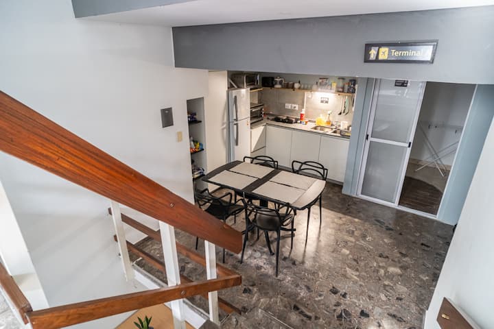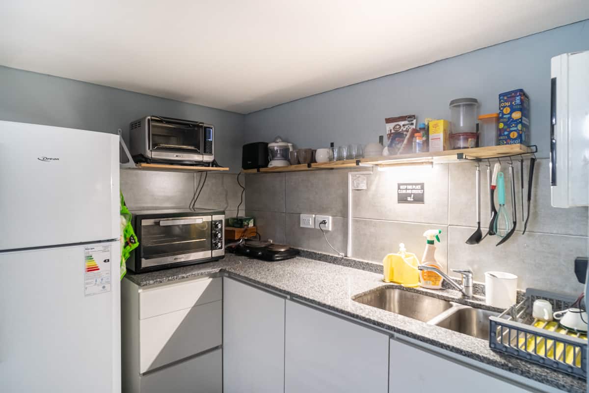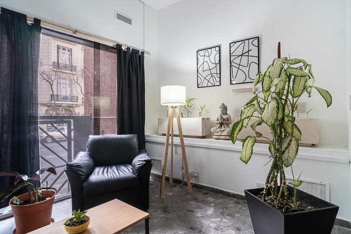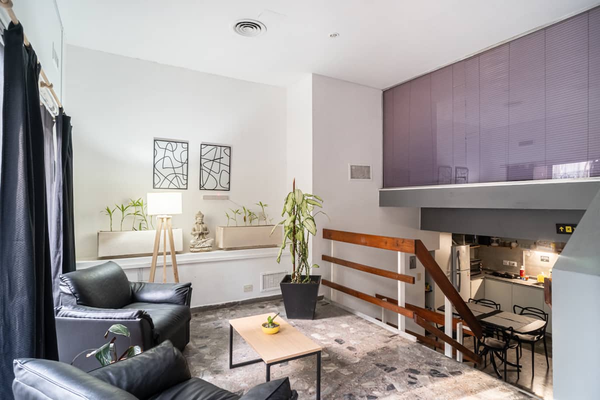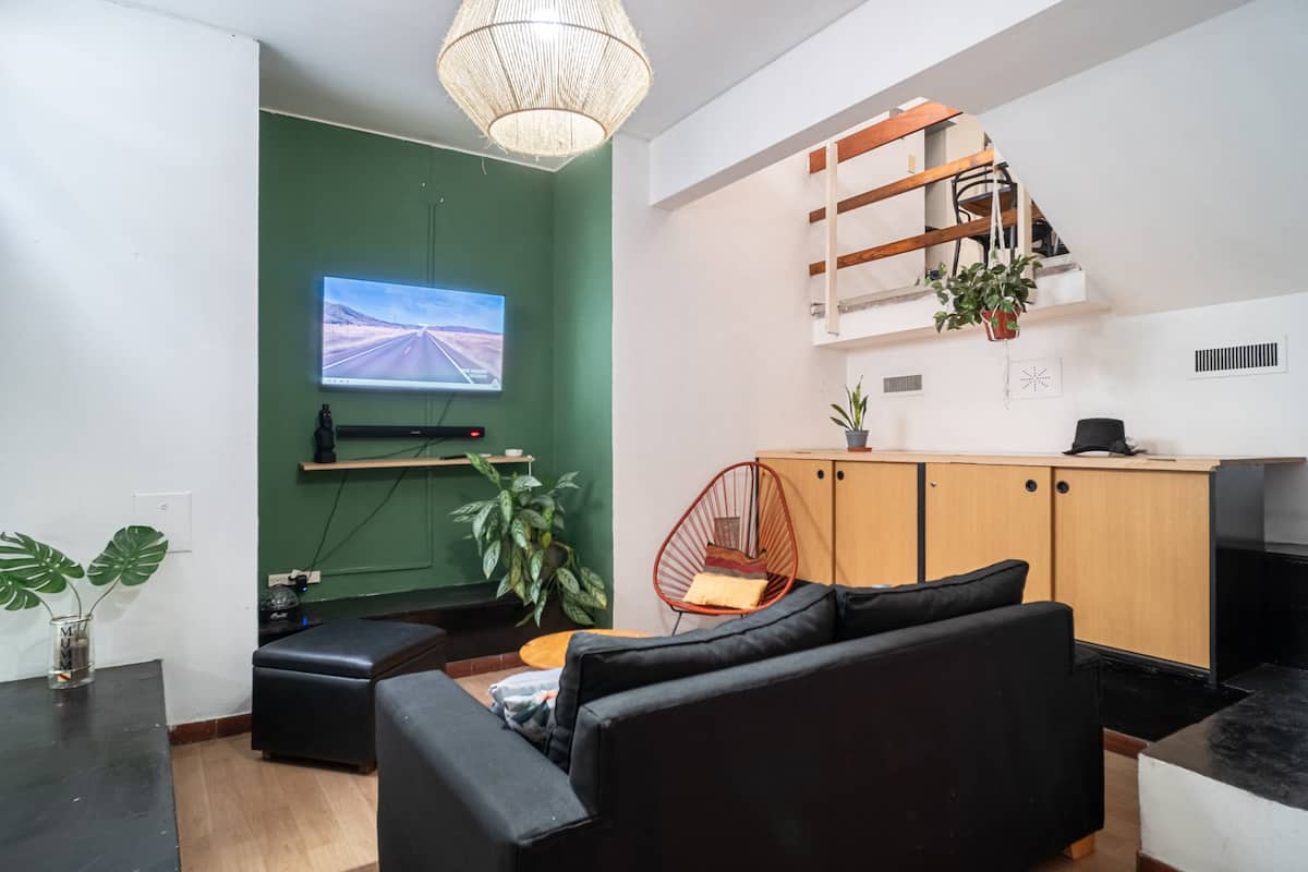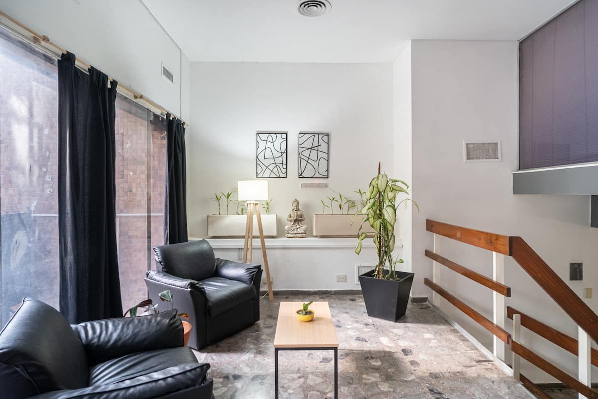 Quarto privativo com cama de casal (full) e áreas compartilhadas. Há 3 banheiros compartilhados, sala e cozinha compartilhada, além de área de estudo e Wi-Fi. A área de relaxamento tem ar-condicionado. Localização em San Telmo; estação de metrô da Linha C a 50 metros, Plaza de Mayo a 800 metros e Mercado de San Telmo a 400 metros.