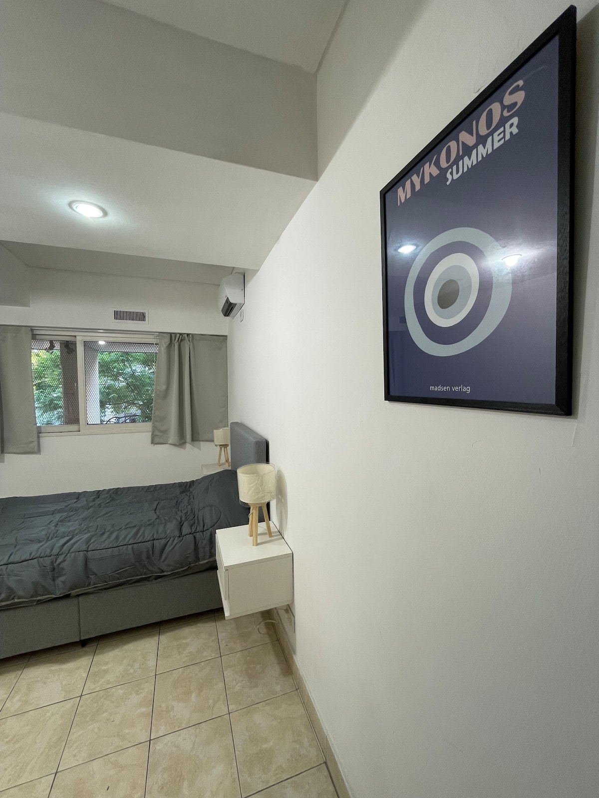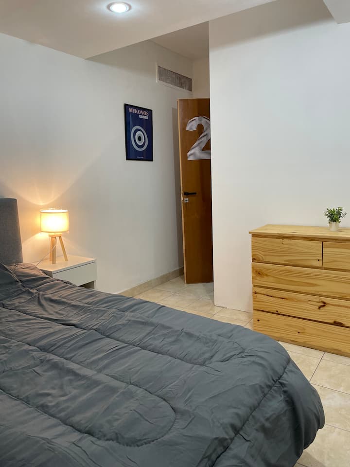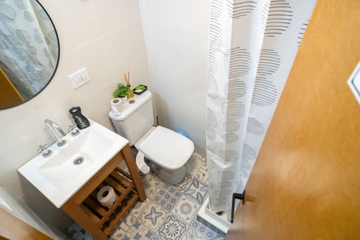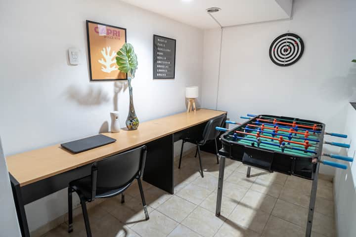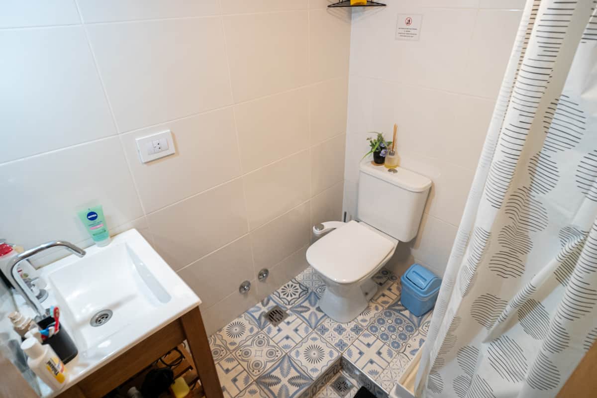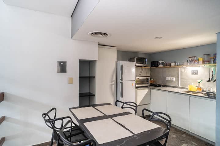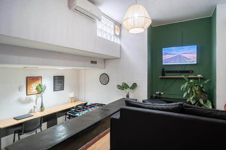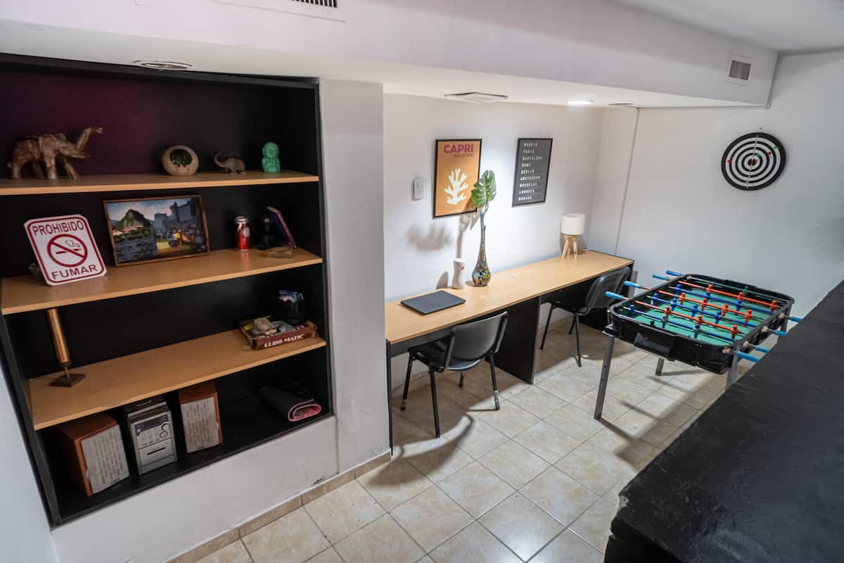 Quarto privativo com cama de casal (full) e áreas compartilhadas. Há 3 banheiros compartilhados, sala e cozinha compartilhada, além de área de estudo e Wi-Fi. A área de relaxamento tem ar-condicionado. Localização em San Telmo; estação de metrô da Linha C a 50 metros, Plaza de Mayo a 800 metros e Mercado de San Telmo a 400 metros.