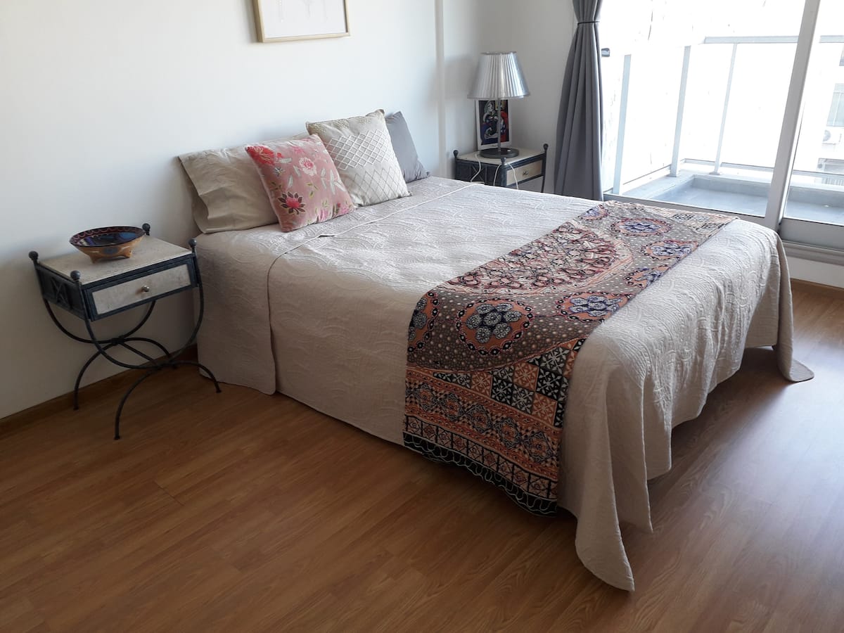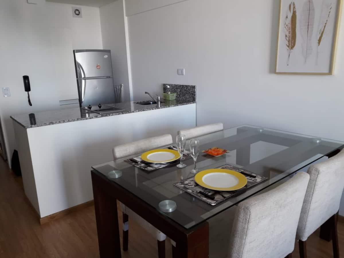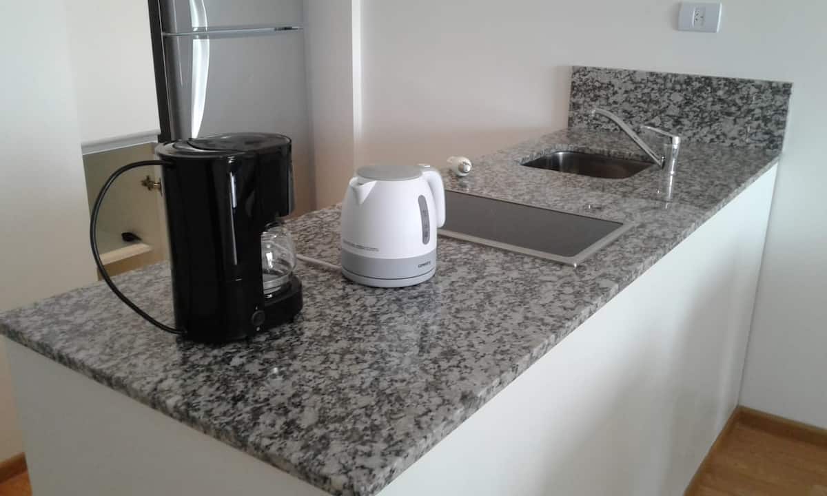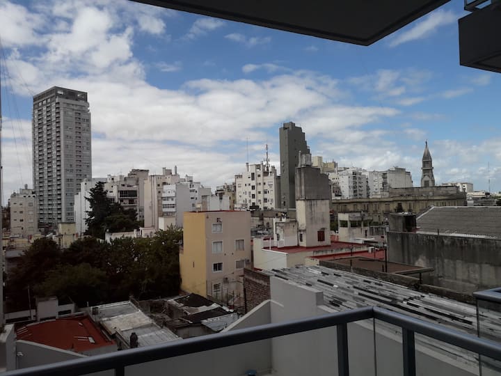 Apartamento de 35 m², novo (nunca habitado), no 5º andar. Totalmente equipado, com geladeira, micro-ondas, ar-condicionado, chaleira elétrica, ferro de passar roupa, TV com canais HD e acesso a Netflix e Wi-Fi. Há solarium com chuveiro e lavanderia com máquina de lavar e secadora. Segurança 24 horas. Fica a 150 metros da Subte Linha C, estação San Juan, e a quatro quadras do centro histórico de San Telmo.