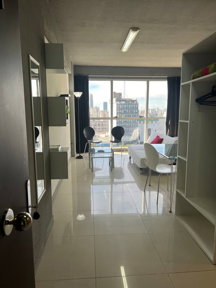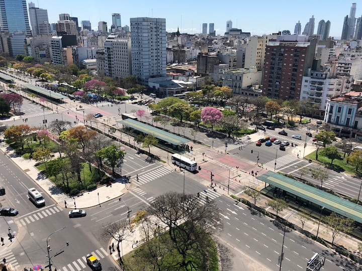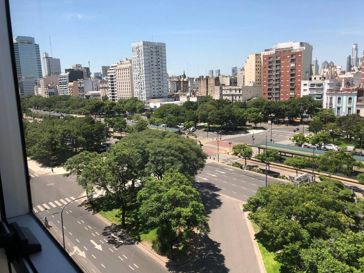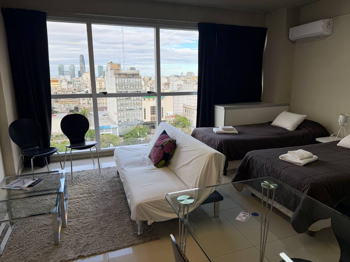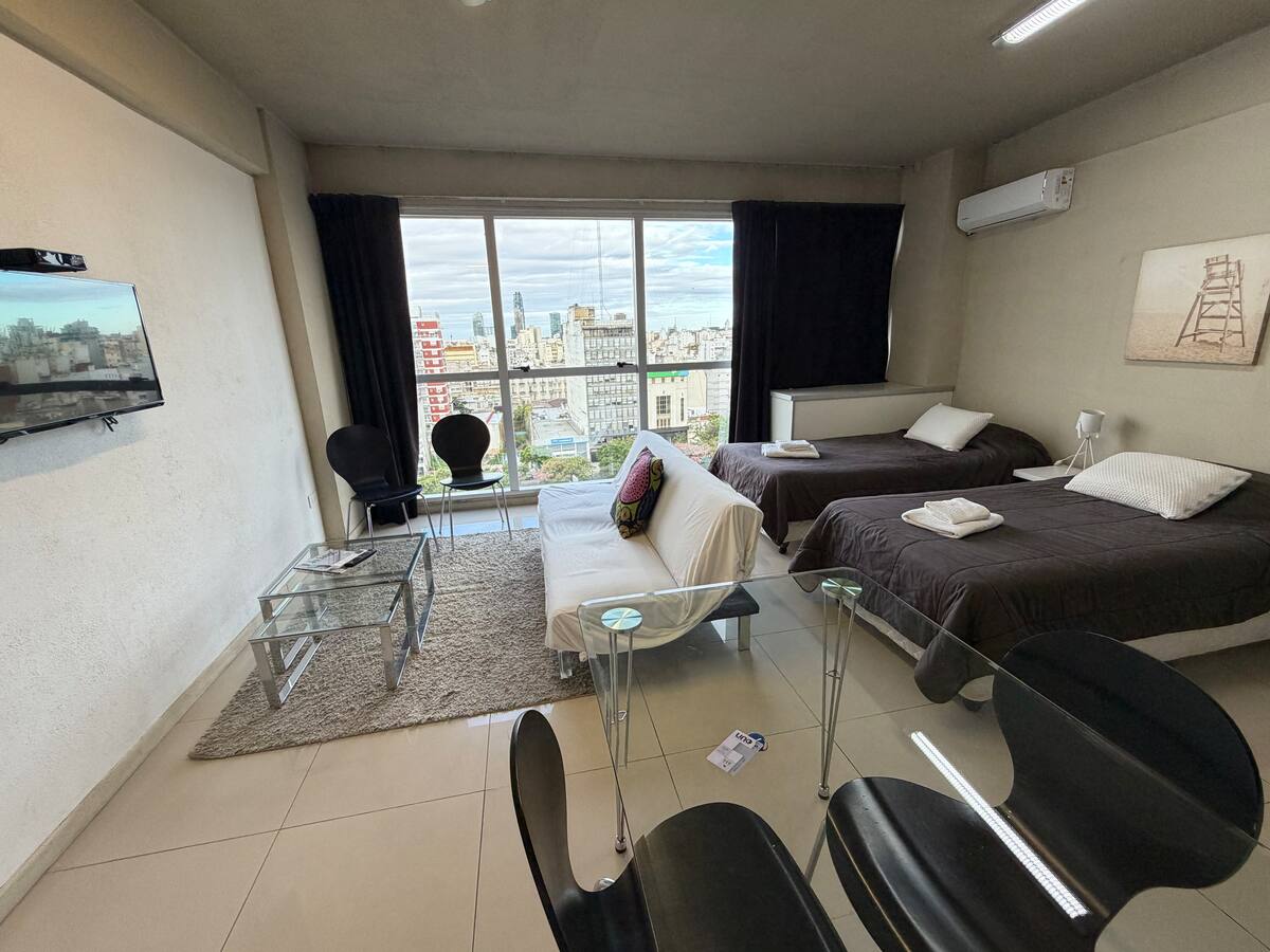 Apartamento com 35 m² em Constitución, a poucos passos de San Telmo e com vista aberta voltada para a Avenida 9 de Julio. O imóvel conta com ar-condicionado quente e frio, janelas amplas e piso de porcelanato. A cozinha é equipada com geladeira com freezer, anafe e utensílios completos de jantar. Na sala há mesa de vidro com 4 cadeiras e TV LED de 32" a cabo; no quarto há 1 single sommier com roupa de cama. O banheiro tem box com ducha e um conjunto de toalhas para a estadia.