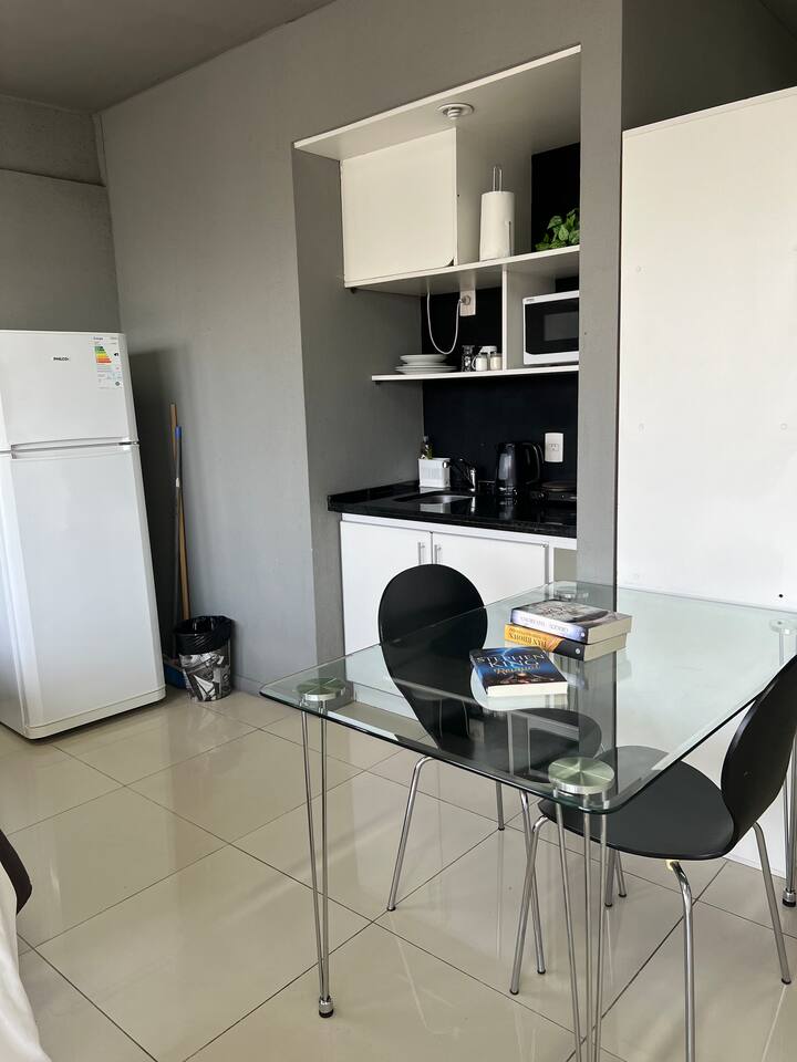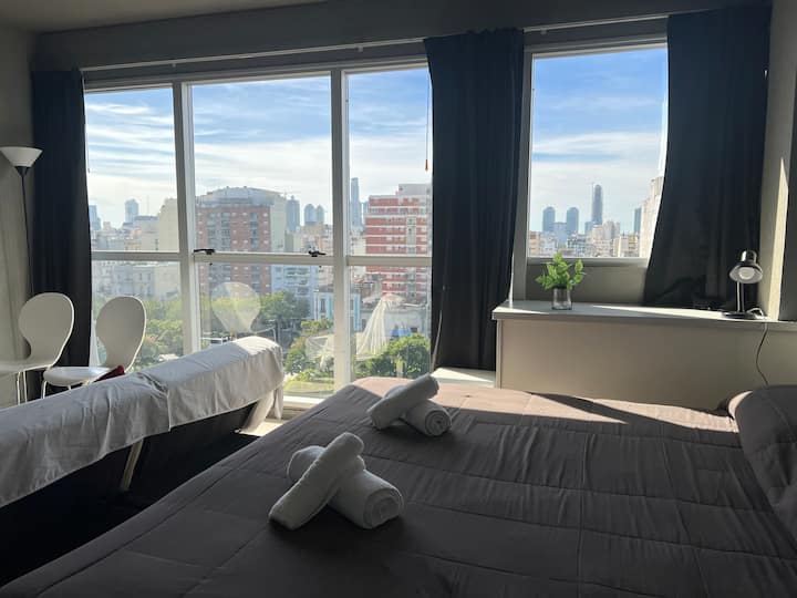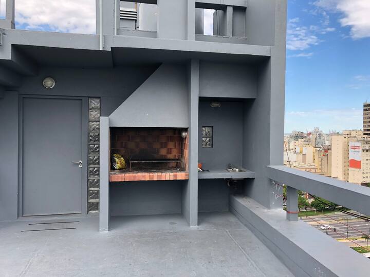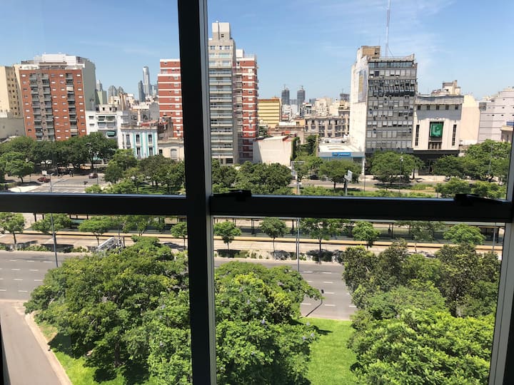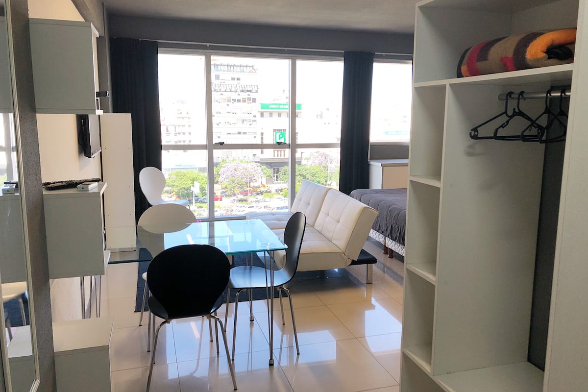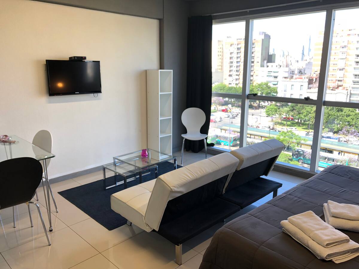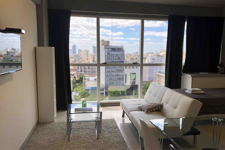 Apartamento com 35 m² em Constitución, a poucos passos de San Telmo e com vista aberta voltada para a Avenida 9 de Julio. O imóvel conta com ar-condicionado quente e frio, janelas amplas e piso de porcelanato. A cozinha é equipada com geladeira com freezer, anafe e utensílios completos de jantar. Na sala há mesa de vidro com 4 cadeiras e TV LED de 32" a cabo; no quarto há 1 single sommier com roupa de cama. O banheiro tem box com ducha e um conjunto de toalhas para a estadia.
