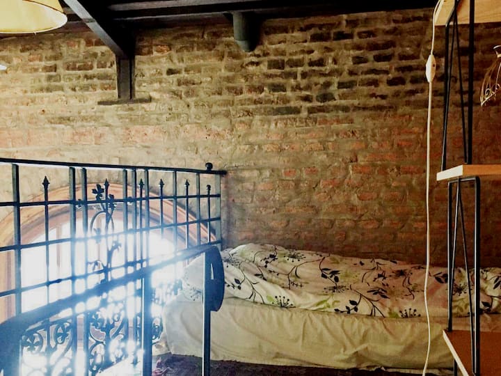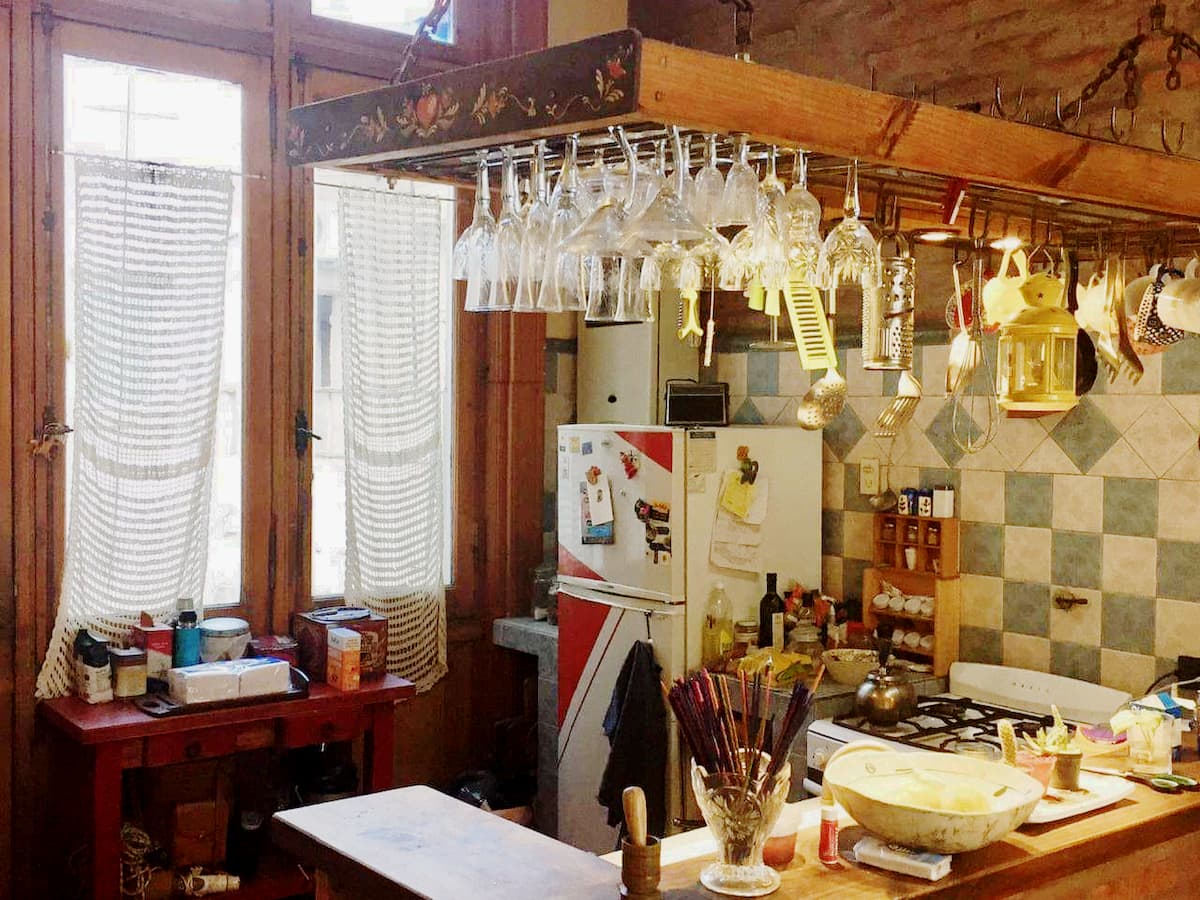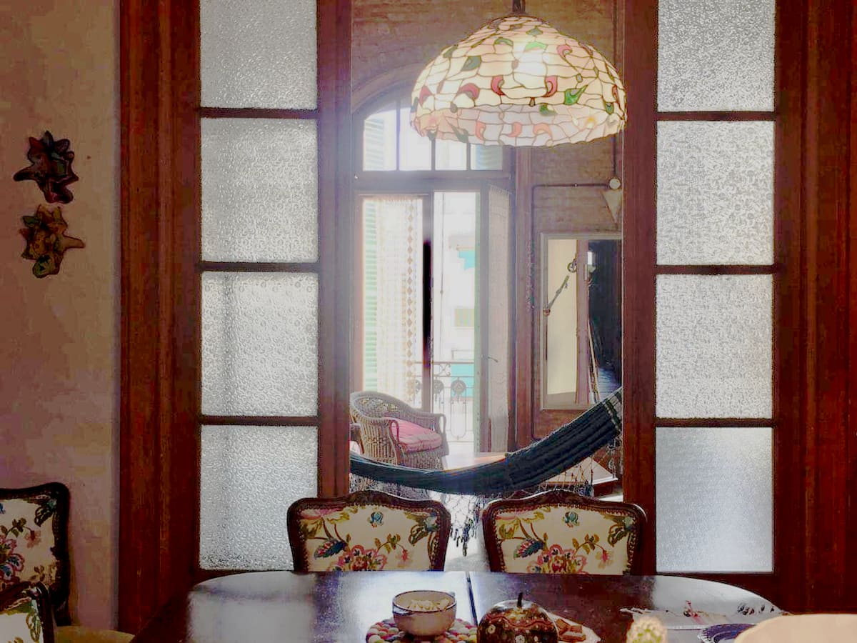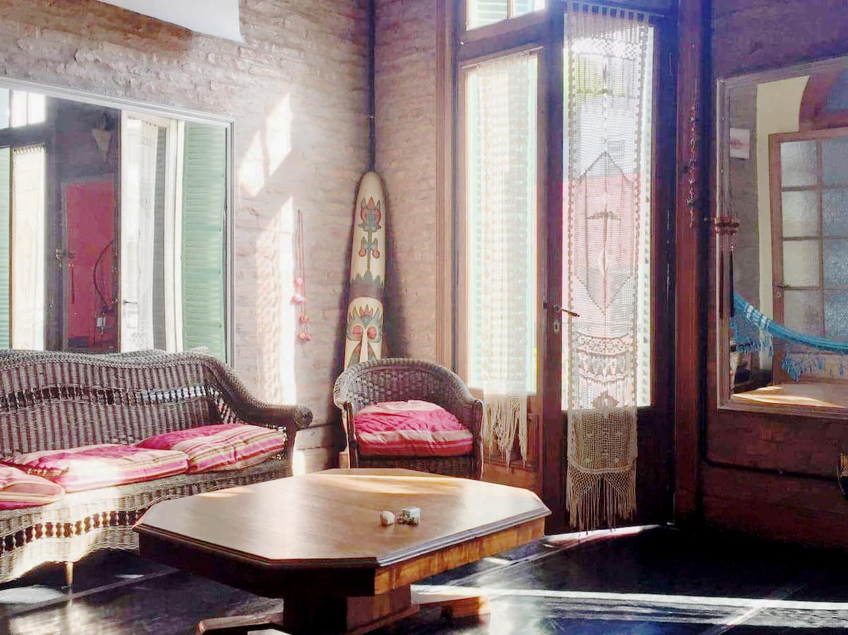 Quarto em apartamento amplo em San Telmo, com cama de casal (queen size). Banheiro compartilhado, Wi-Fi e acesso a terraço. O hóspede pode usar o restante do imóvel, exceto os outros quartos.