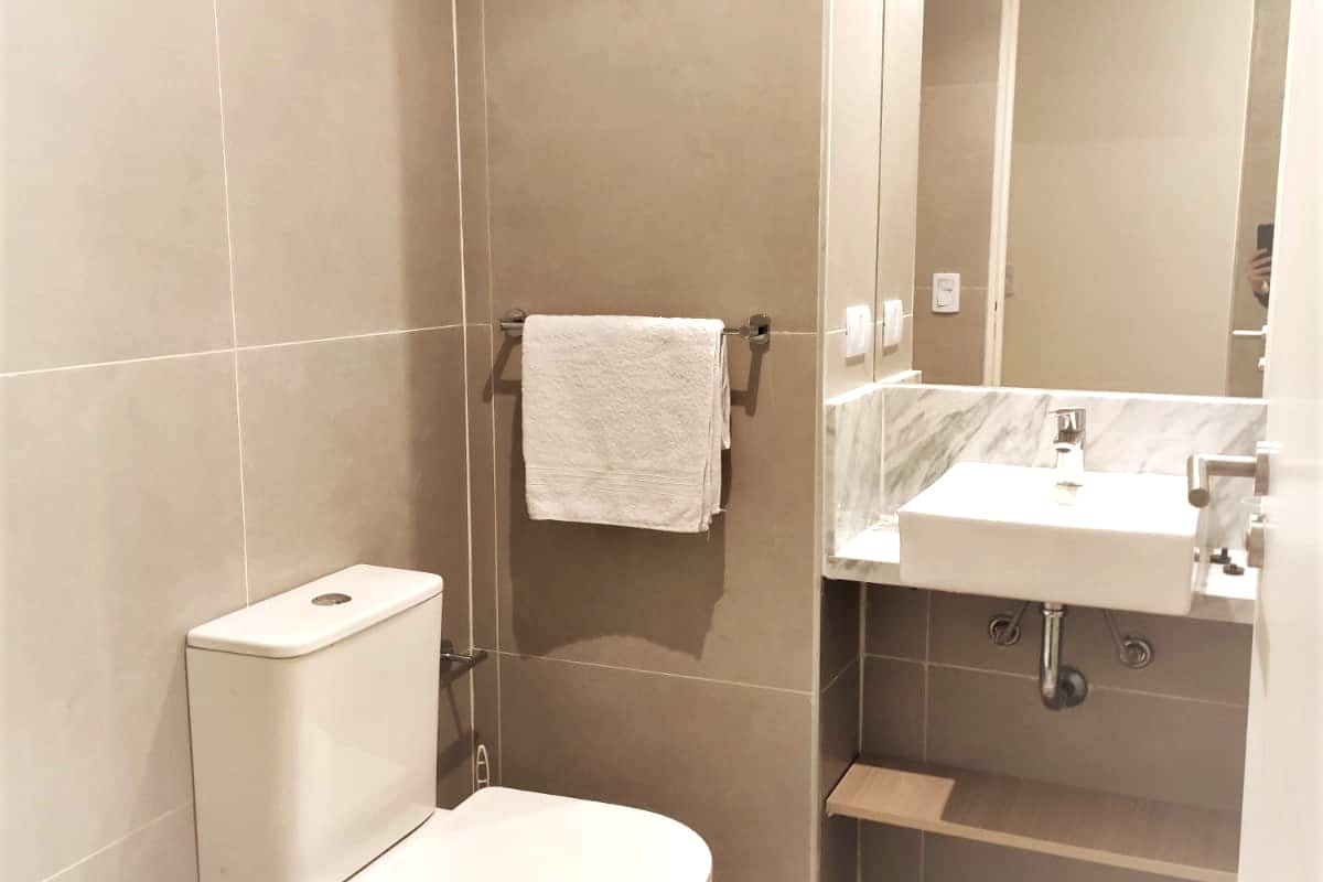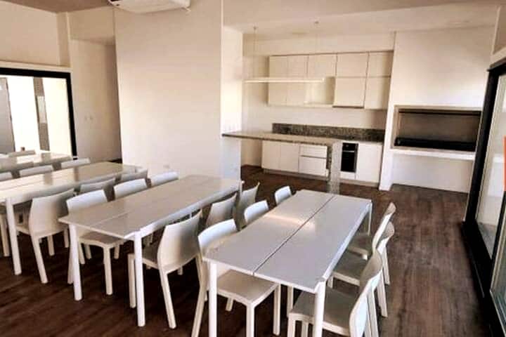 Apartamento em prédio de categoria, com 1 dormitório, equipado para até 2 pessoas, no andar alto. Há varanda com vista aberta da cidade, janelas com vidro duplo e ar-condicionado. Cozinha com geladeira grande com freezer, micro-ondas e forno elétrico, fogão cooktop cerâmico e exaustores; banheiro com exaustor. O prédio tem segurança 24 horas, lavanderia e, na área de cobertura, solário com churrasqueira, chuveiros e espaço multiuso com área fechada e mesas; fora da área fechada há duas zonas com