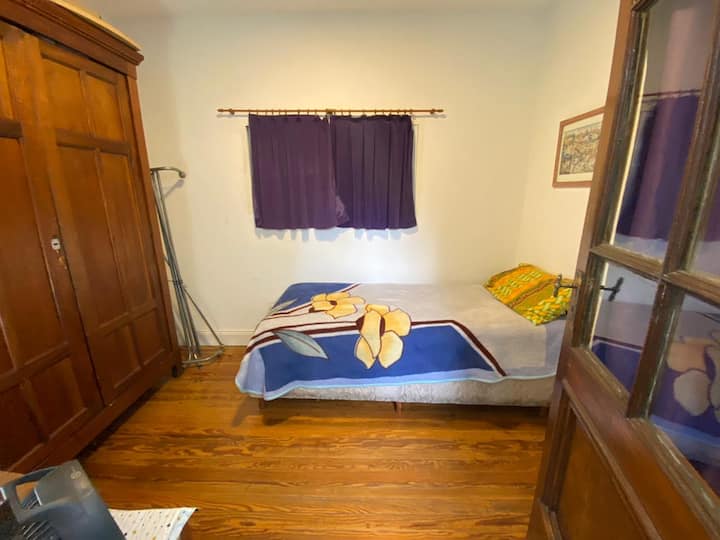Quarto individual para 1 pessoa em acomodação compartilhada no centro de Buenos Aires. O ambiente inclui cama de solteiro, armário, cortinas blackout e caloventor. Há sala de jantar com mesa, cadeiras, poltrona, TV e fogão, cozinha completa com forno, geladeira com freezer e micro-ondas, banheiro completo, pátio central e terraço com área de churrasco. O anúncio indica 700 m da Facultad de Ciencias Sociales, 850 m da Fundação Favaloro e 3,4 km de Puerto Madero, além de linhas de ônibus 12, 37, 1