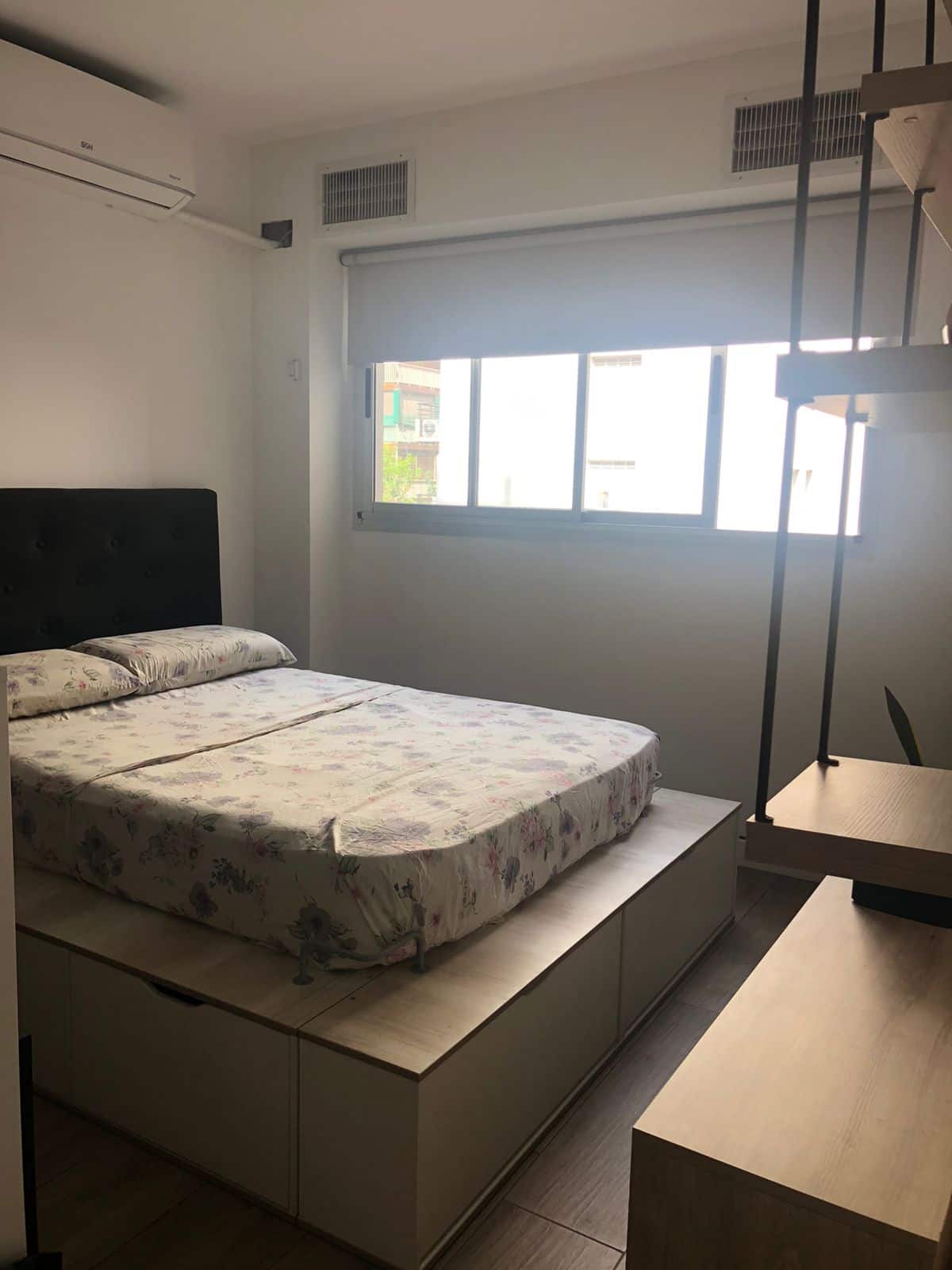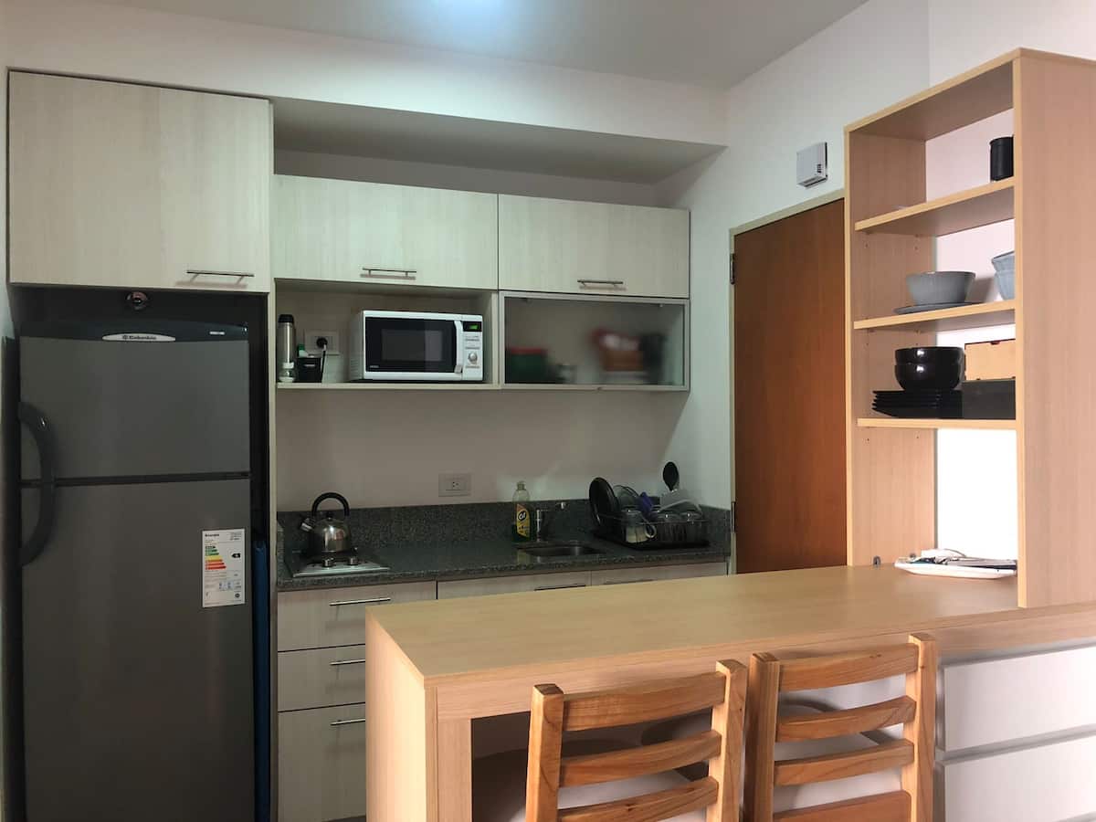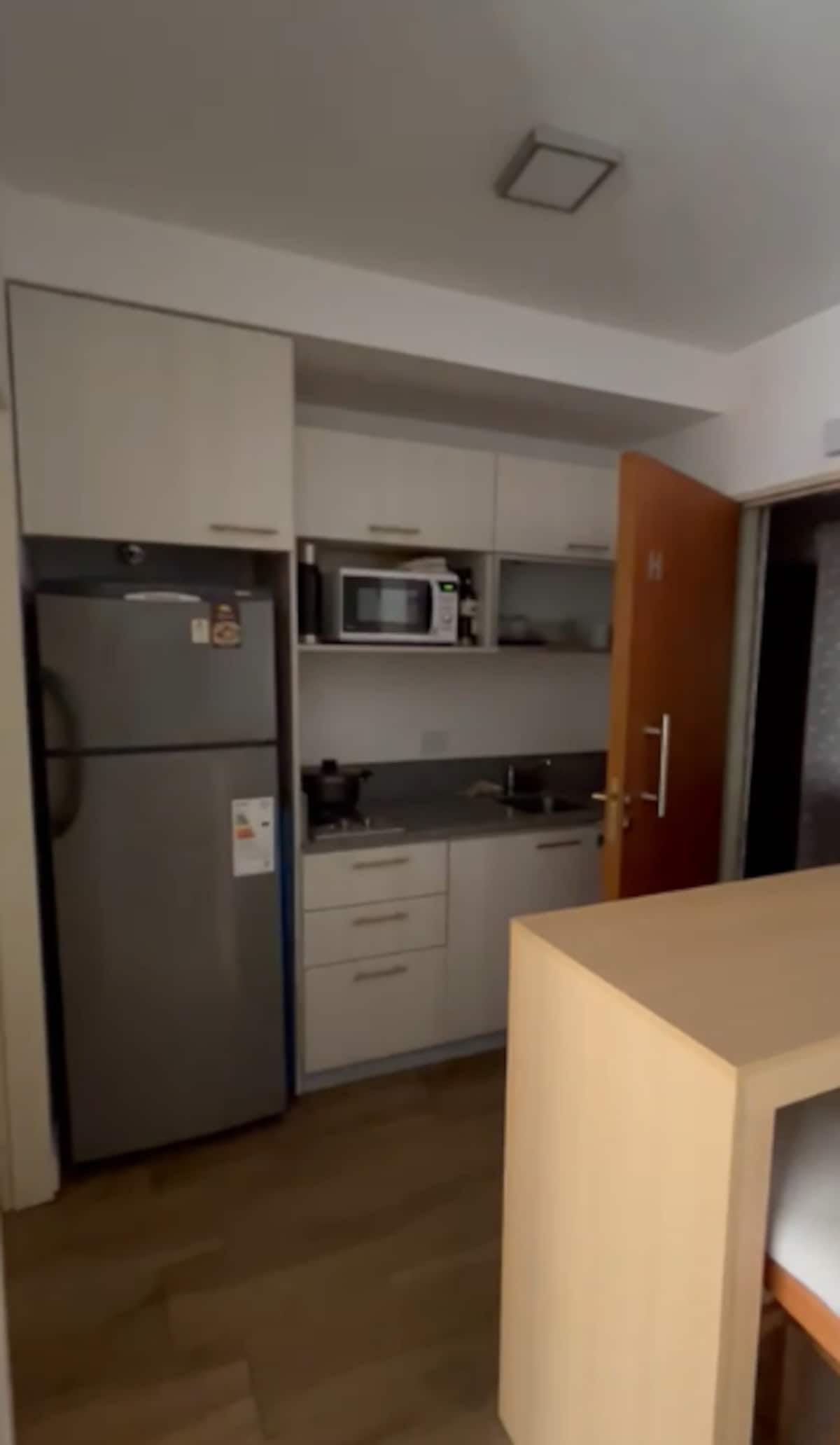 Apartamento em Flores com 1 dormitório, mobiliado, com cozinha totalmente equipada e ar-condicionado. A cozinha tem fogão duplo, geladeira com freezer, steamer, micro-ondas e utensílios; há TV LED e armário com espelho e closet, além de cama de casal e prateleiras. O banheiro se conecta à cozinha por um pequeno corredor. O condomínio inclui piscina, área de churrasco e acesso à lavanderia.