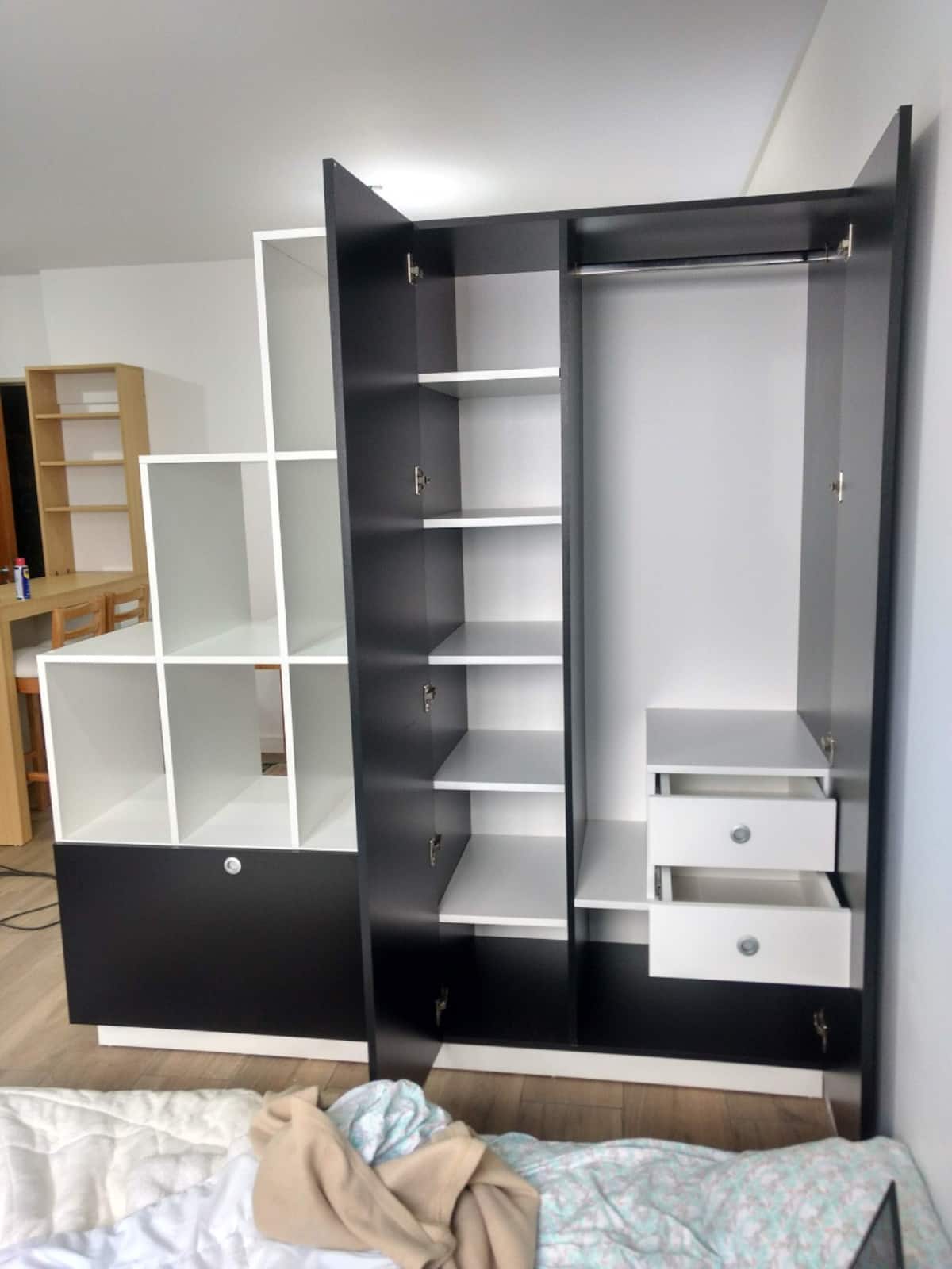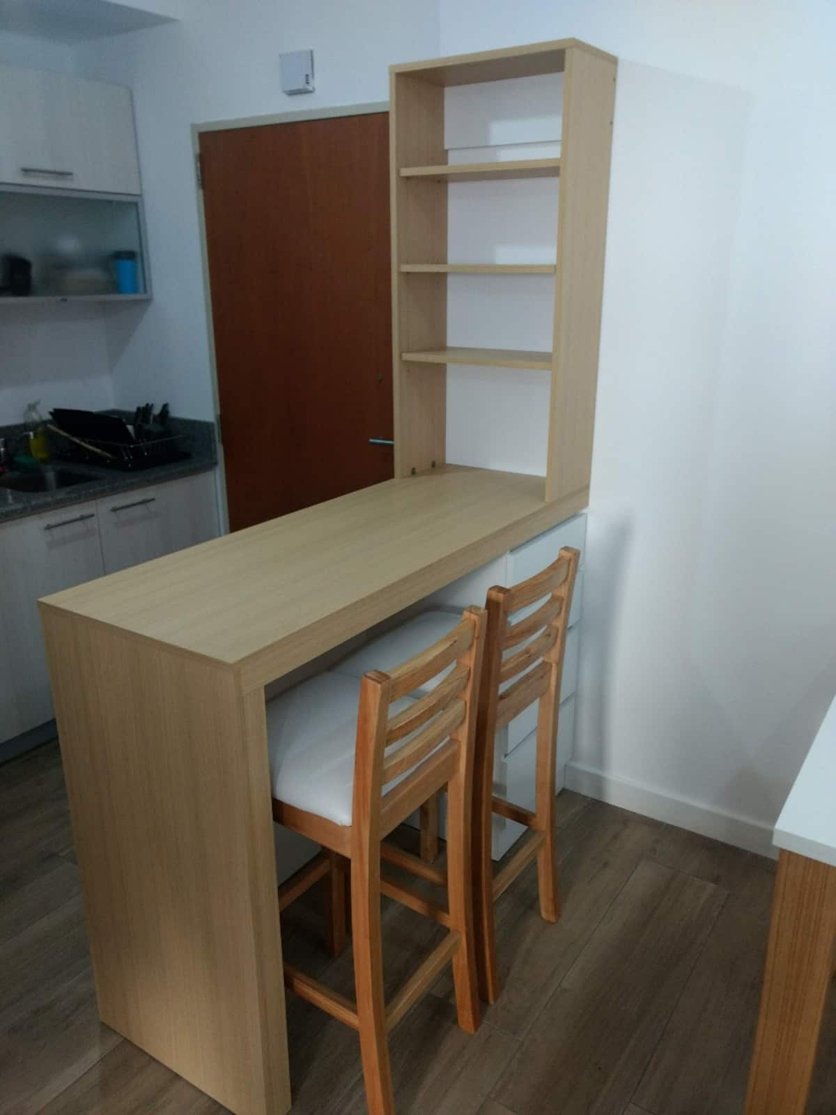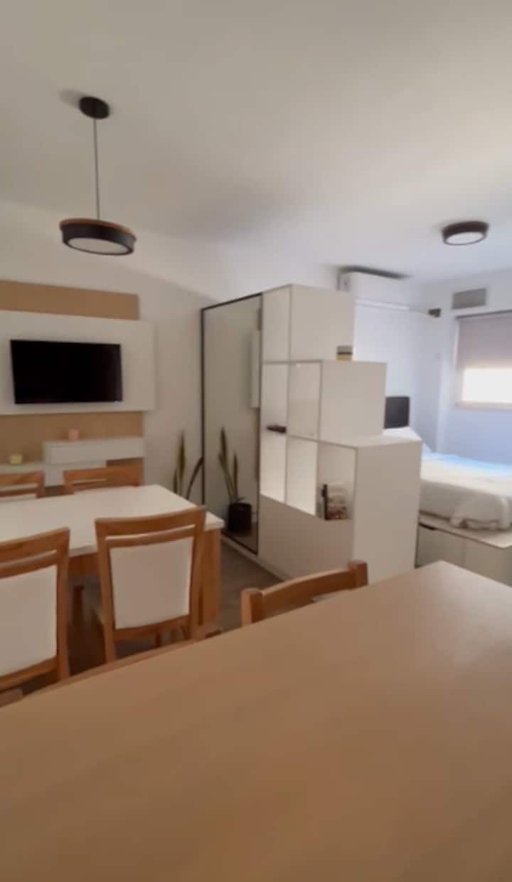 Apartamento em Flores com 1 dormitório, mobiliado, com cozinha totalmente equipada e ar-condicionado. A cozinha tem fogão duplo, geladeira com freezer, steamer, micro-ondas e utensílios; há TV LED e armário com espelho e closet, além de cama de casal e prateleiras. O banheiro se conecta à cozinha por um pequeno corredor. O condomínio inclui piscina, área de churrasco e acesso à lavanderia.