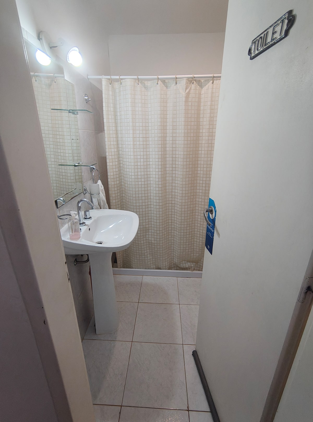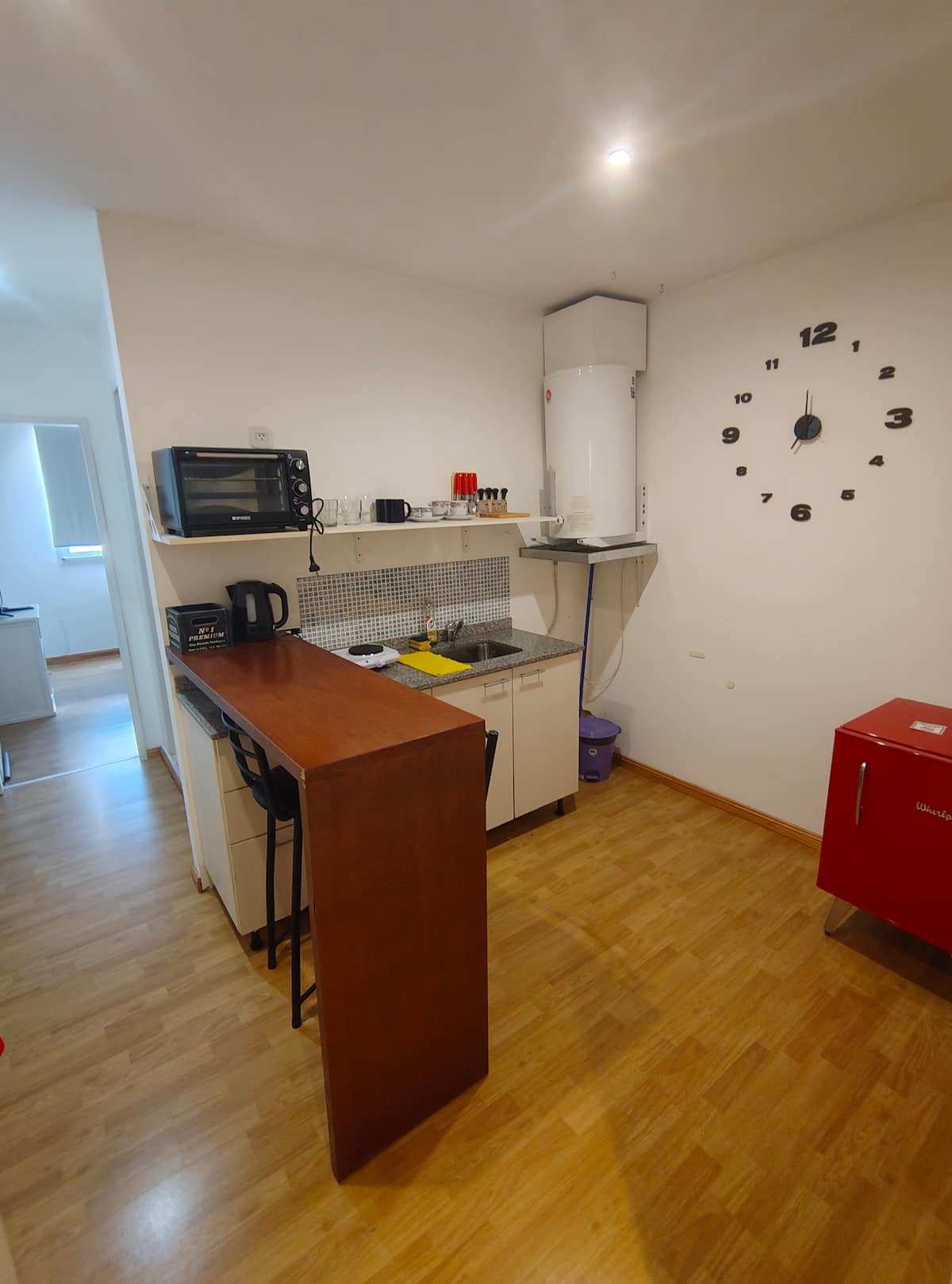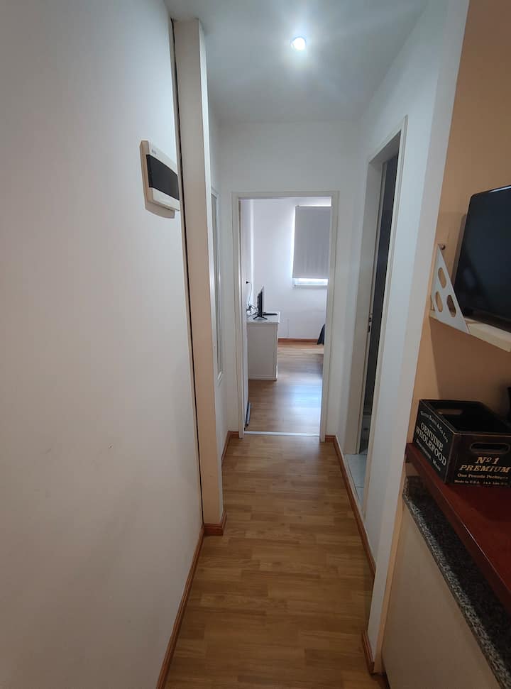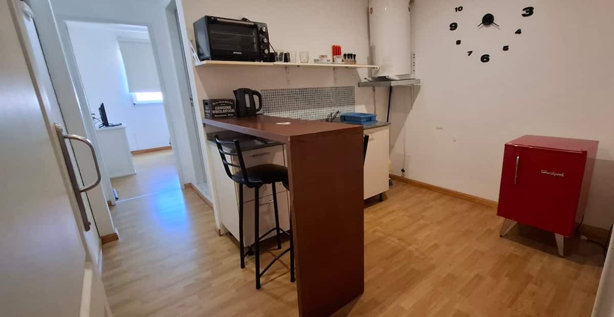 Kitnet dividida com 1 quarto e sala, em andar térreo acessado por escadas. Fica a poucos metros da estação.