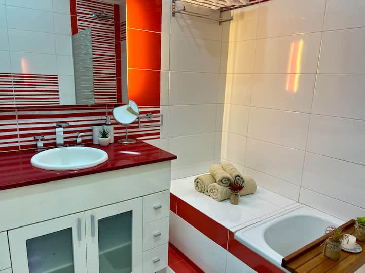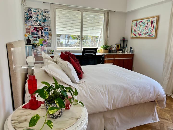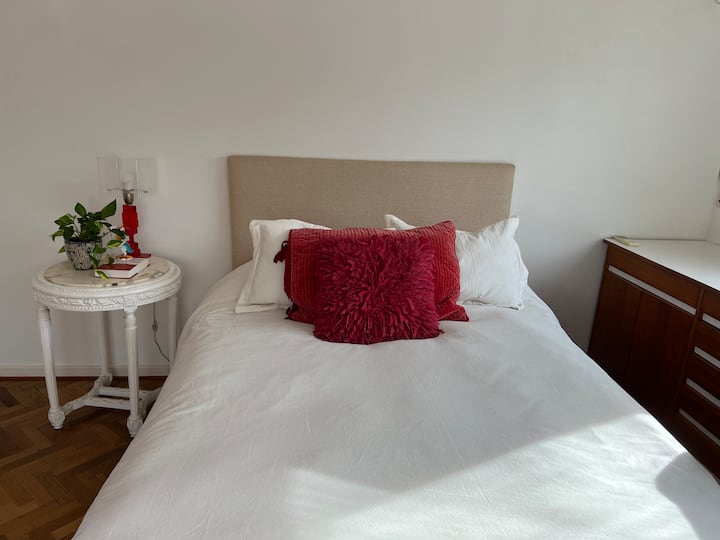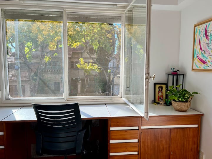 Quarto em casa, com banheiro privativo, no bairro Florida. O quarto fica no 2º andar, ao lado do quarto e do banheiro de outras pessoas, no mesmo corredor. Em estadias mais longas, há acesso à cozinha e ao jardim.