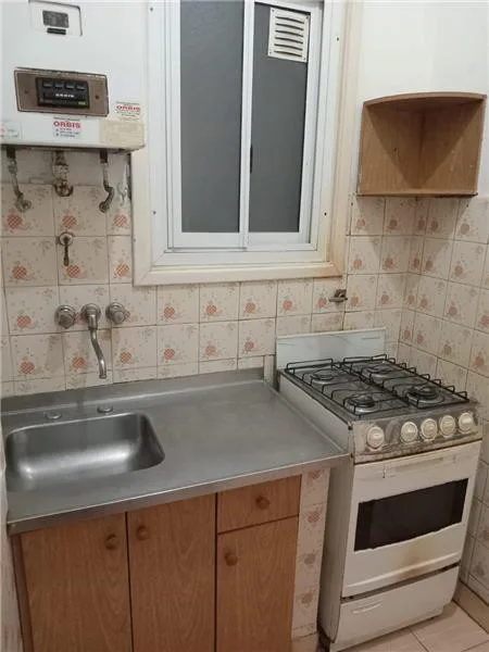Apartamento de 2 ambientes com 32 m² de área total de uso próprio, no primeiro andar, voltado para o interior. O ambiente principal tem estufa a tiro balanceado e o dormitório inclui amplo armário. Há banheiro completo com box e ducha, cozinha com móveis sob a bancada e armários aéreos, com fogão de 4 bocas e forno; a água quente é por calefón. Não há conexão para máquina de lavar. O prédio indica categoria “BUENA” e há escoamento cloacal e pavimento.