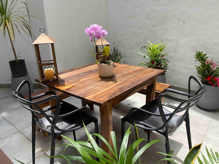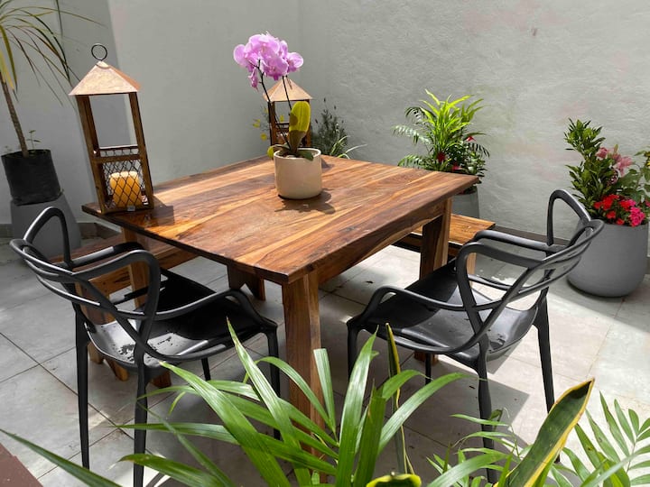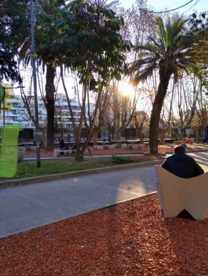 Apartamento em Florida, Vicente López, no térreo (PB), com 1 quarto e pátio. Descrito como mobiliado e equipado. O imóvel fica a cerca de 4 a 5 minutos da estação Mitre e tem acesso a transportes por trem e ônibus. A disponibilidade de vaga de garagem é informada como opcional.