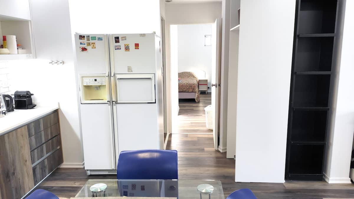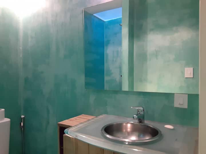 Apartamento reformado, de 2 ambientes, na frente, com duas varandas, uma em cada ambiente. Cada ambiente tem cozinha completa e 1 banheiro completo. Há ar-condicionado frio e quente em todo o apartamento, pisos alemães, persianas elétricas e iluminação em LED.