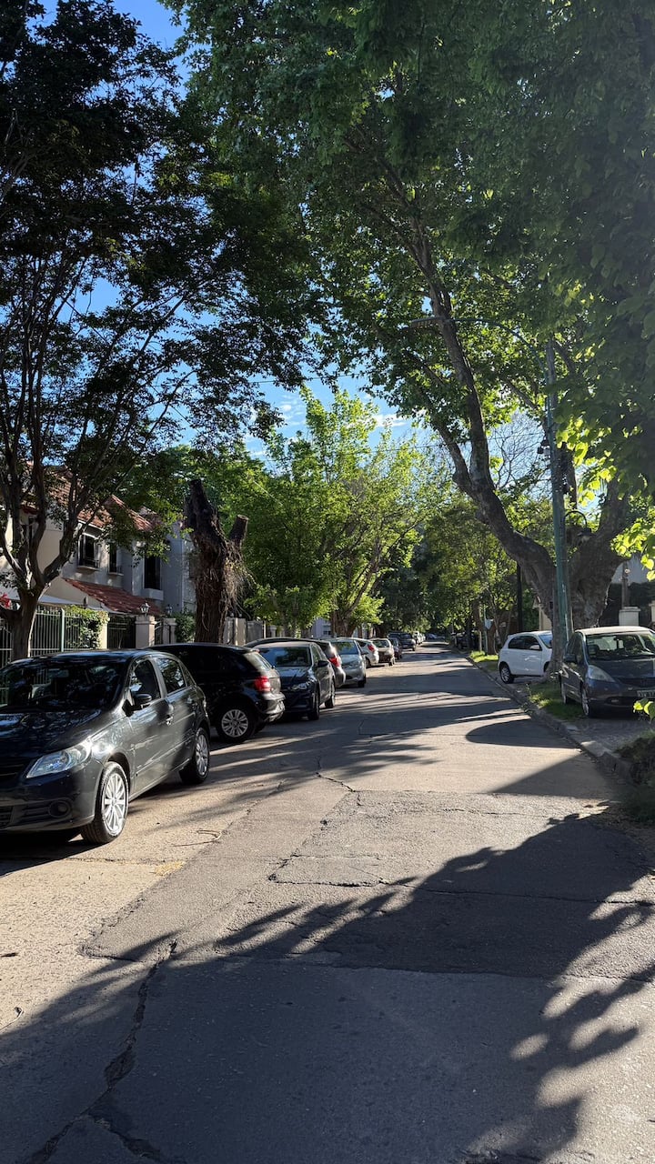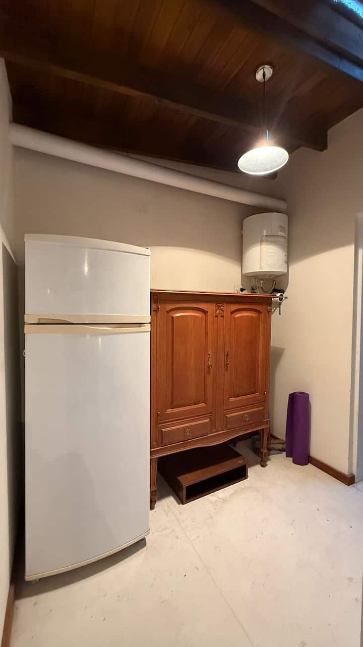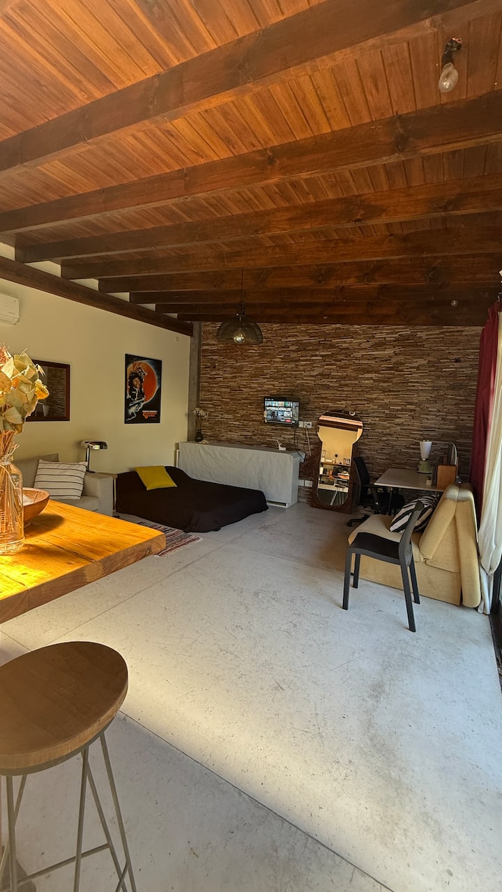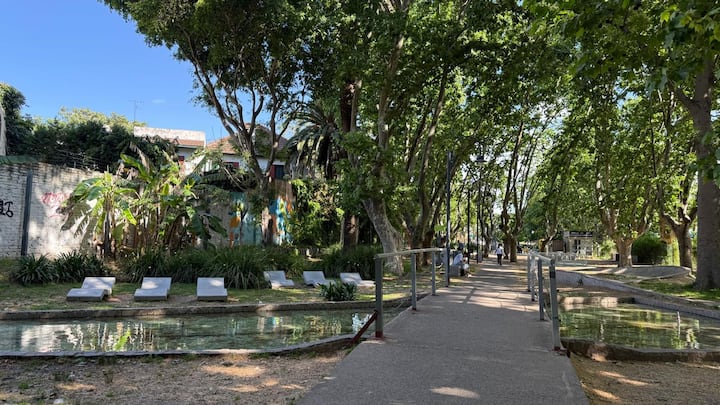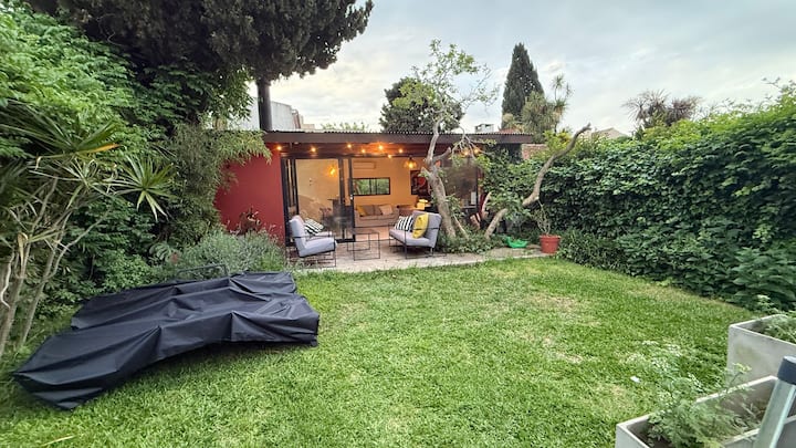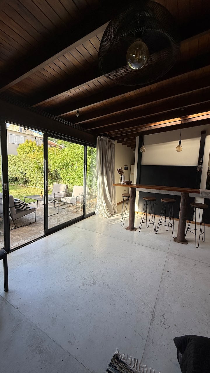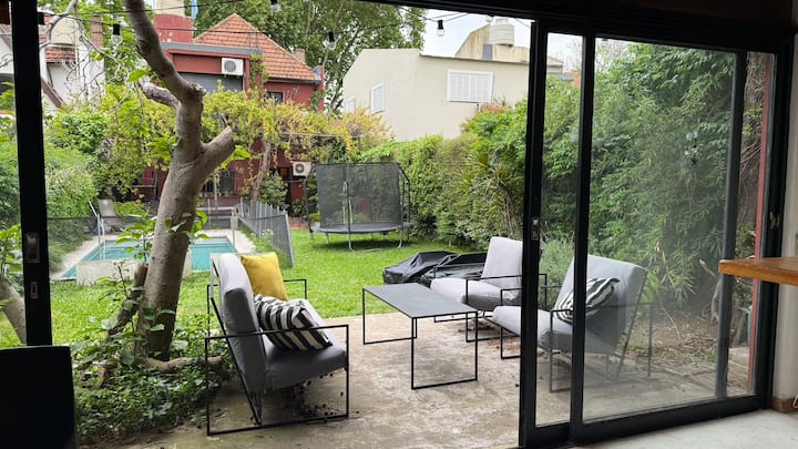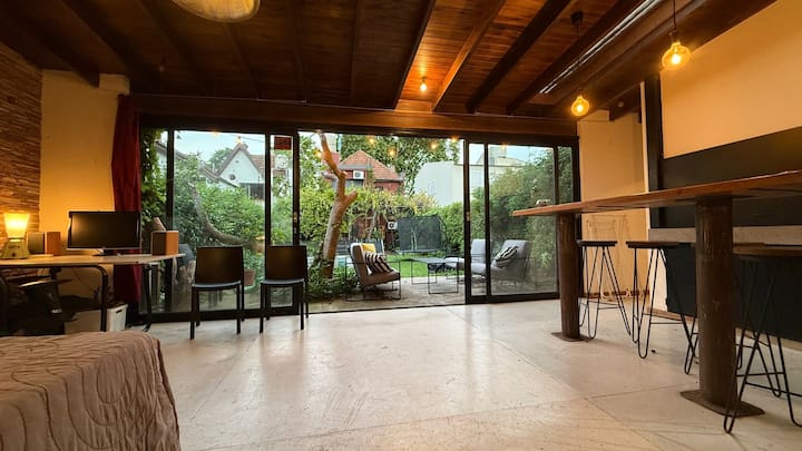 Loft em área de jardim com árvores, com banheiro e cozinha privativos, e acesso a piscina compartilhada. O espaço inclui Wi-Fi, geladeira, guarda-roupa, área de lounge e TV, além de ar-condicionado e aquecimento. Há bicicletas e área com churrasqueira; a localização fica em Florida, Vicente López, a poucos minutos da região do Metrobus e do trem, com acesso ao rio a poucos quarteirões.