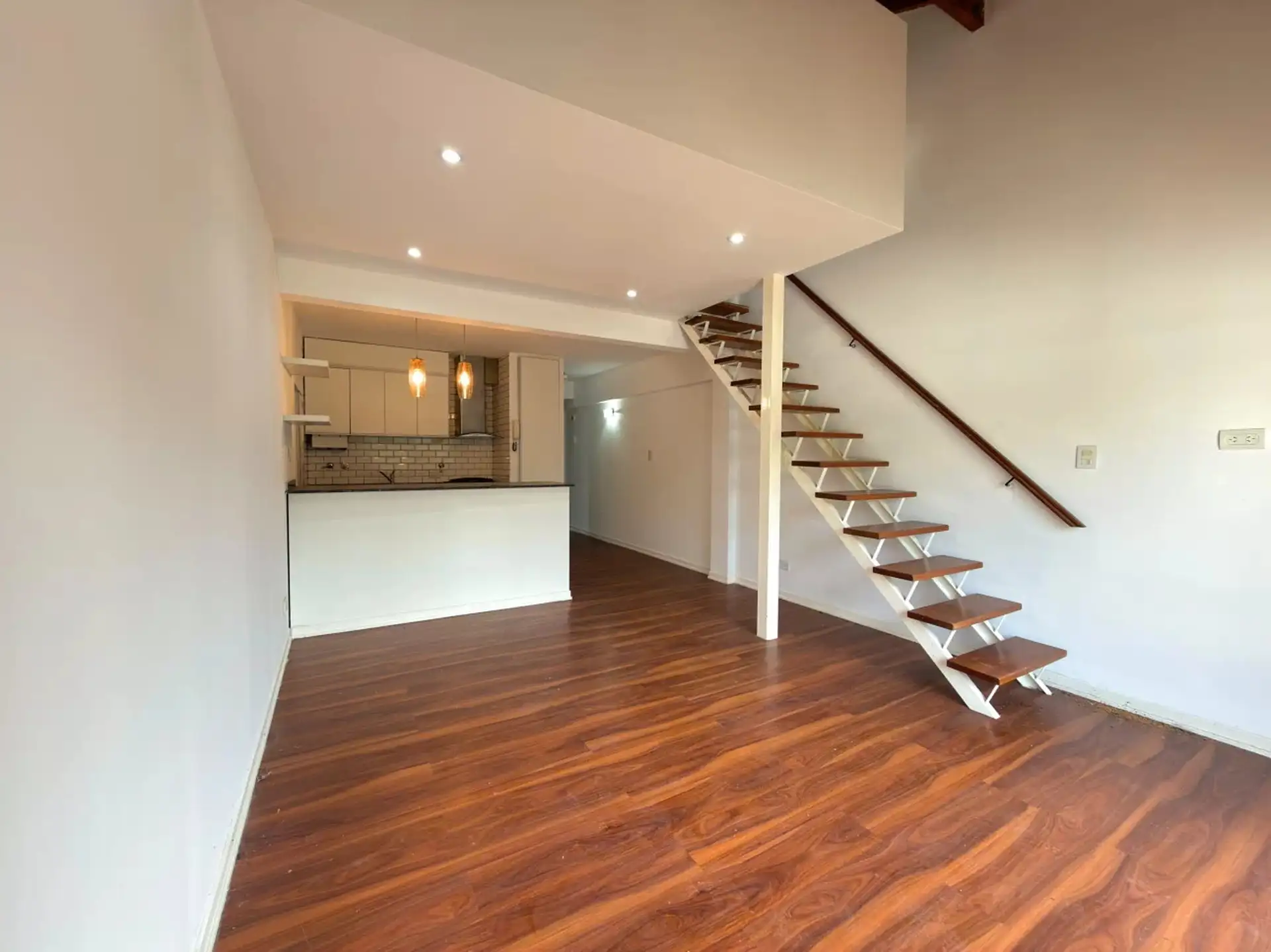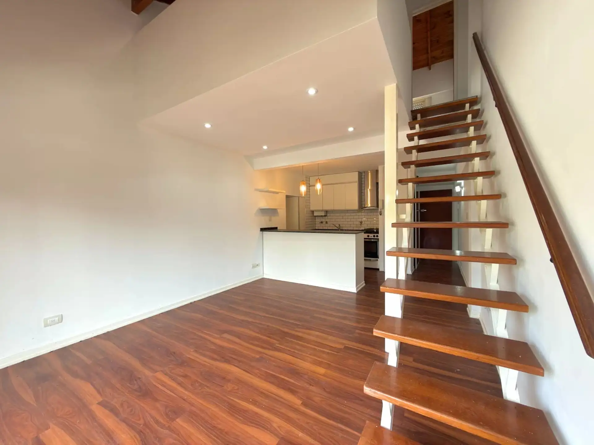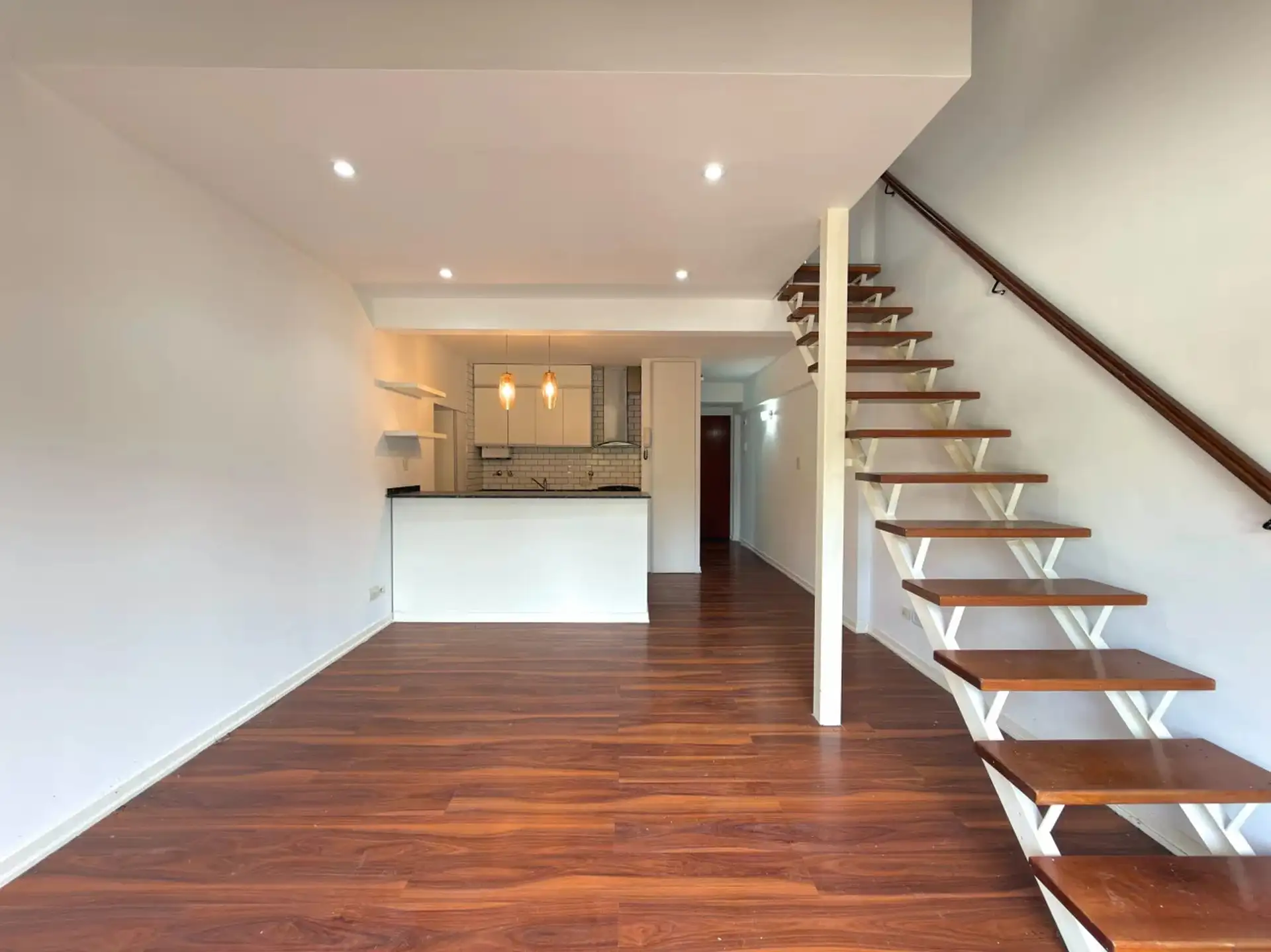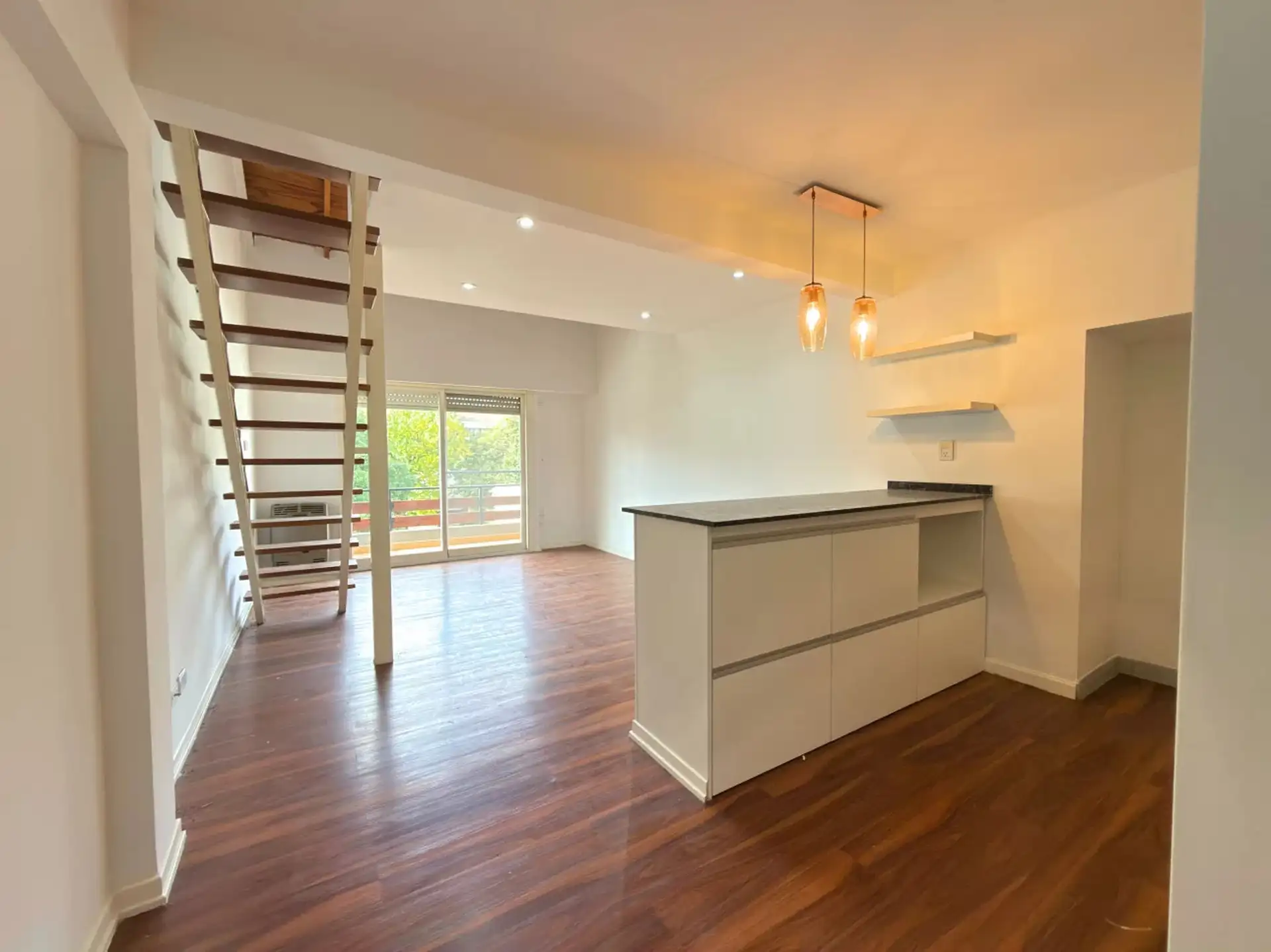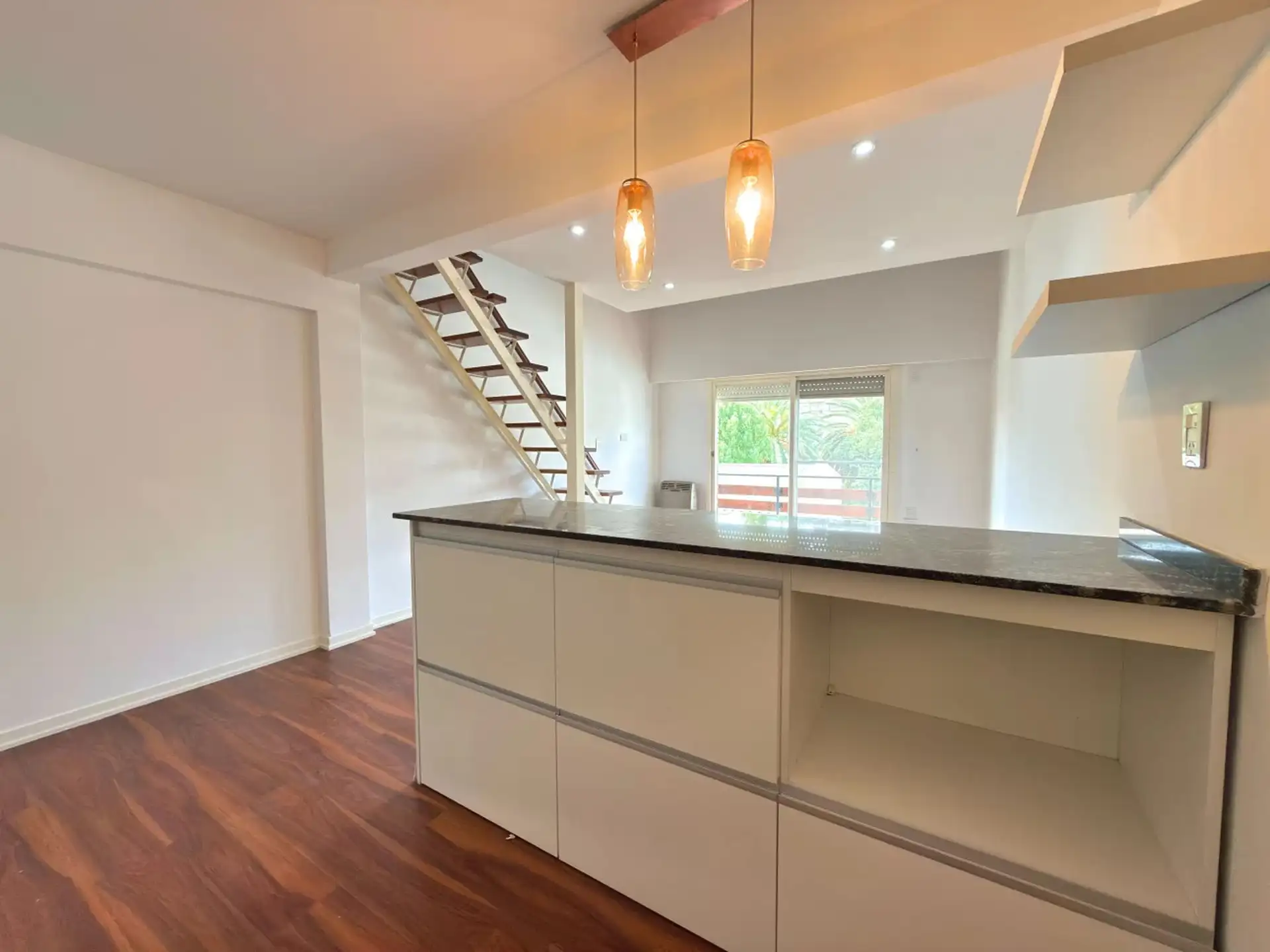 Apartamento duplex de 3 ambientes com varanda, pátio e área de lavanderia, no 2º andar acessível por escada. Conta com cozinha integrada ao living e jantar, equipada com fogão a gás e exaustor, além de balcão para café da manhã e armários inferiores e superiores. Há 1 banheiro completo. No pavimento superior, oferece 1 quarto com armário e um segundo espaço que pode ser usado como quarto ou escritório, com pátio e área de lavanderia com bancada e conexão.
