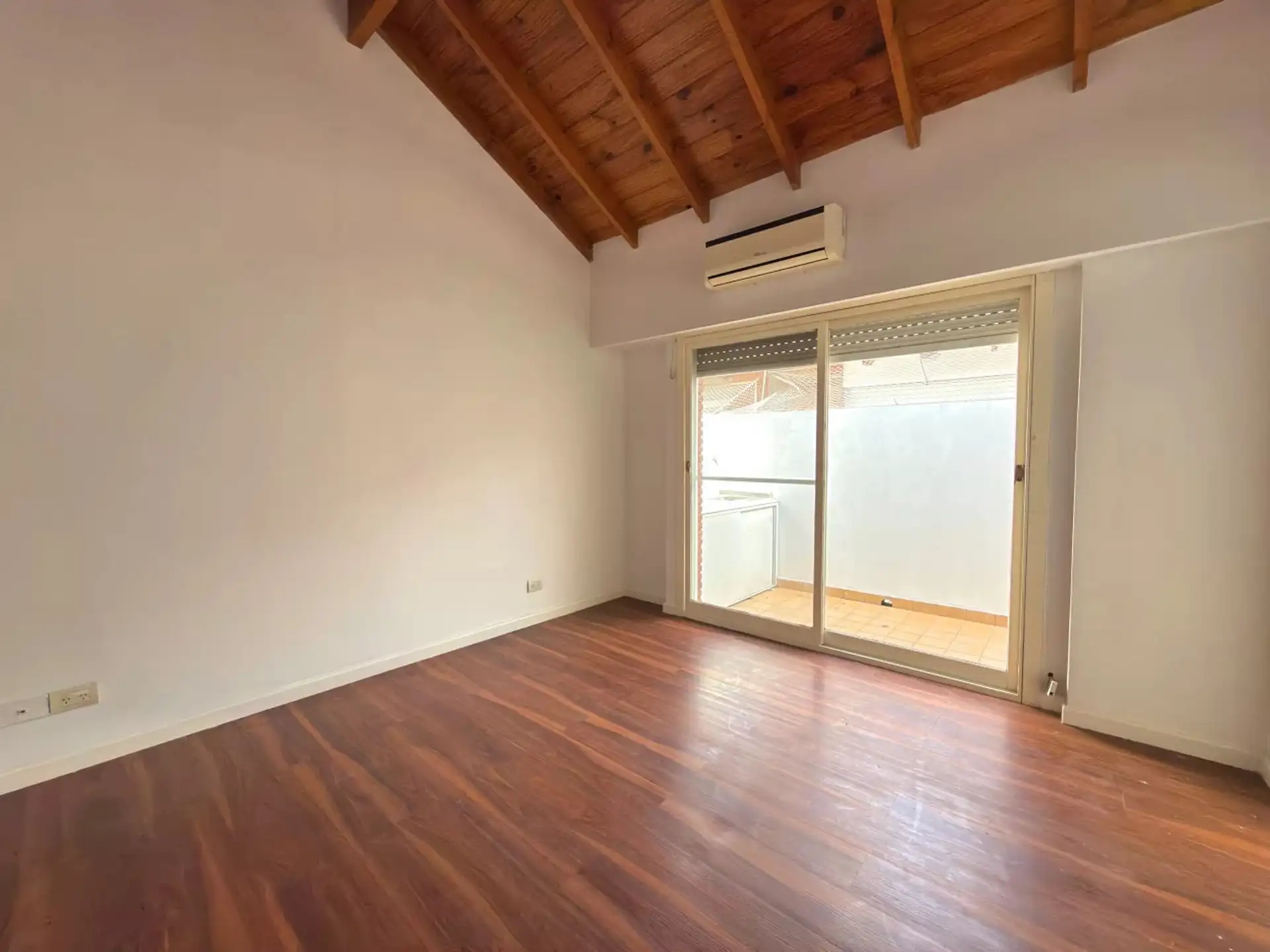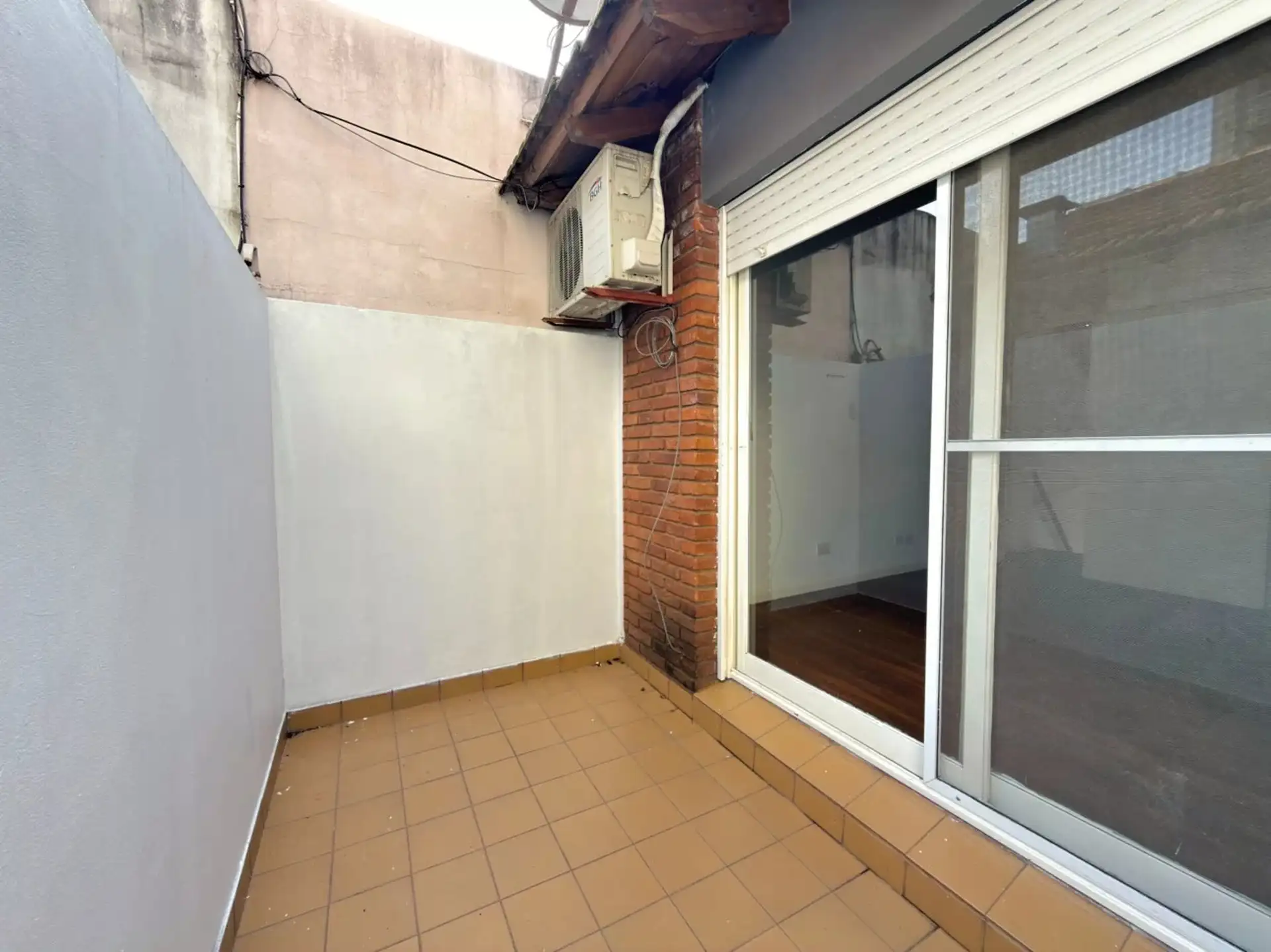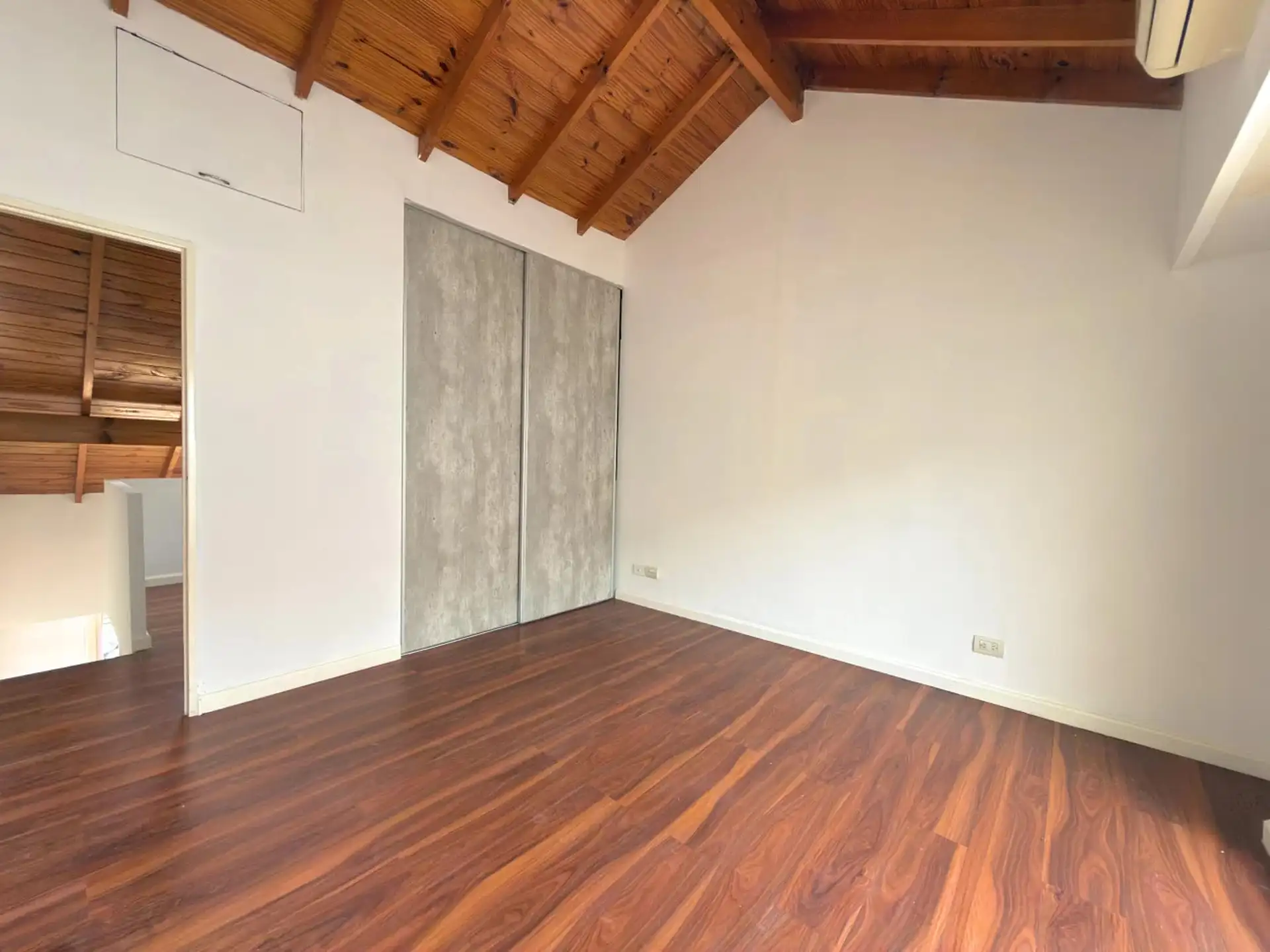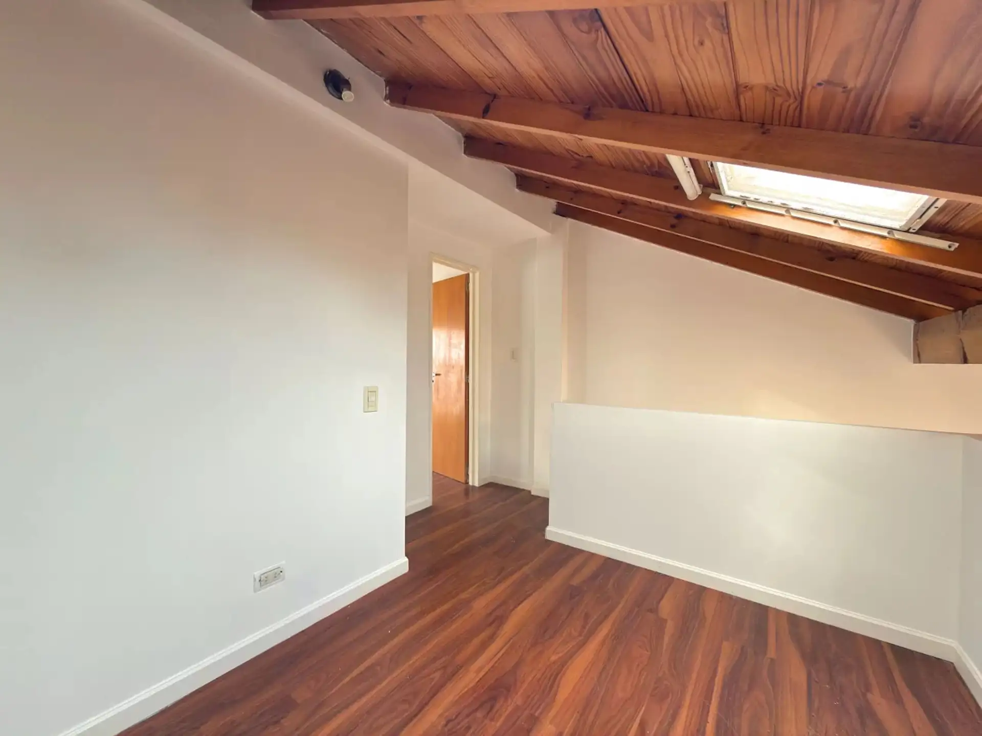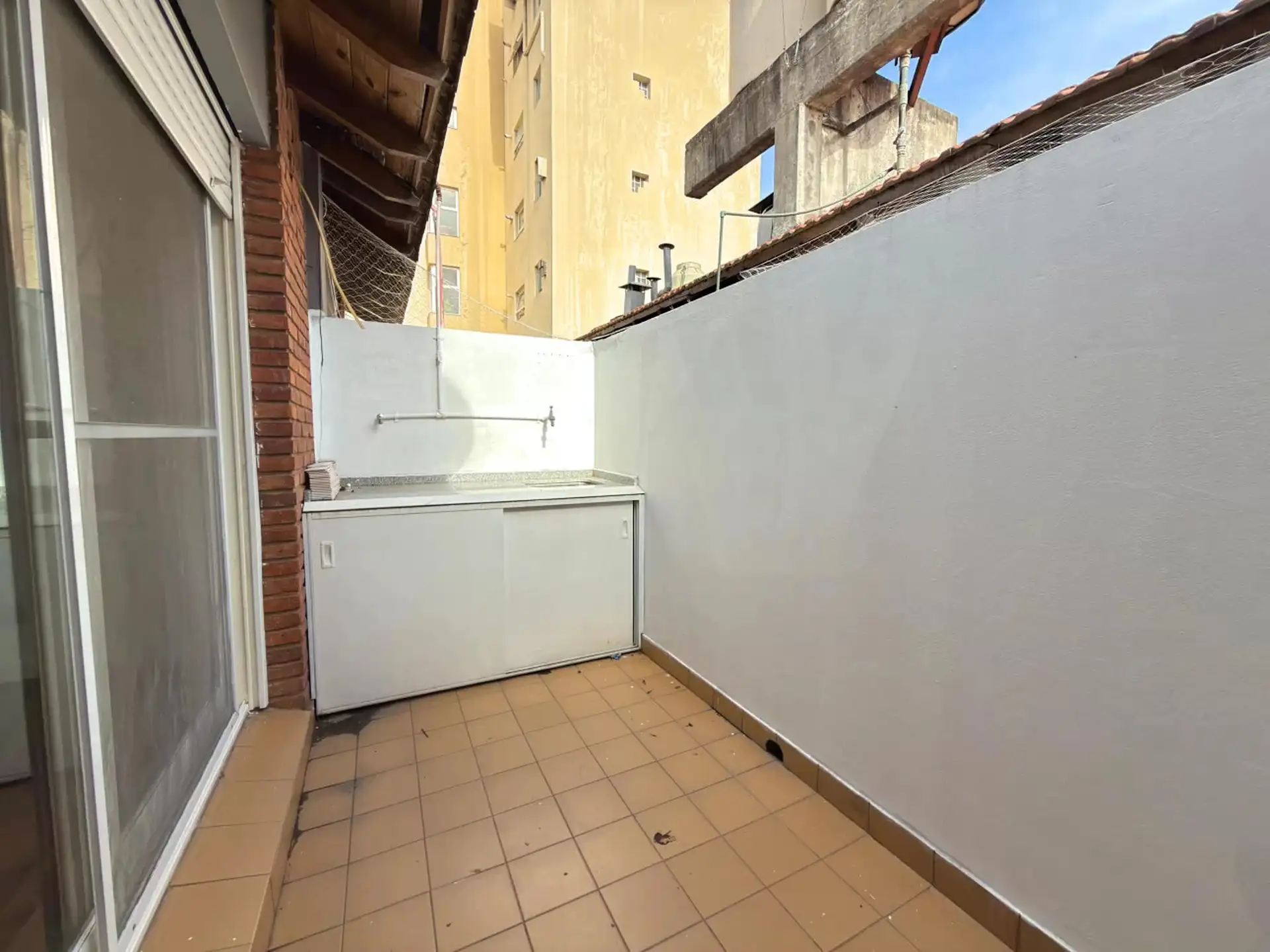 Apartamento duplex de 3 ambientes com varanda, pátio e área de lavanderia, no 2º andar acessível por escada. Conta com cozinha integrada ao living e jantar, equipada com fogão a gás e exaustor, além de balcão para café da manhã e armários inferiores e superiores. Há 1 banheiro completo. No pavimento superior, oferece 1 quarto com armário e um segundo espaço que pode ser usado como quarto ou escritório, com pátio e área de lavanderia com bancada e conexão.