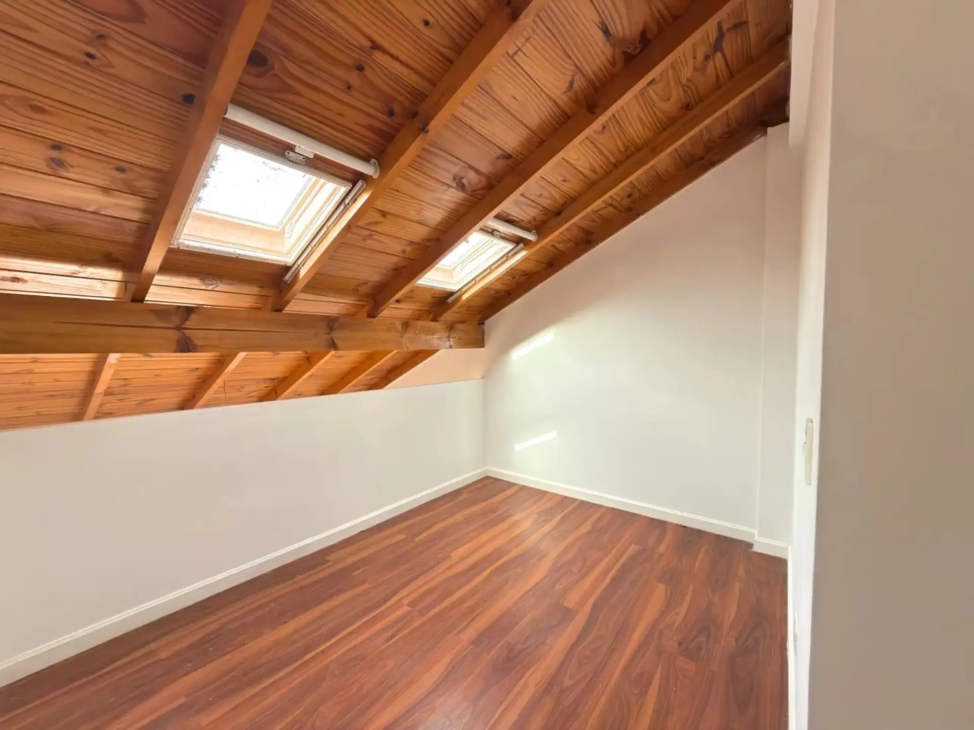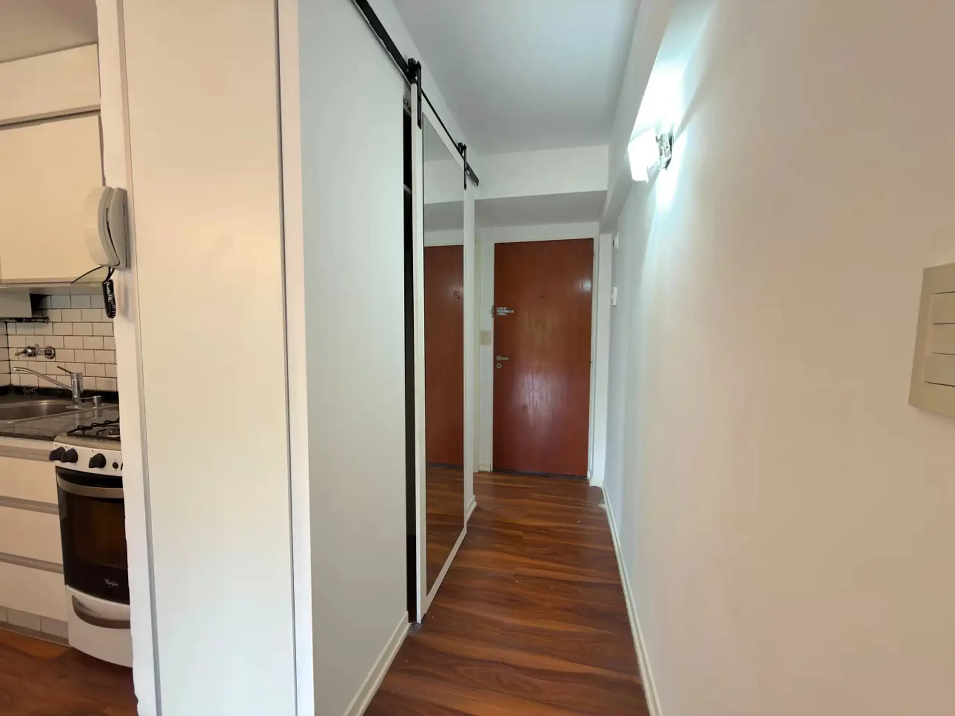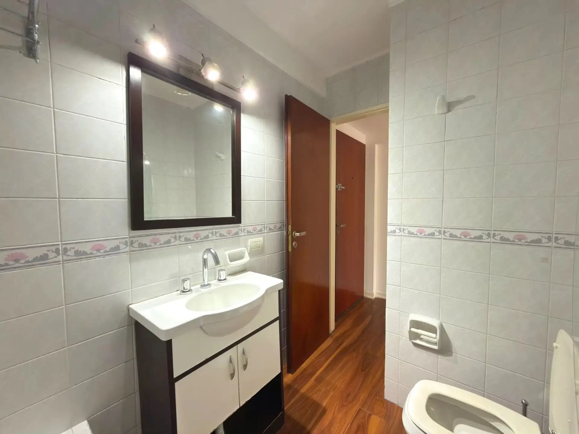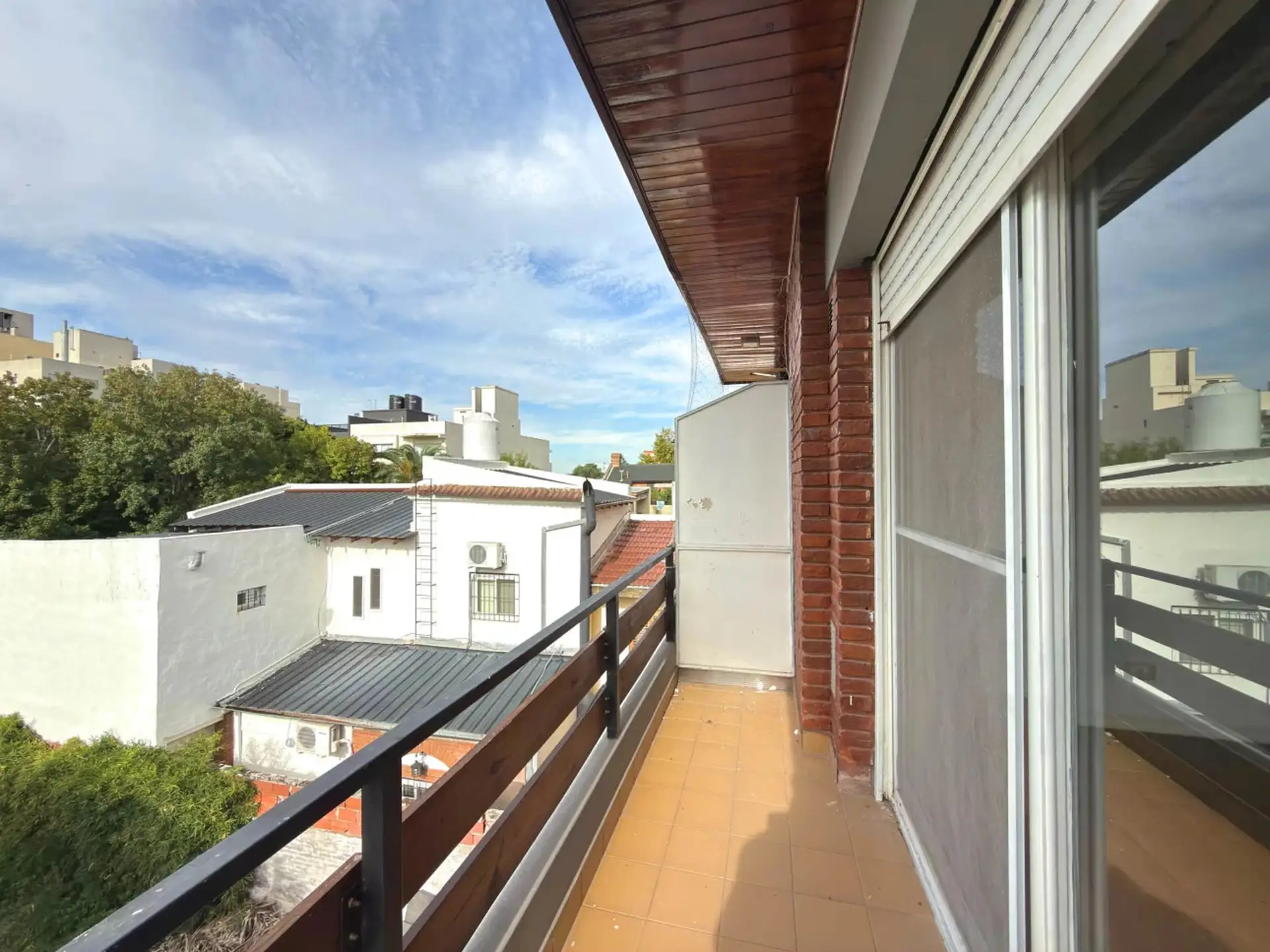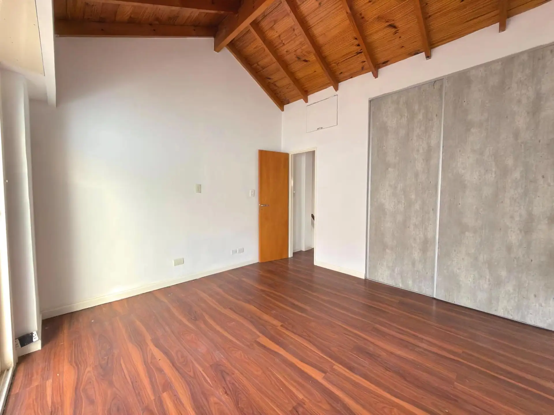 Apartamento duplex de 3 ambientes com varanda, pátio e área de lavanderia, no 2º andar acessível por escada. Conta com cozinha integrada ao living e jantar, equipada com fogão a gás e exaustor, além de balcão para café da manhã e armários inferiores e superiores. Há 1 banheiro completo. No pavimento superior, oferece 1 quarto com armário e um segundo espaço que pode ser usado como quarto ou escritório, com pátio e área de lavanderia com bancada e conexão.