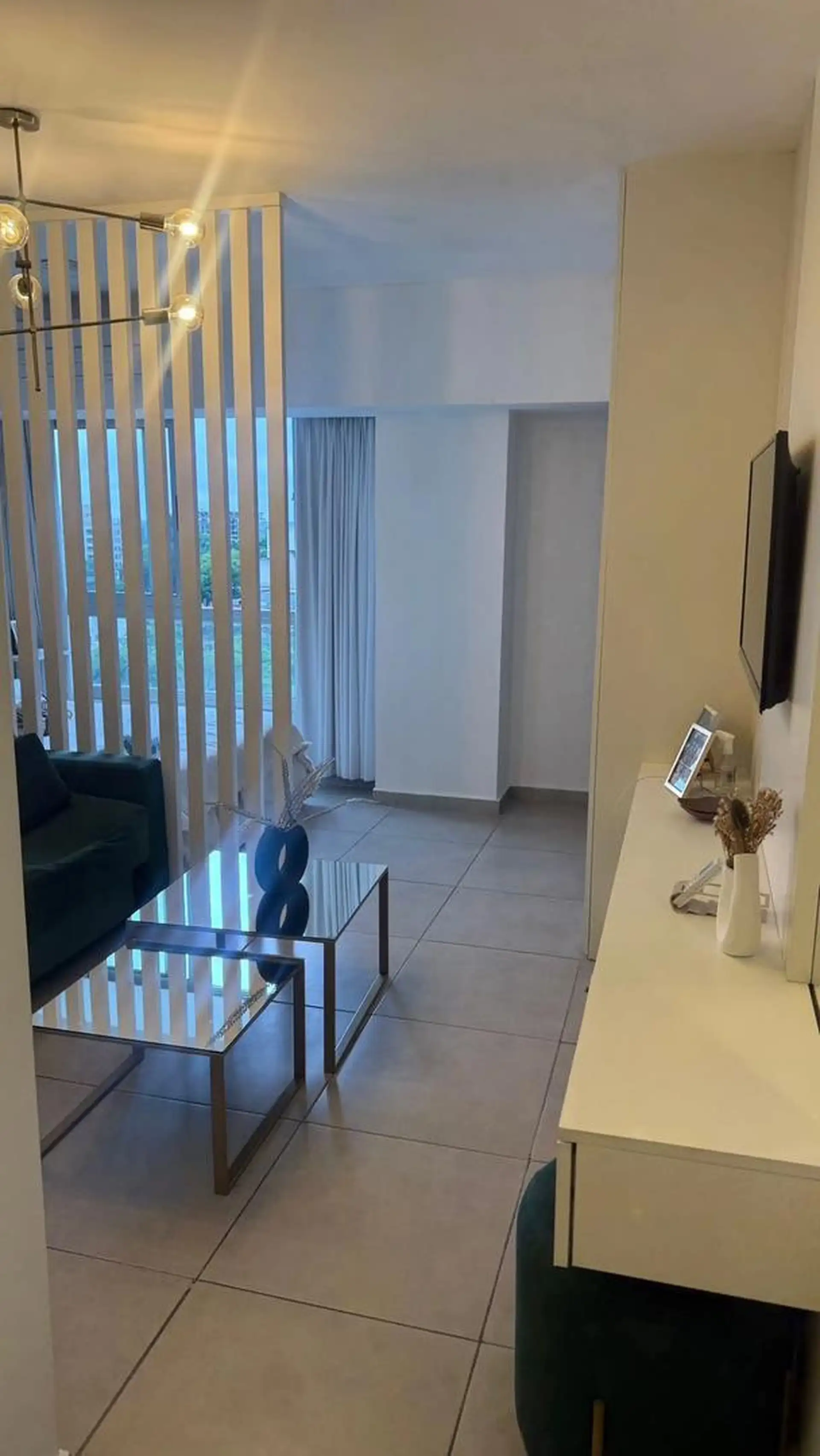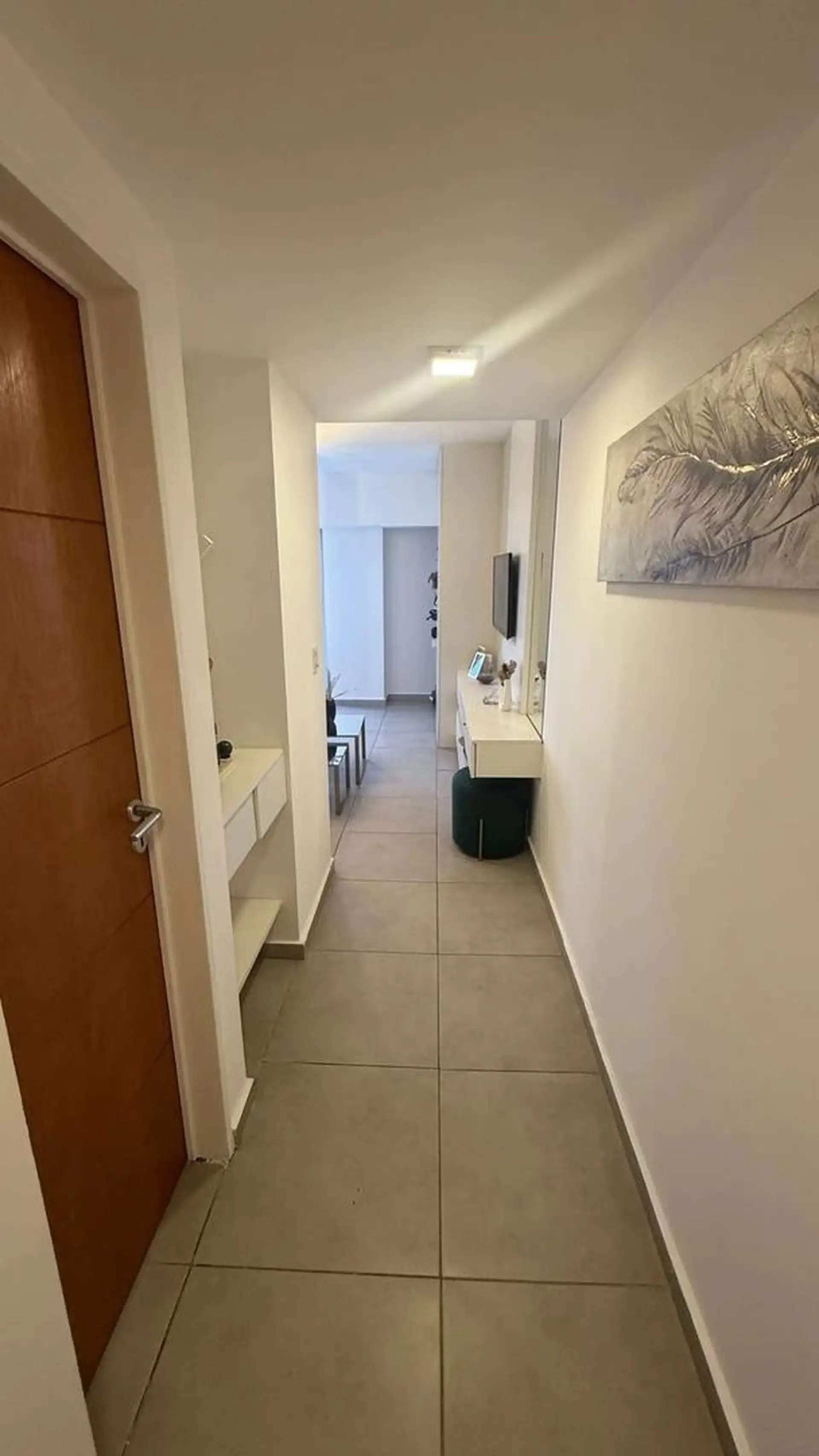 Apartamento para aluguel em Ituzaingó Norte, no 8º andar, com acesso direto do elevador desde a área de estacionamento para a unidade. Inclui rack de TV com espelho, armário com sapateira, cozinha mobiliada, divisor, entrada com suporte para cabides e banheiro reformado. O prédio tem 4 elevadores, lavanderia e área de uso comum com parque e piscina, além de solarium e salão de festas (SUM). Condomínio de cerca de 115.000 a 120.000, aceita pet de pequeno porte e contrato de 24 meses, com garantia