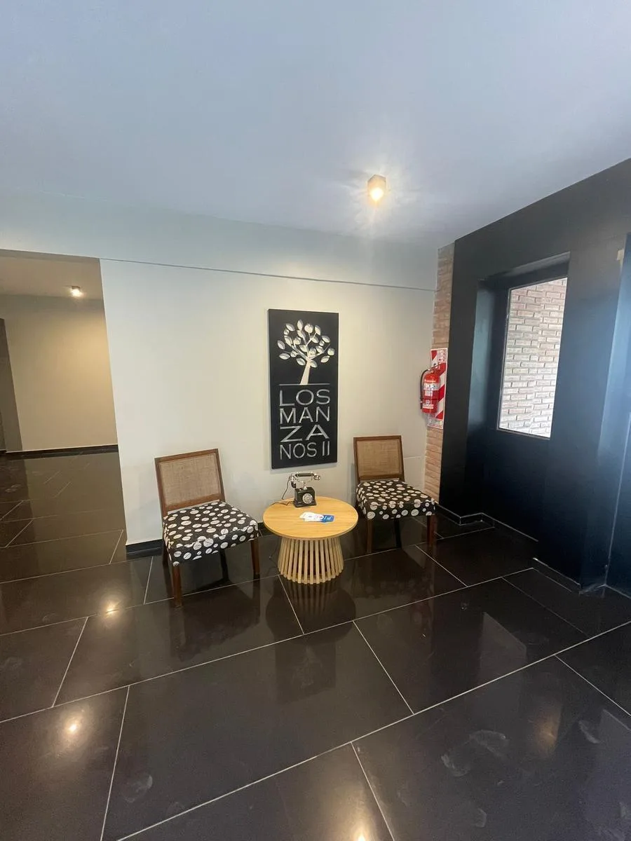 Apartamento de dois ambientes à venda no Edificio Los Manzanos II. Fica no 4º andar de frente, com living e sala de jantar, cozinha separada com móveis sob bancada e armário, fogão elétrico e pré-instalação para lavadora ou lava-louças. Inclui lavabo de recepção, dormitório em suíte com varanda e closet, vaga de garagem (fixa) e terraço privado com área de churrasco. Conta com luminárias e ar-condicionado instalados, e o edifício oferece salão de festas, piscina com solarium e parque, área de ch