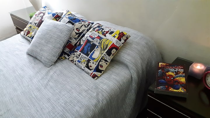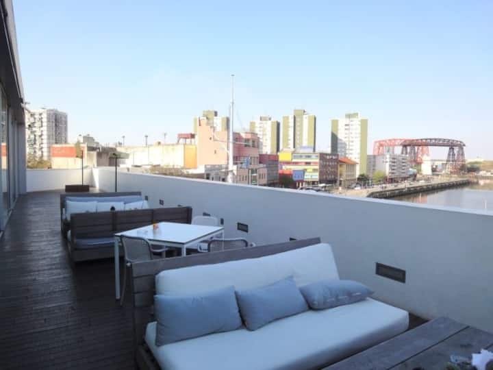 Apartamento em La Boca, a 1 quarteirão da Usina del Arte e em áreas próximas a Puerto Madero e Caminito, com quarto compartilhado com 2 camas. O acesso é compartilhado à cozinha, ao banheiro e à sala de jantar principal. A pessoa com o quarto no mezanino reside separadamente. O quarto tem cama grande e espaço de armazenamento. A cozinha tem fogão a gás, geladeira, micro-ondas e máquina de lavar automática. O banheiro tem box e produtos de higiene. A sala de jantar é usada para refeições e conviv