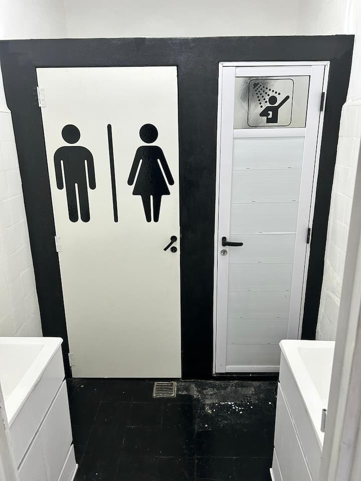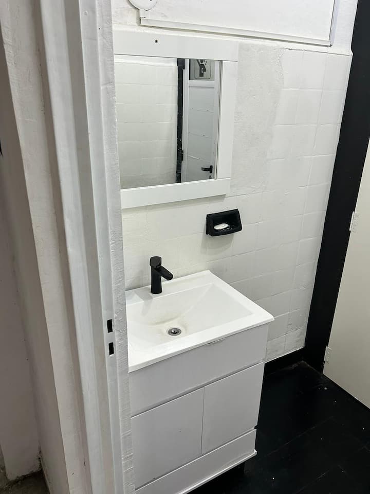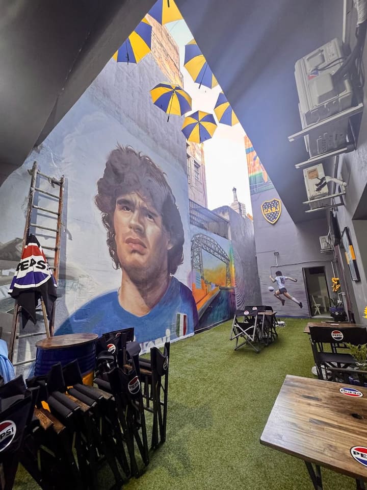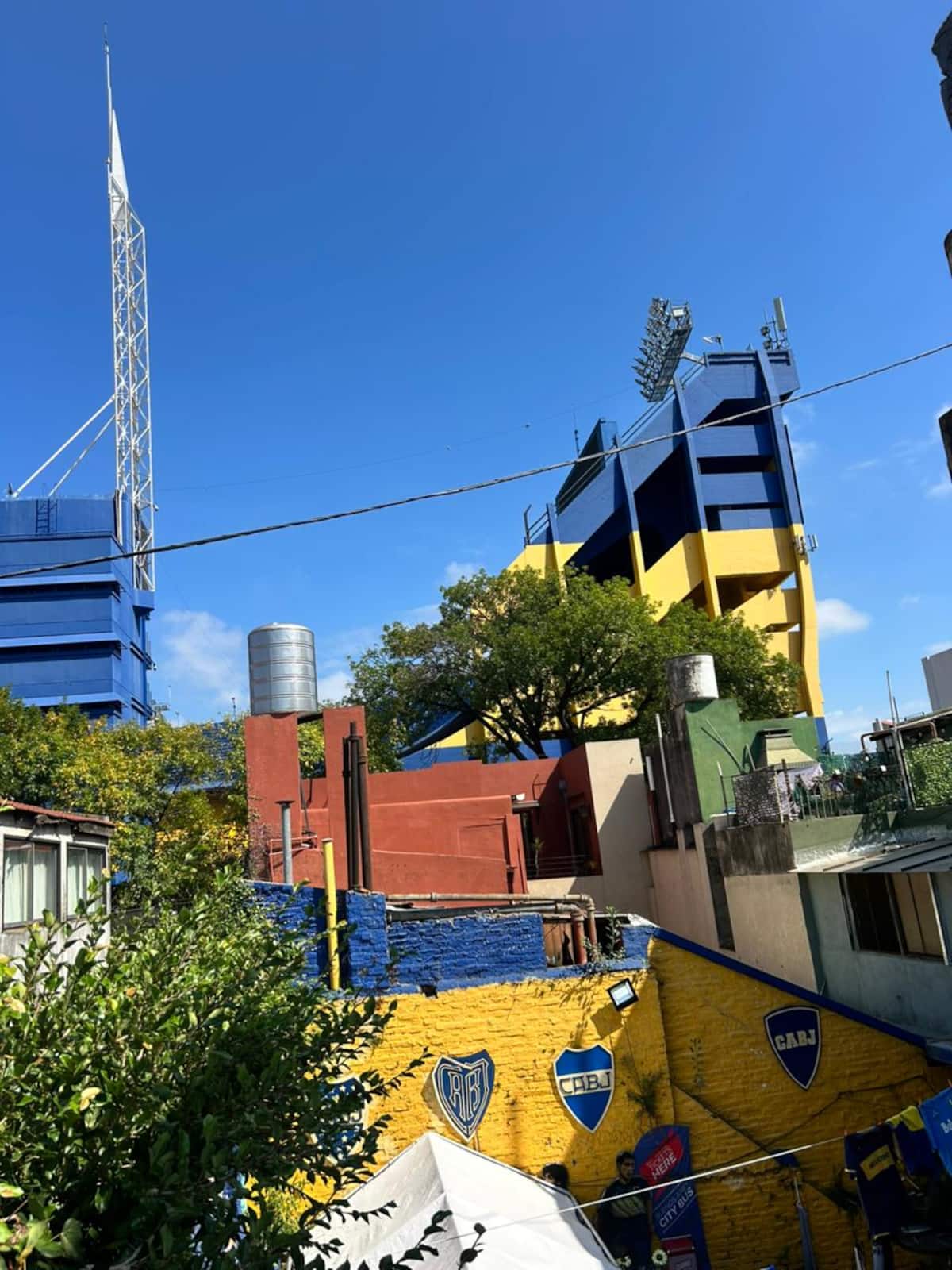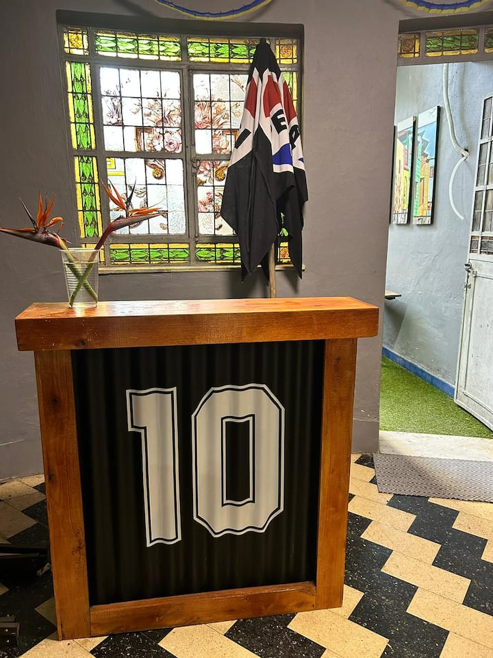 Apartamento tipo quitinete em La Boca, Buenos Aires, localizado em frente ao estádio do Boca. As acomodações são descritas como espaçosas e funcionais, com capacidade de até 6 pessoas por quarto, e lockers individuais. Inclui Wi-Fi e ar-condicionado, além de áreas comuns com pátio para refeições com mural de Maradona e terraço com vista para La Bombonera.