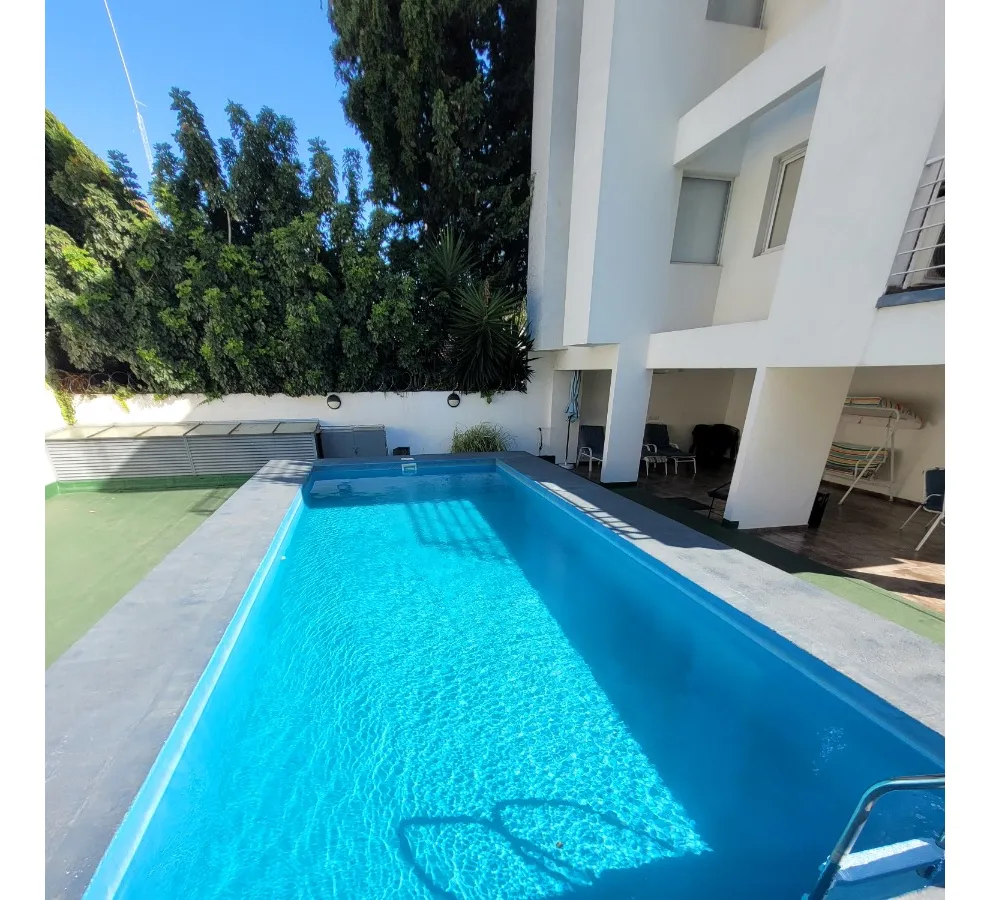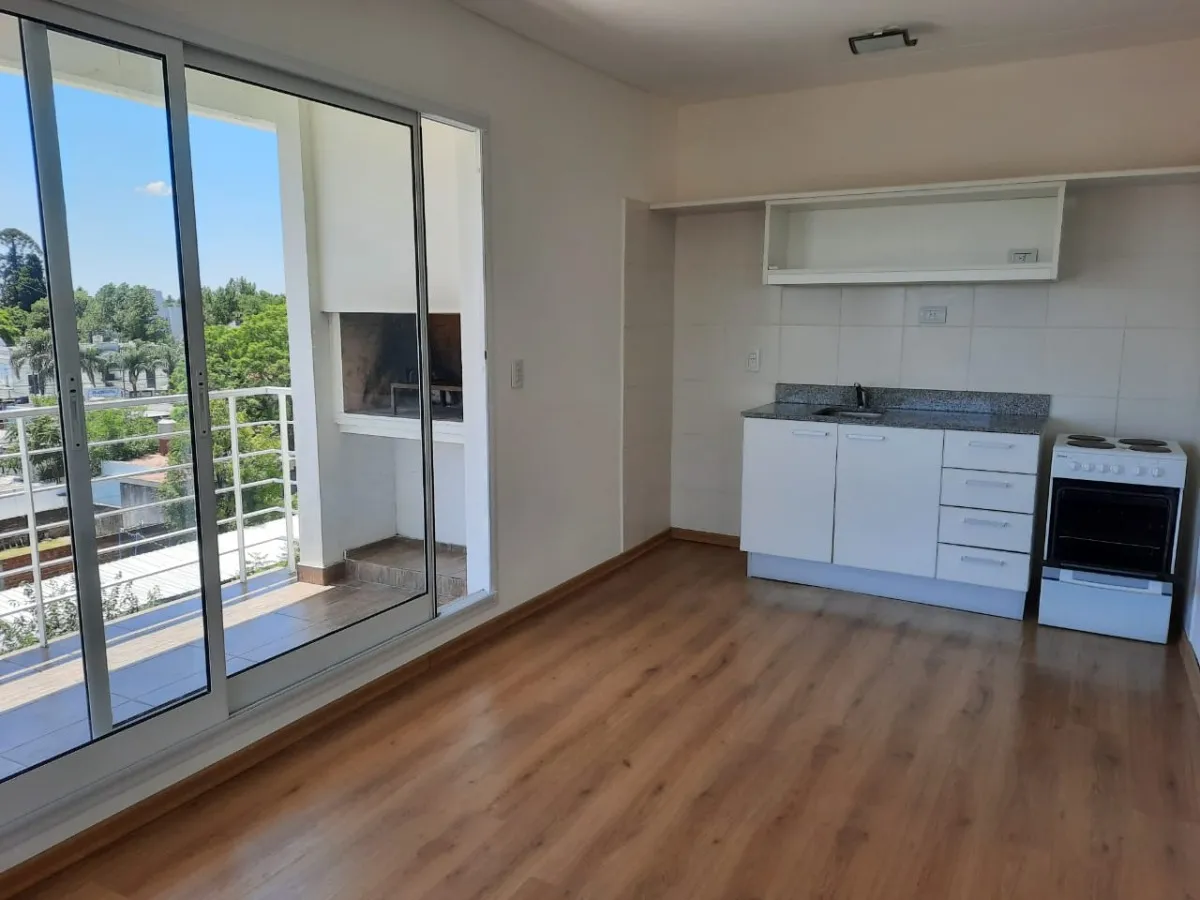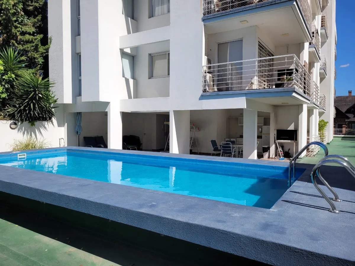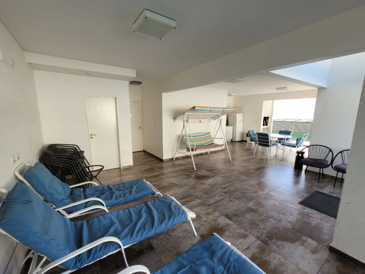 Apartamento de dois ambientes no 4º andar, com 1 quarto e cozinha/sala integradas, mobiliado ou sem mobília não especificado. Frente para a rua, com vaga de garagem fixa coberta e depósito. O prédio tem piscina, solário e salão de festas (SUM). Condomínio inclui água, gás e taxa municipal. Fica a 400 m da Estação Ramos Mejía e a 1 quadra da Av. Rivadavia.
