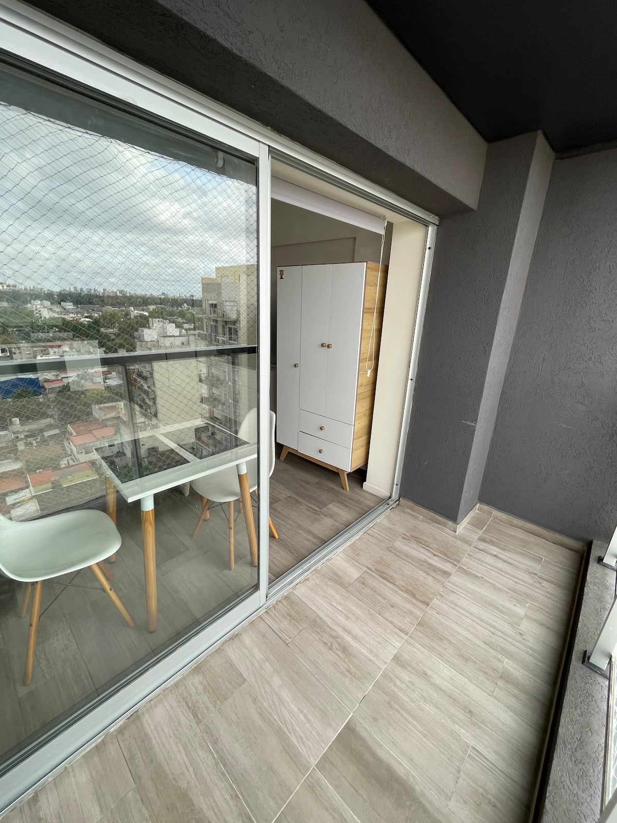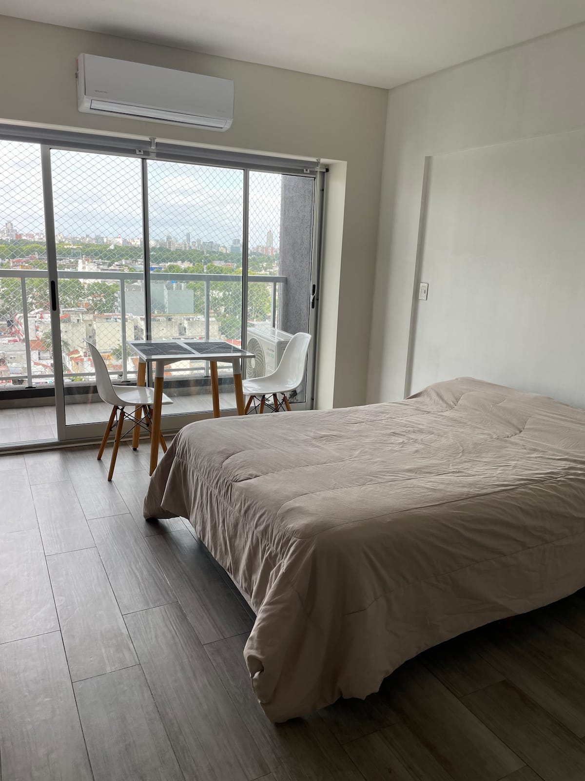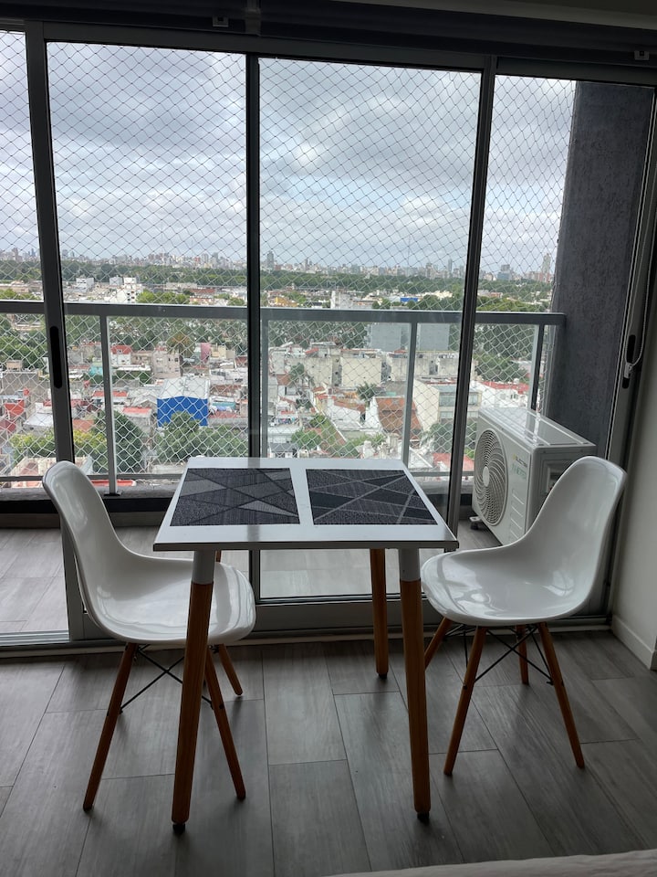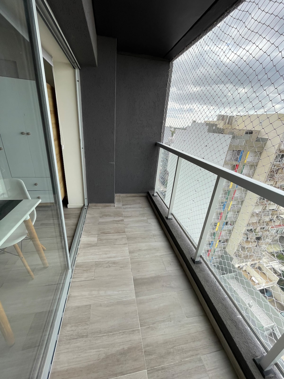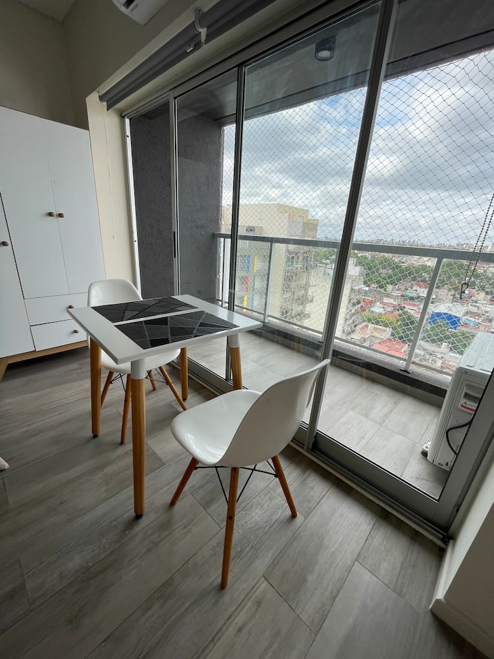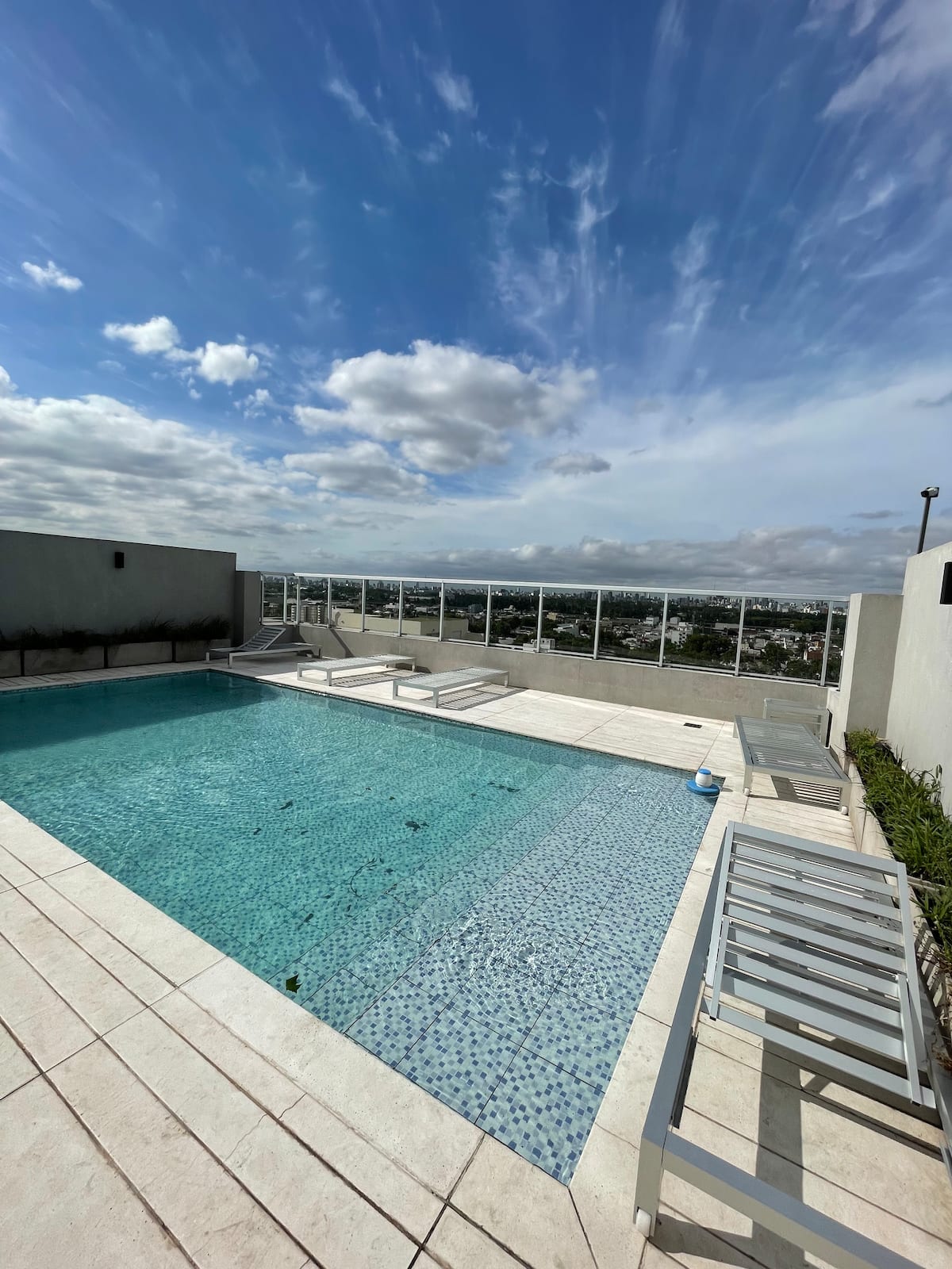 Kitnet no alto de edifício em La Paternal, com varanda e vista panorâmica. Possui cozinha totalmente equipada e sala de estar com área de churrasco. O condomínio inclui lavanderia, academia e piscina, além de terraço com piscina.