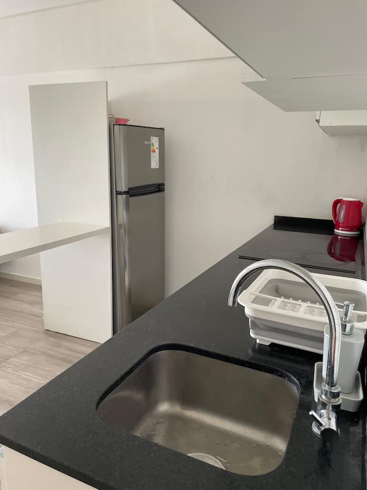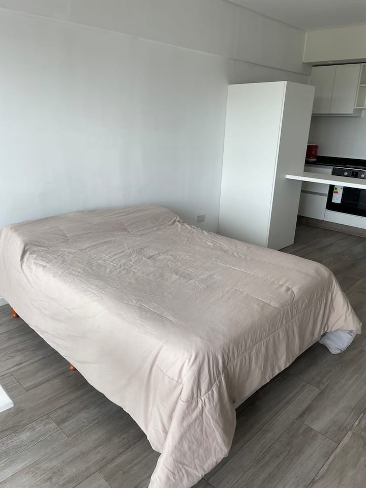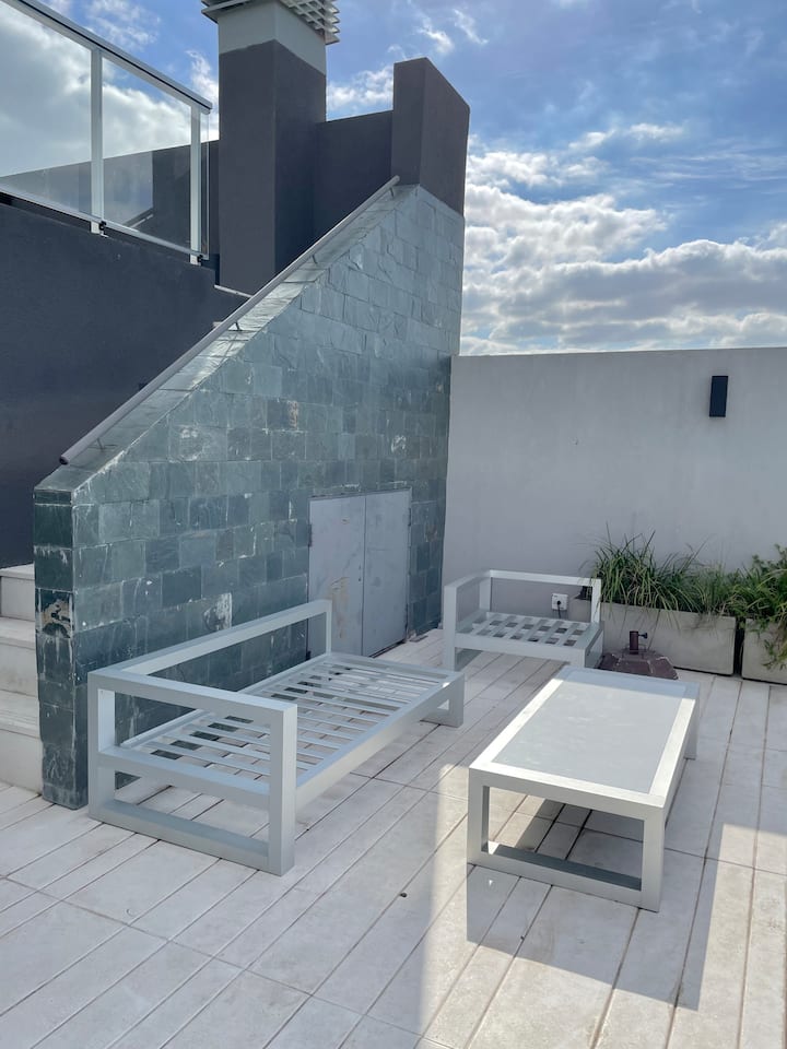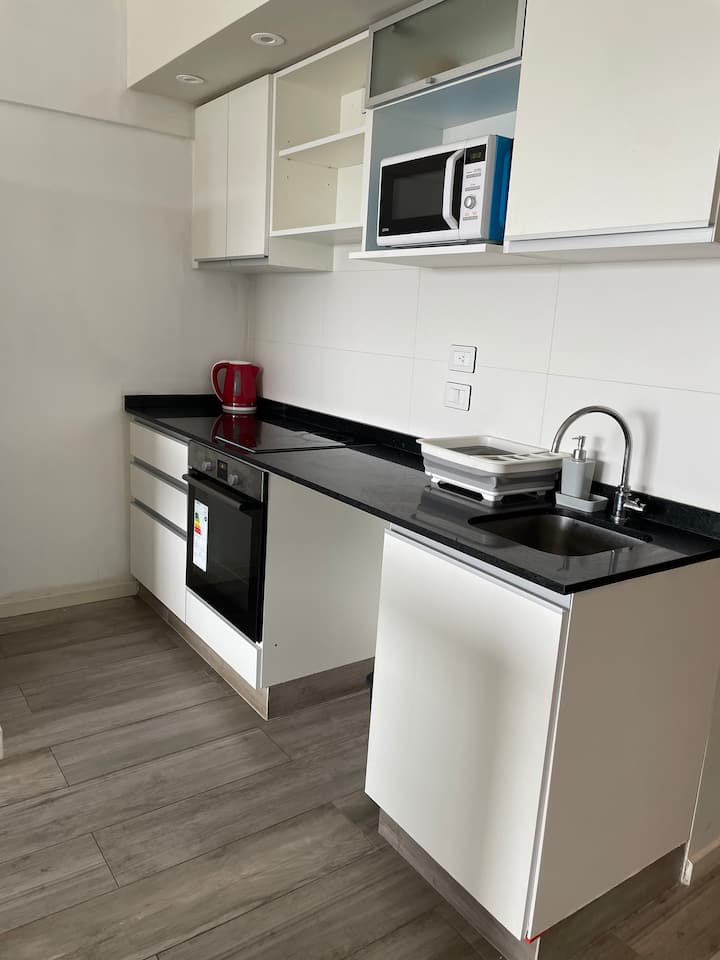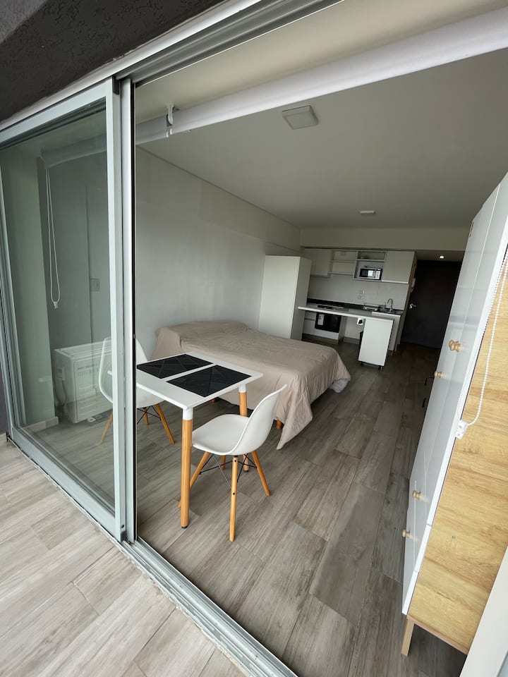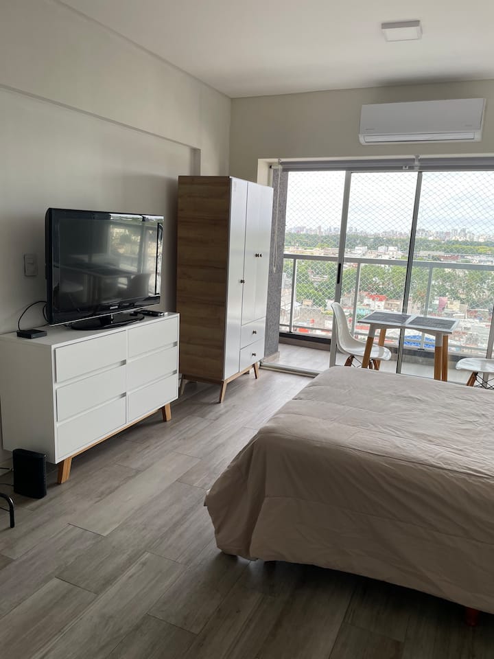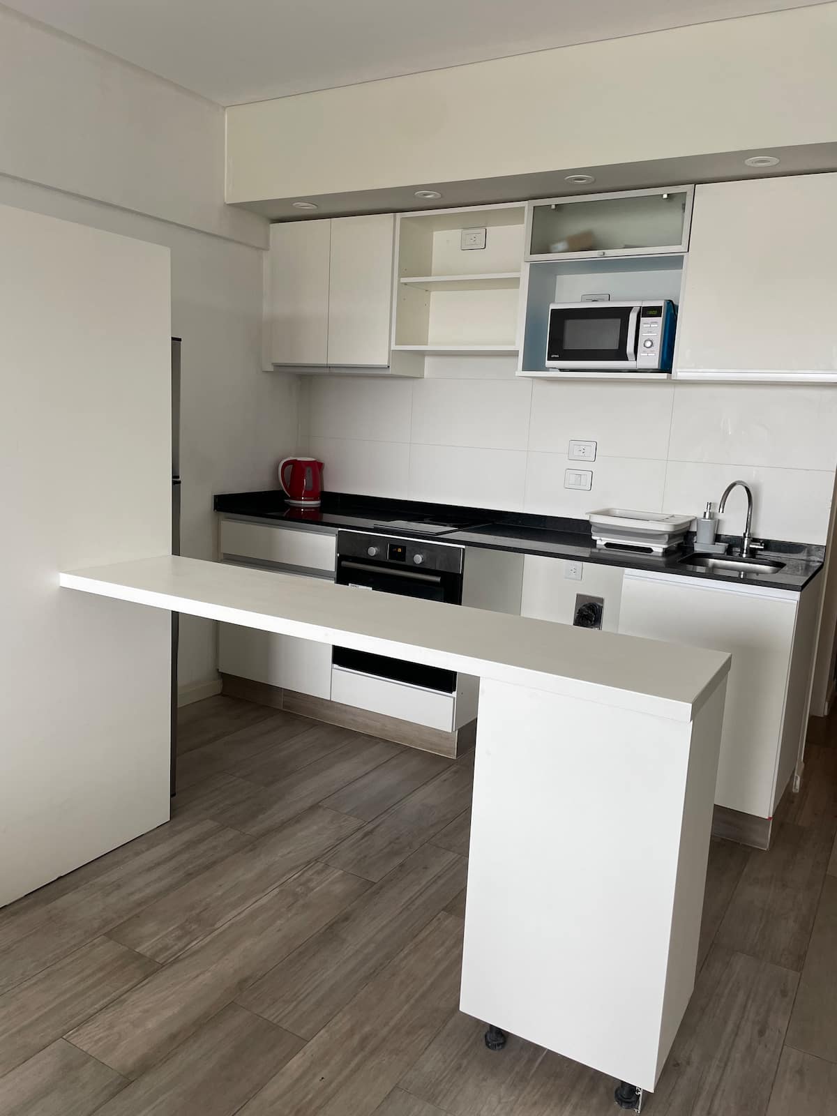 Kitnet no alto de edifício em La Paternal, com varanda e vista panorâmica. Possui cozinha totalmente equipada e sala de estar com área de churrasco. O condomínio inclui lavanderia, academia e piscina, além de terraço com piscina.