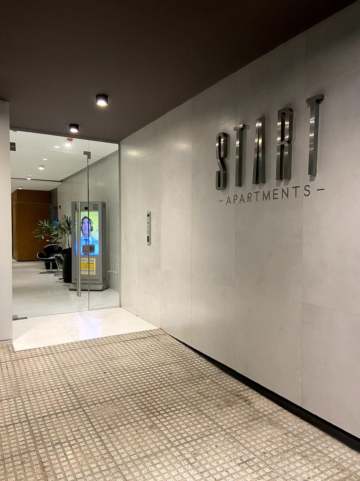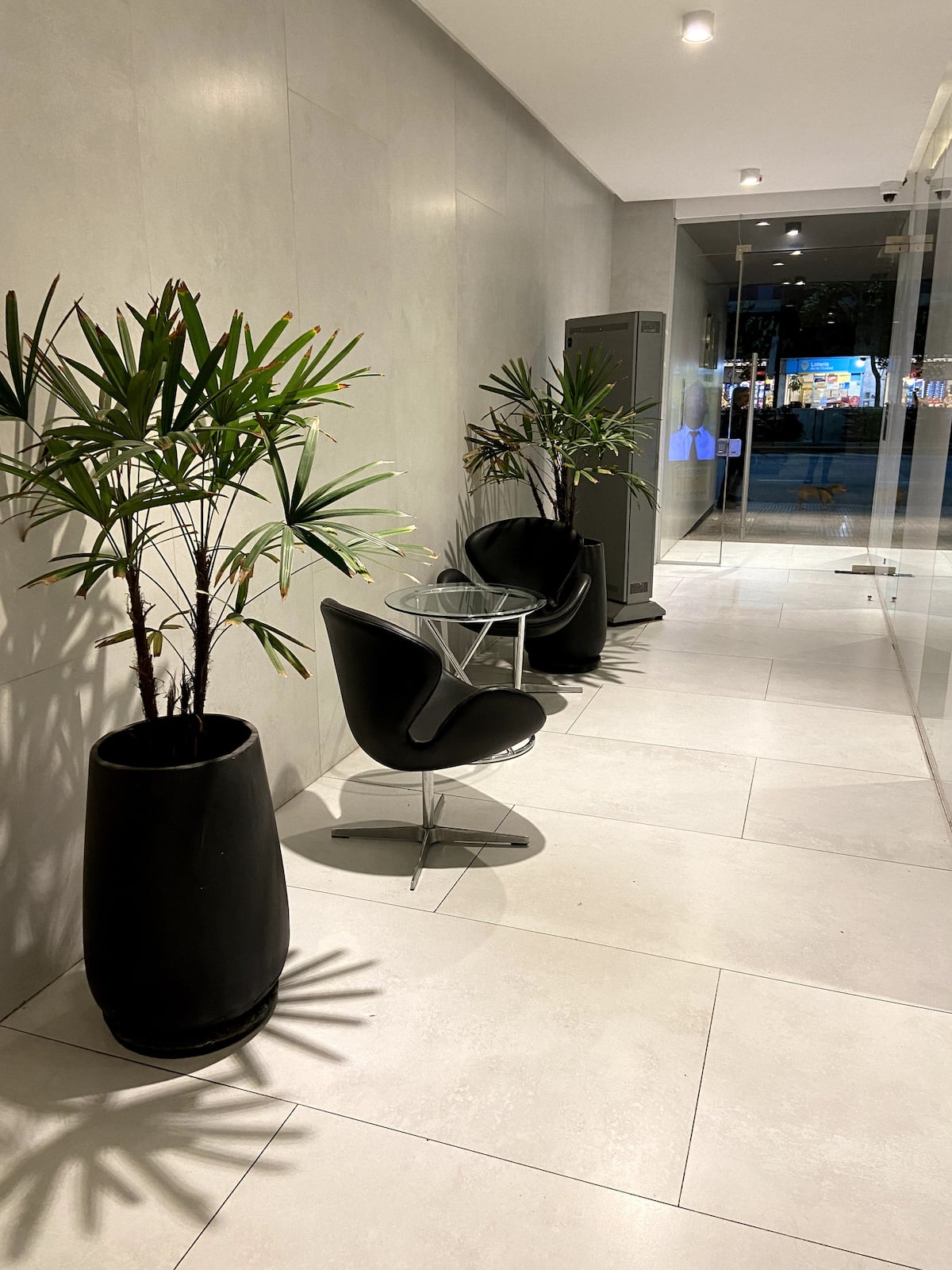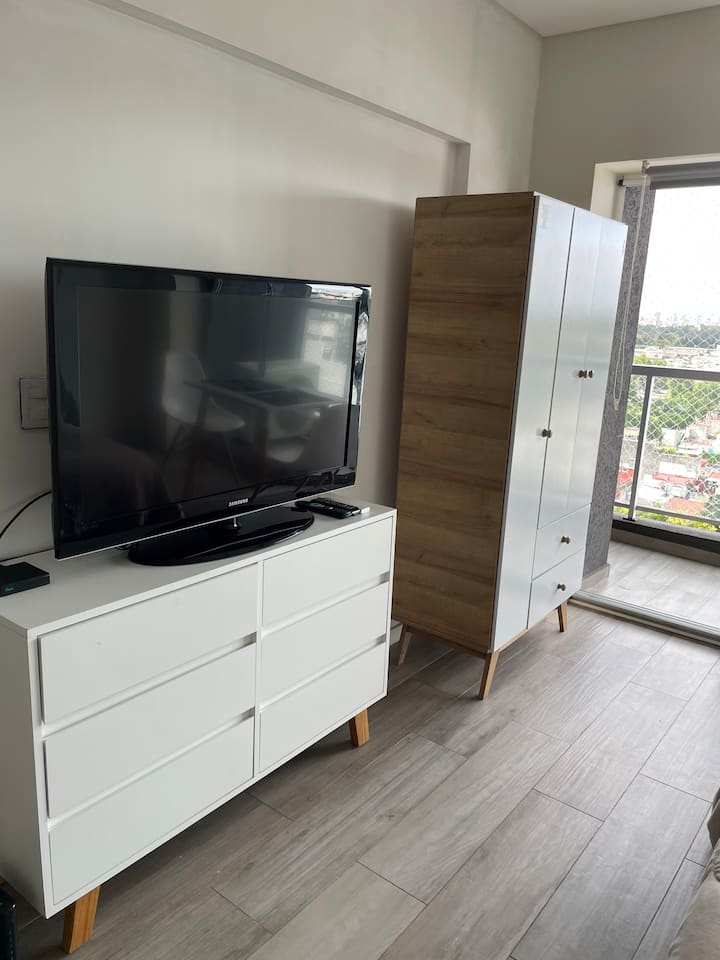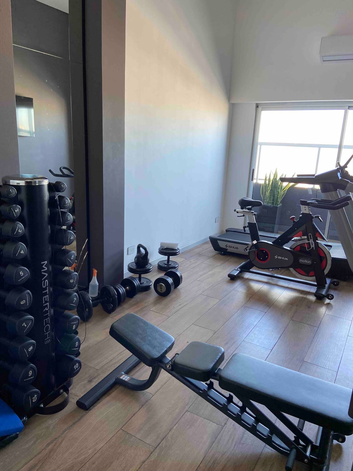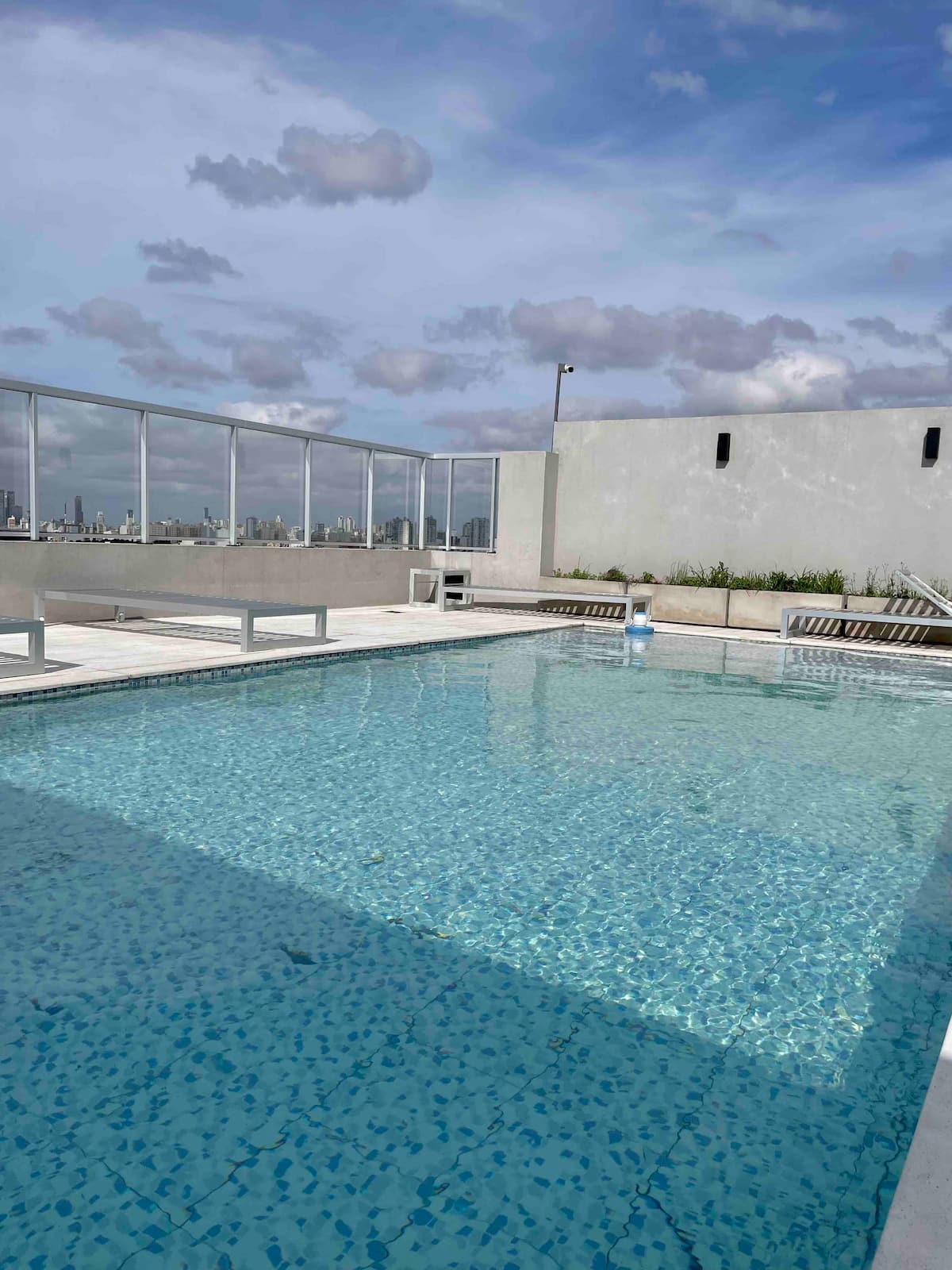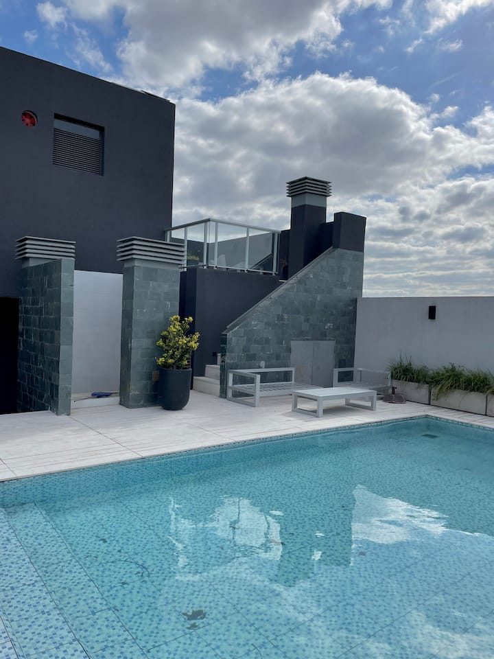 Kitnet no alto de edifício em La Paternal, com varanda e vista panorâmica. Possui cozinha totalmente equipada e sala de estar com área de churrasco. O condomínio inclui lavanderia, academia e piscina, além de terraço com piscina.