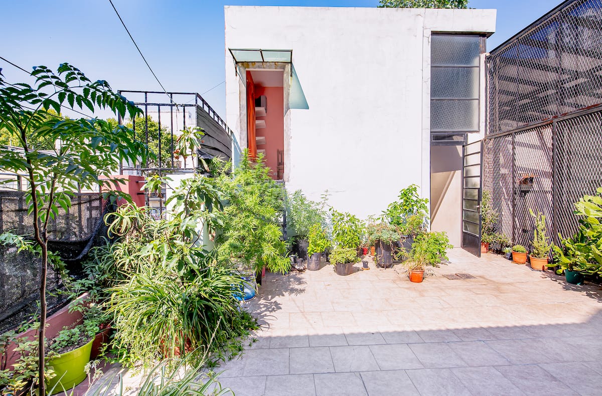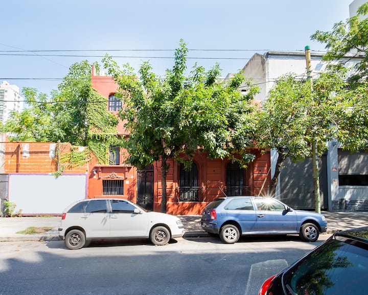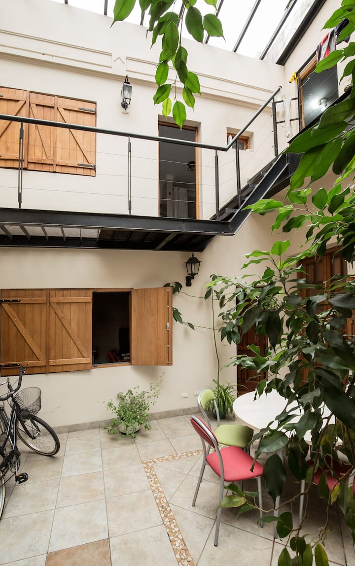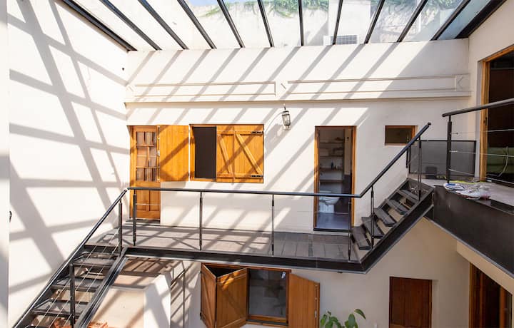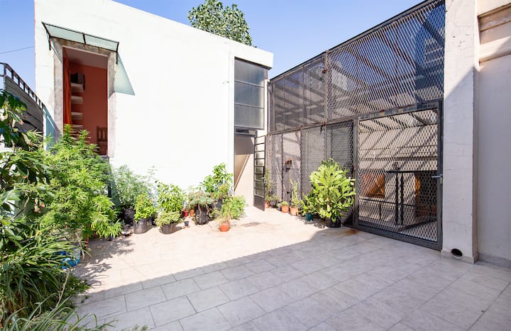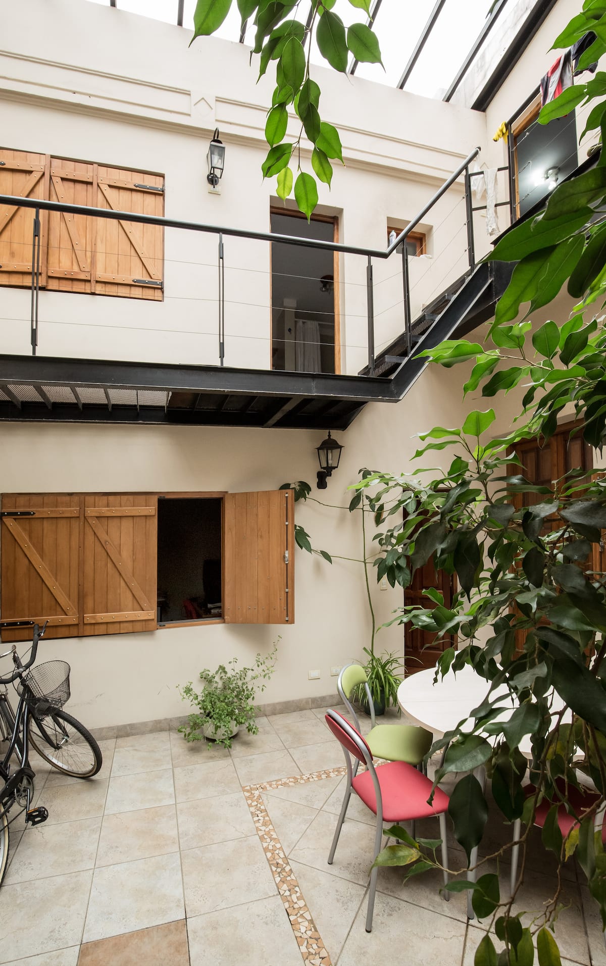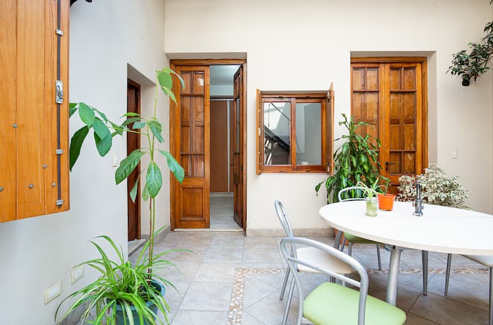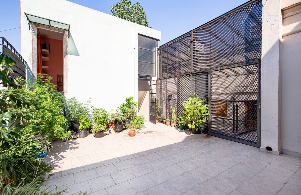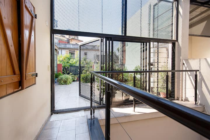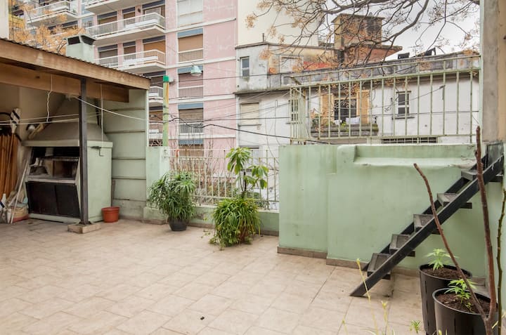 Apartamento em La Paternal. Há 3 quartos disponíveis, cada um com 2 camas. Cozinha equipada e área externa com terraço coberto (pátio).