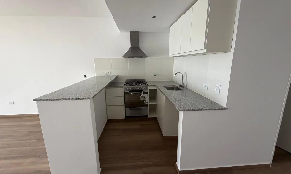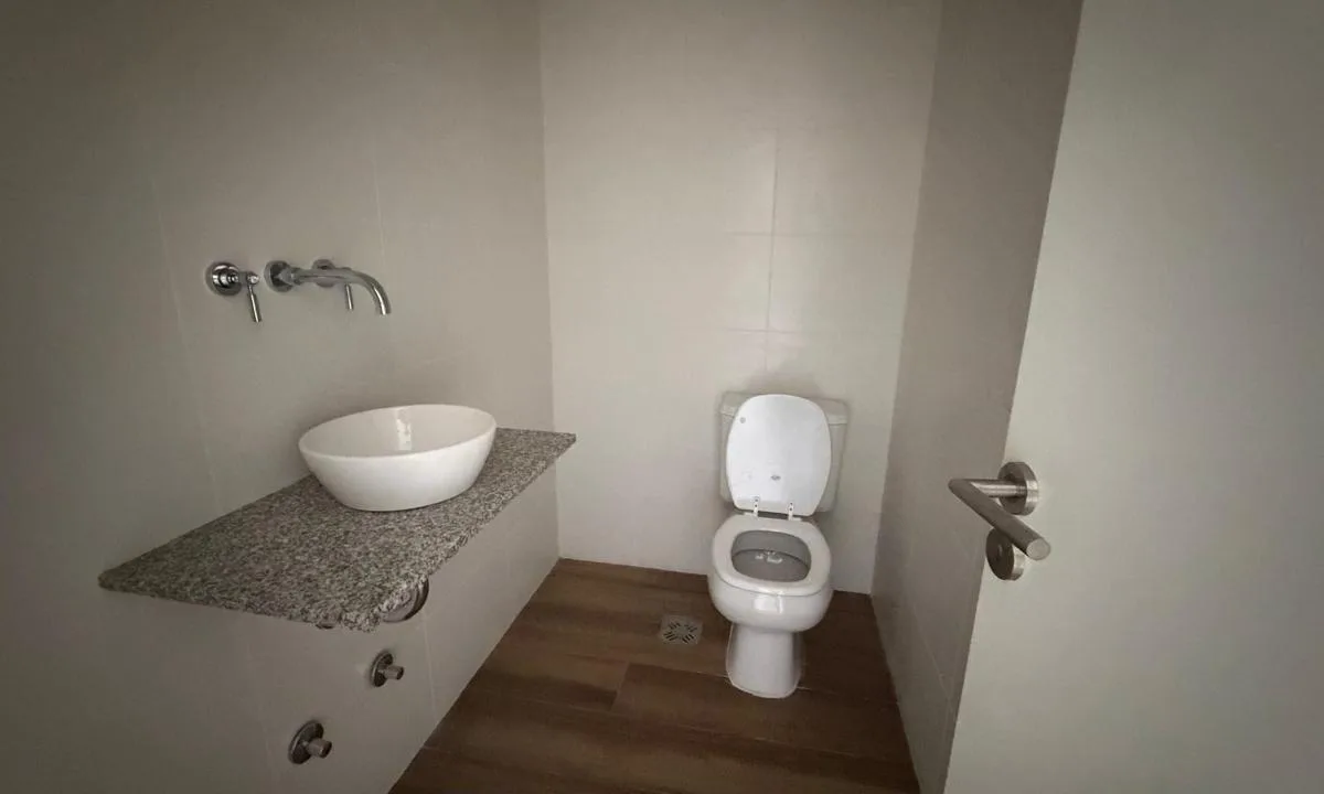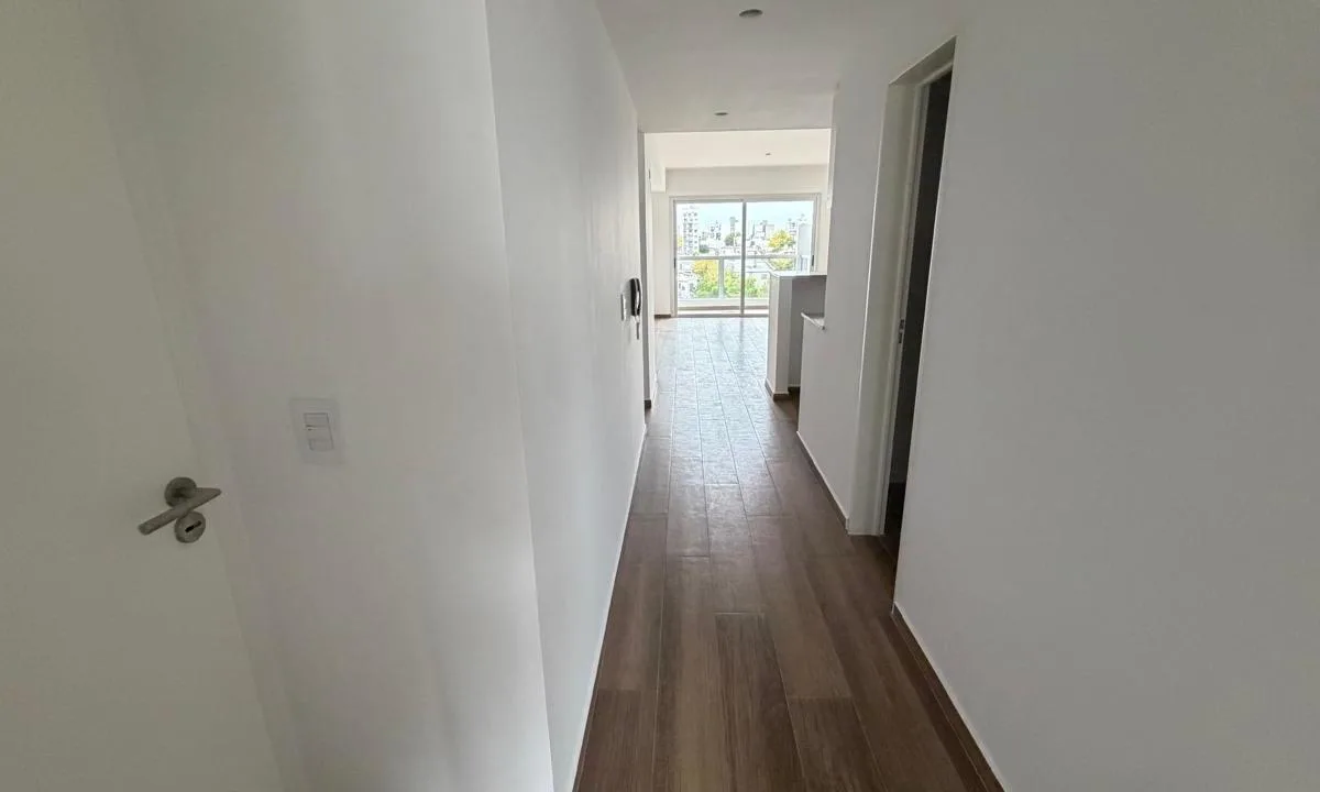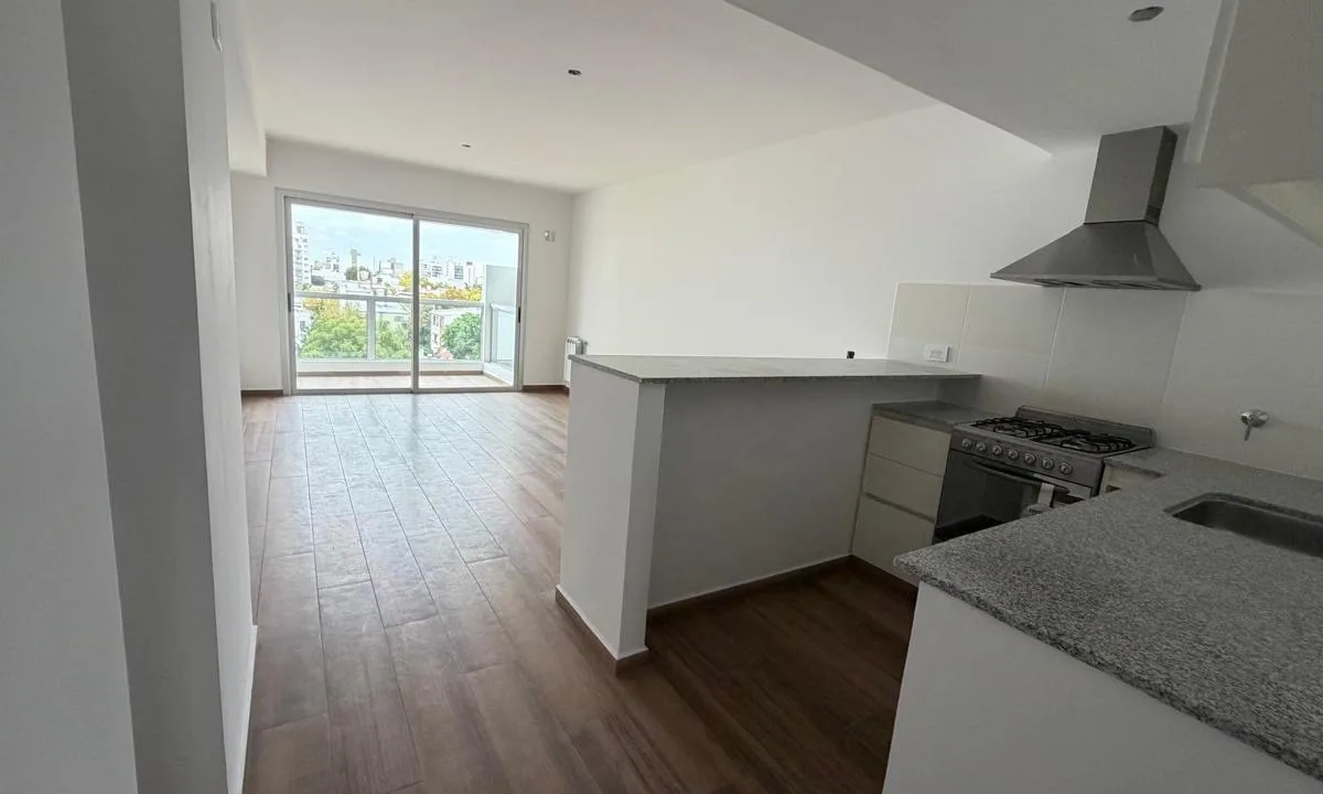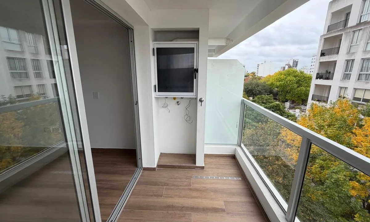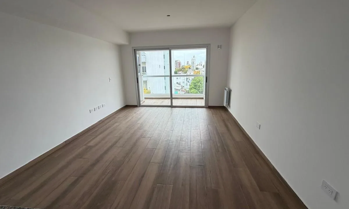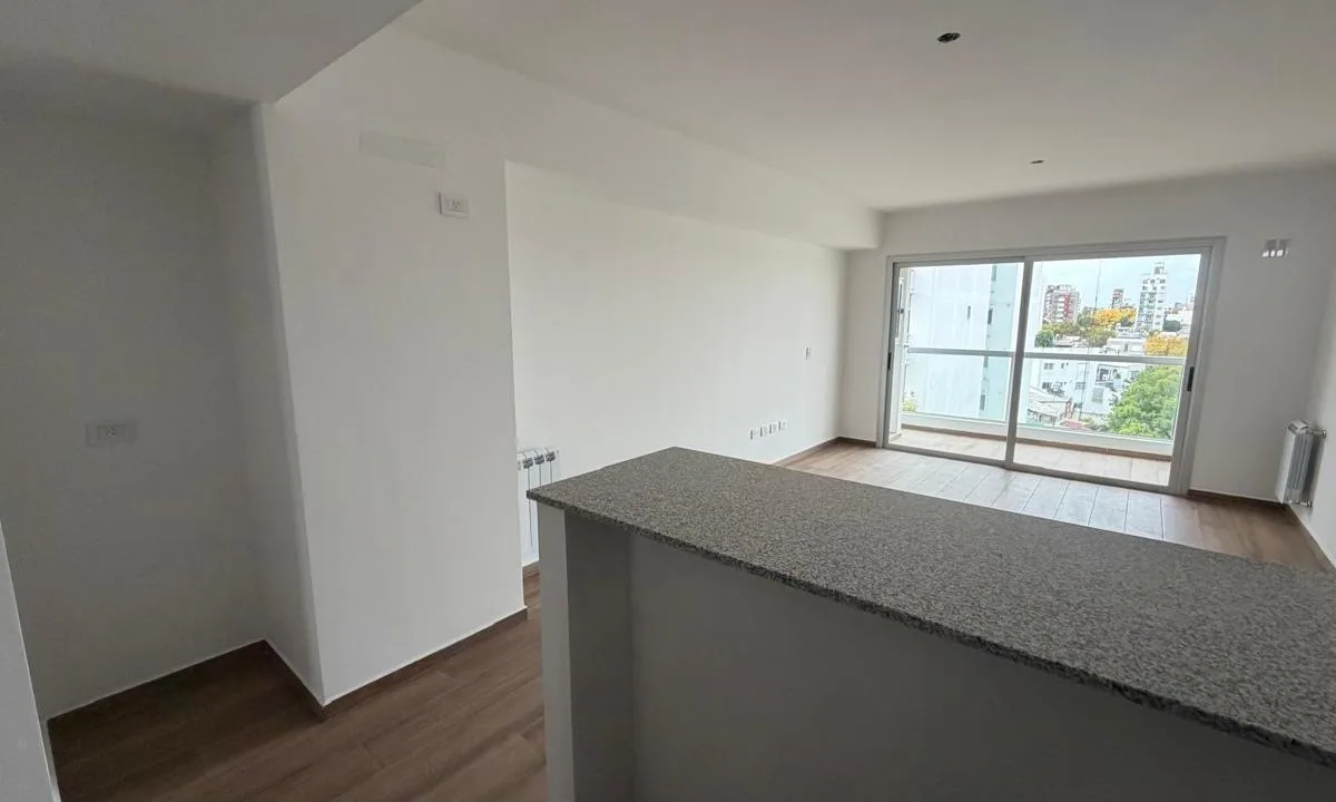 Apartamento novo com 1 quarto no 5º andar, de frente para a rua, em La Plata. Sala de estar e jantar com janelas para a frente, cozinha integrada com mobiliário, e dormitório com banheiro completo em suíte. Há um toilette independente. Aquecimento por radiadores e ar-condicionado split no living e no dormitório.