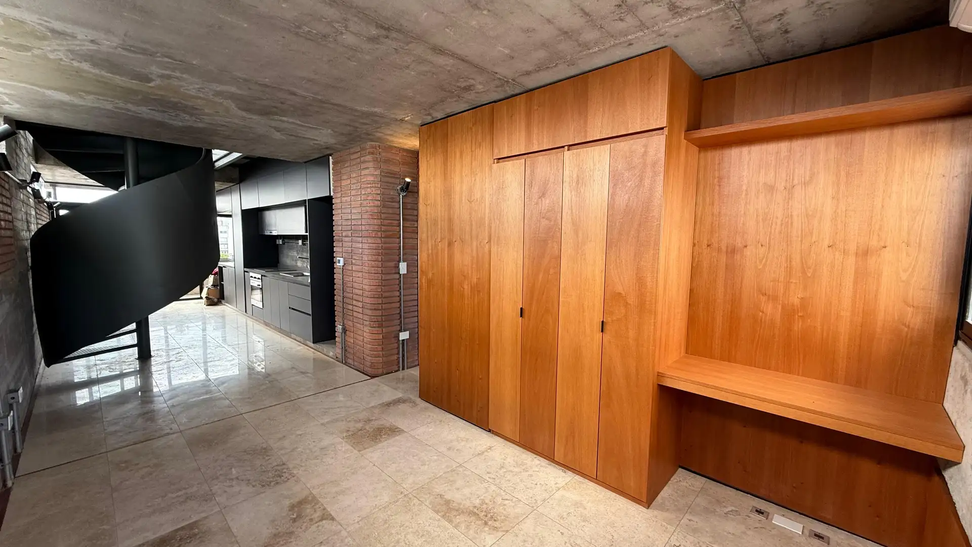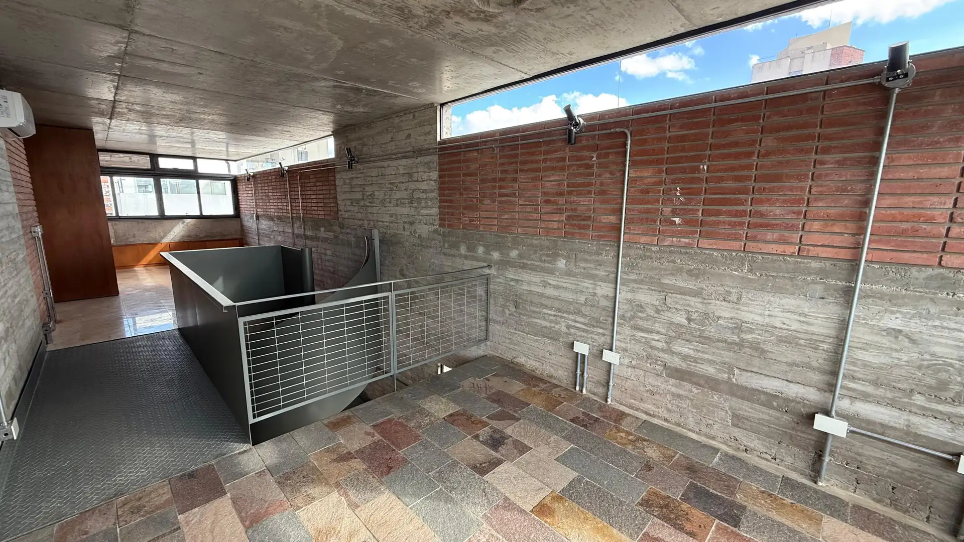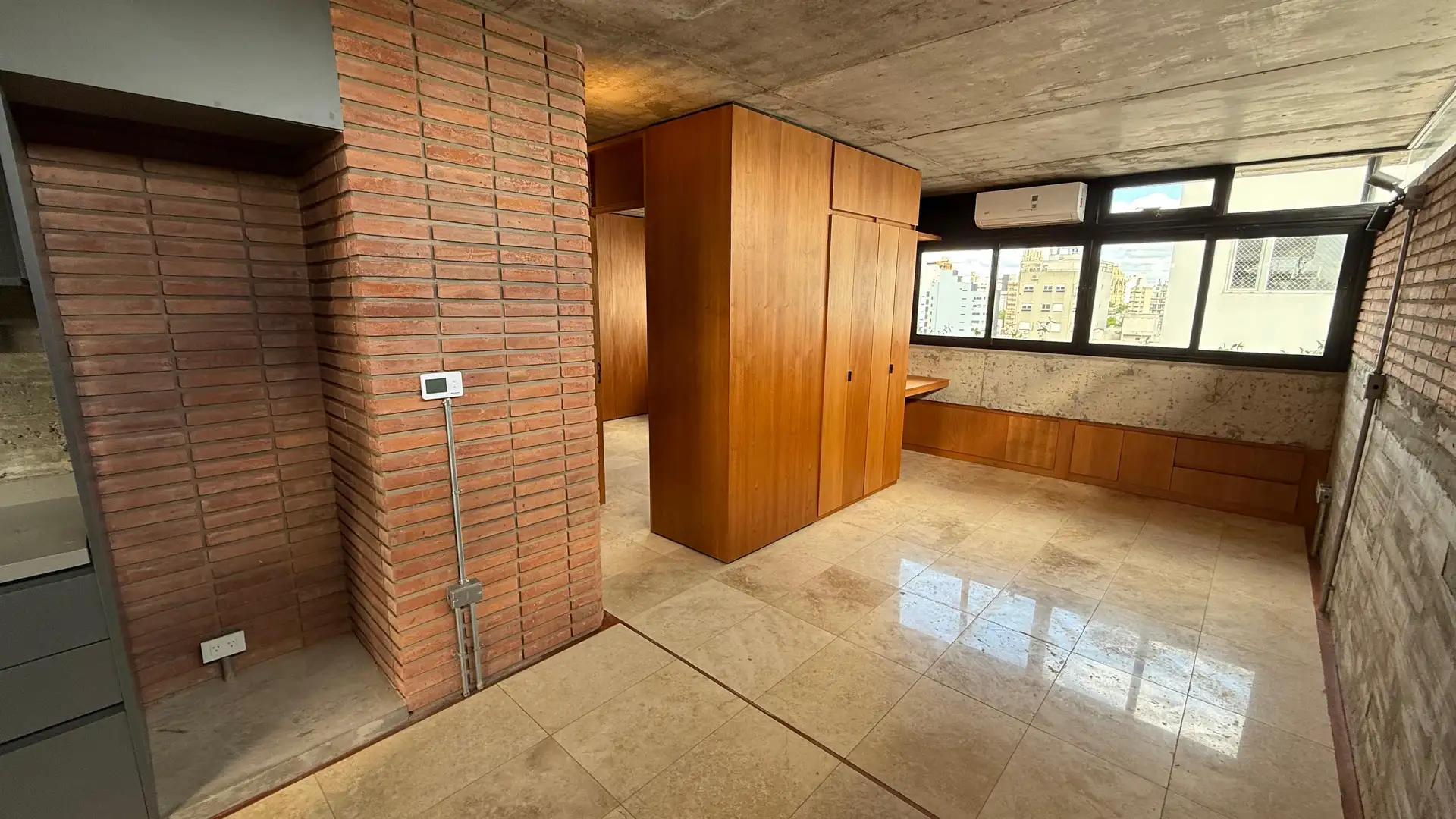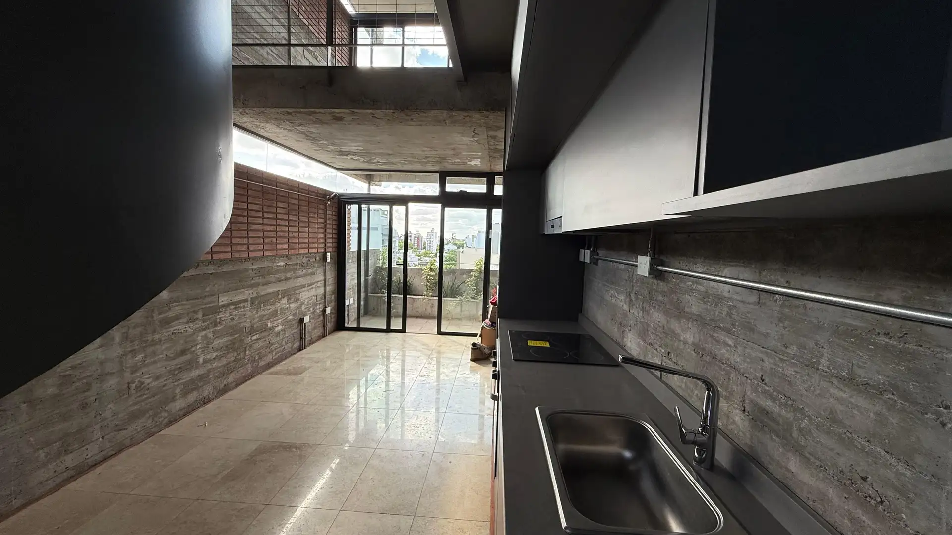 Apartamento tipo dúplex semipiso com 97 m² cobertos e 18 m² descobertos, com frente para a rua e de fundos, nos pisos 8 e 9. No piso 8 há cozinha com forno elétrico embutido, cooktop vitrocerâmico e coifa em aço inox, além de áreas de armazenamento, banheiro com box e bidê com funções eletrônicas e instalação para lavadora. O piso 9 tem acesso por escada caracol, com espaço para escritório/quarto e segundo living, banheiro e saída para varanda; há 4 ar-condicionados na unidade. O prédio tem esté