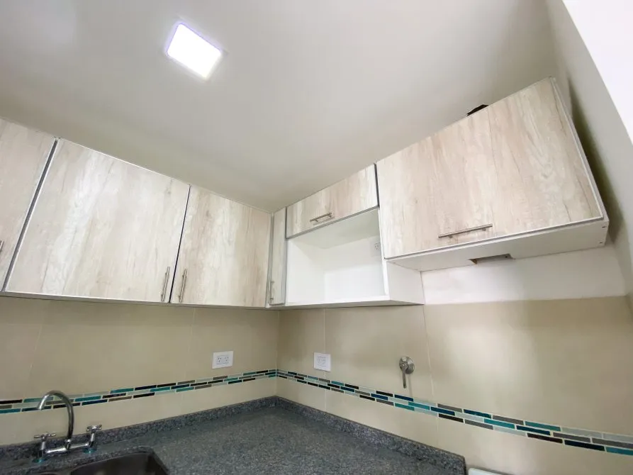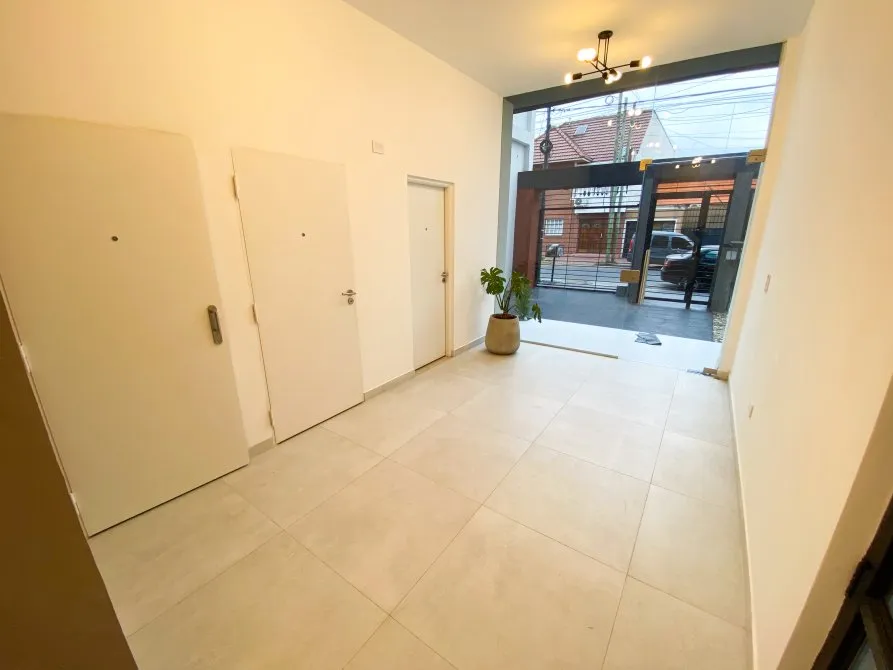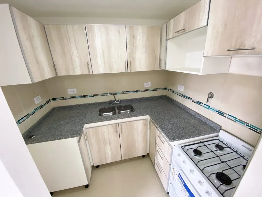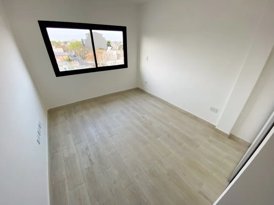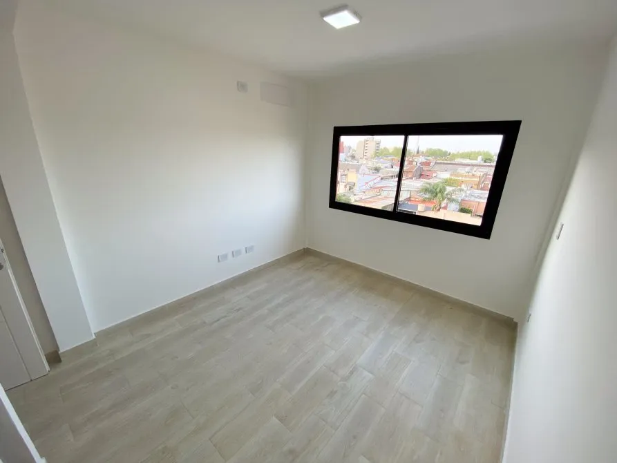 Apartamento de 2 ambientes com 42 m² totais, 1 quarto e varanda no contrafrente, em Lanús Centro. Tem sala de estar e jantar com piso cerâmico, janela-balcão, porteiro elétrico e conexões para ar-condicionado; cozinha equipada com cooktop, conexão para exaustor, armário de pia e balcão em granito com cuba dupla de aço. O banheiro é completo com banheira, bidê, espelho com luz LED e revestimento em cerâmica. O quarto tem piso cerâmico tipo flutuante, armário embutido com interiores e conexão para