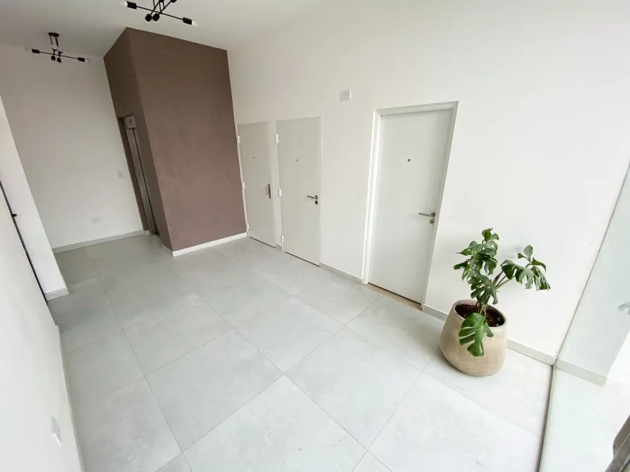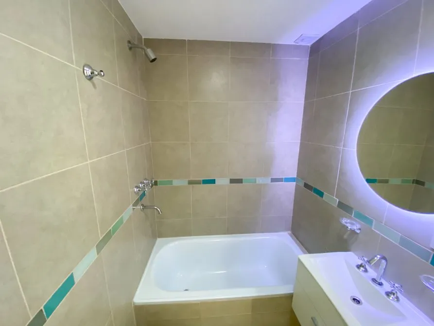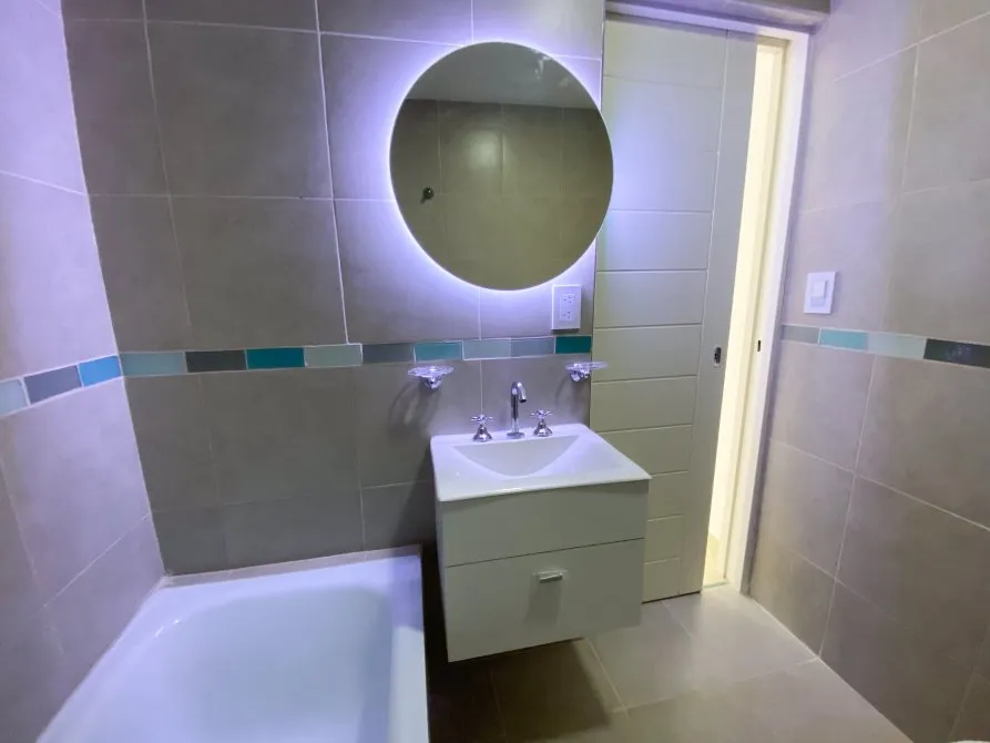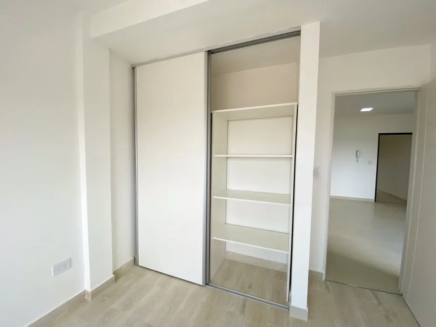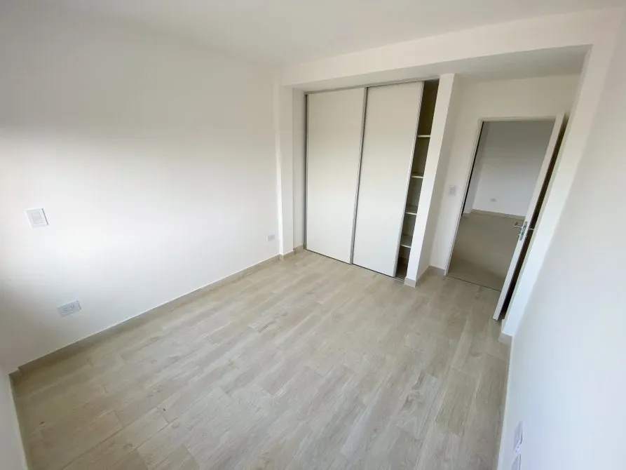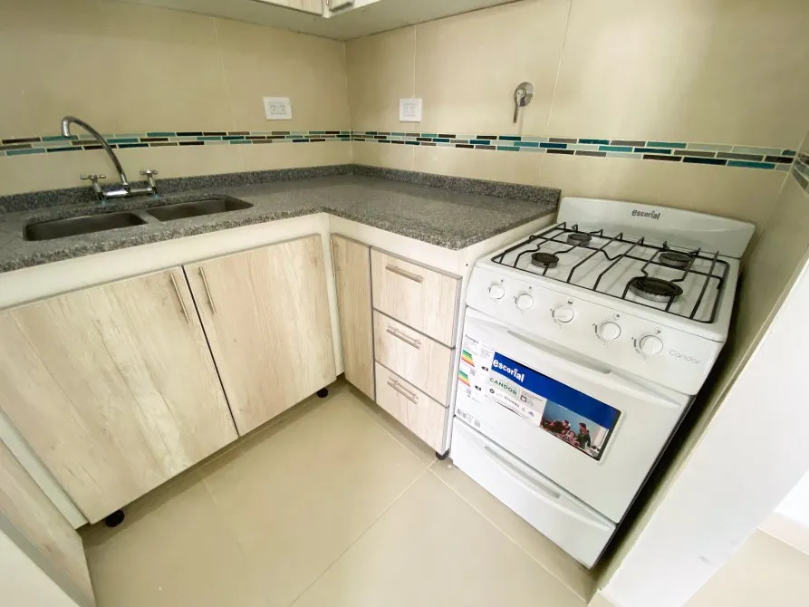 Apartamento de 2 ambientes com 42 m² totais, 1 quarto e varanda no contrafrente, em Lanús Centro. Tem sala de estar e jantar com piso cerâmico, janela-balcão, porteiro elétrico e conexões para ar-condicionado; cozinha equipada com cooktop, conexão para exaustor, armário de pia e balcão em granito com cuba dupla de aço. O banheiro é completo com banheira, bidê, espelho com luz LED e revestimento em cerâmica. O quarto tem piso cerâmico tipo flutuante, armário embutido com interiores e conexão para