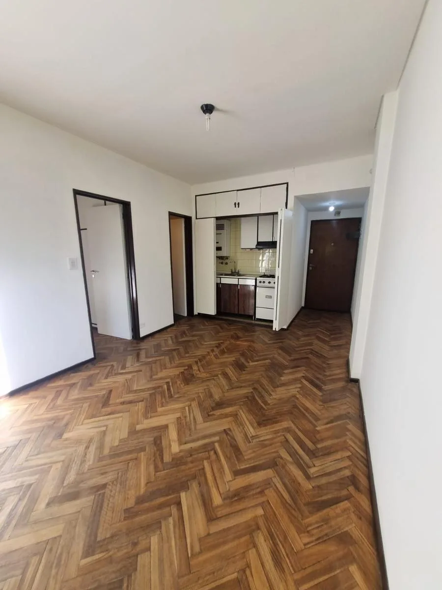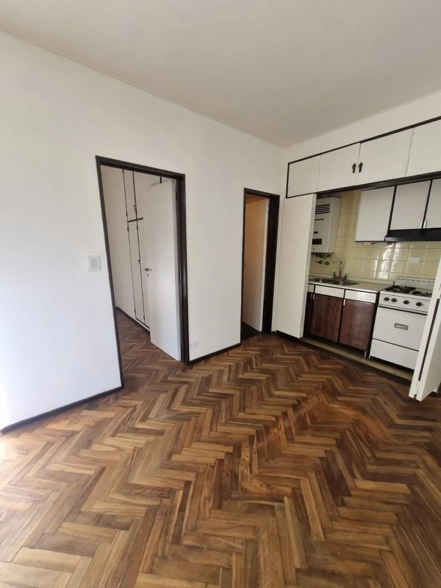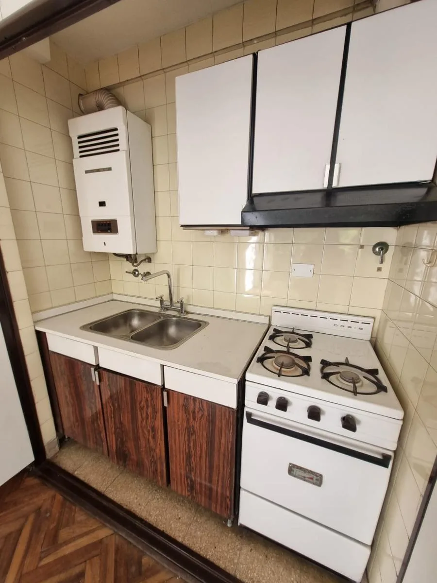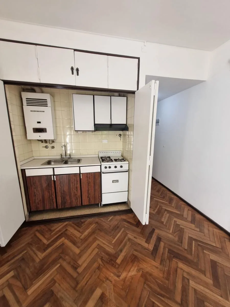 Apartamento de dois ambientes em Lanús Este, com 1 quarto e varanda. Sala e cozinha integradas com piso de parquet, com saída para a varanda de frente. Cozinha com armários planejados, pia dupla em aço inox e fogão; dormitório com piso de parquet, armário embutido e acesso à varanda. Banheiro completo com banheira. Apto para uso profissional.