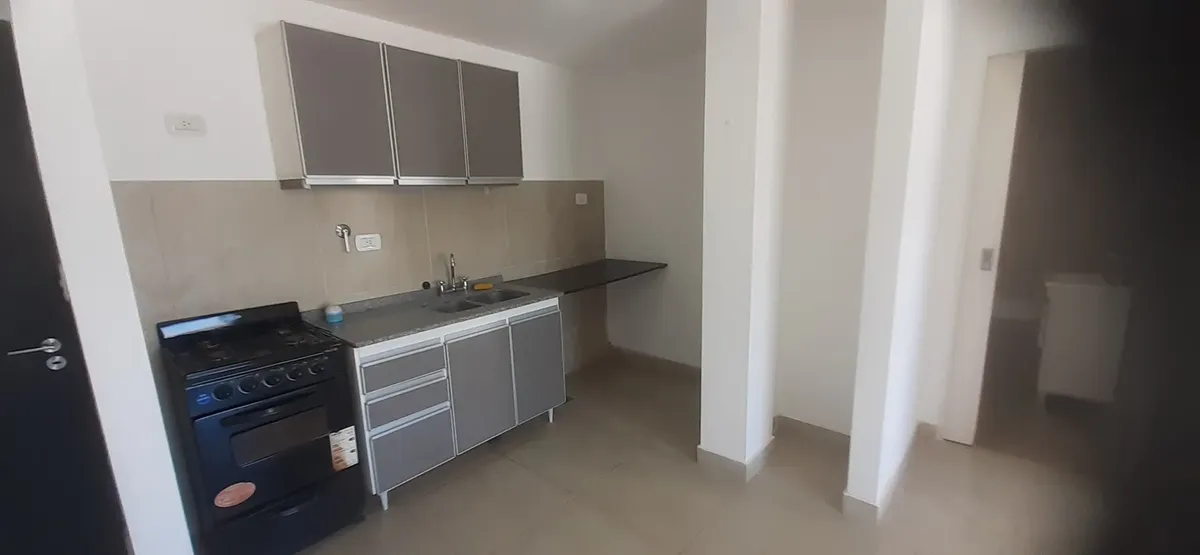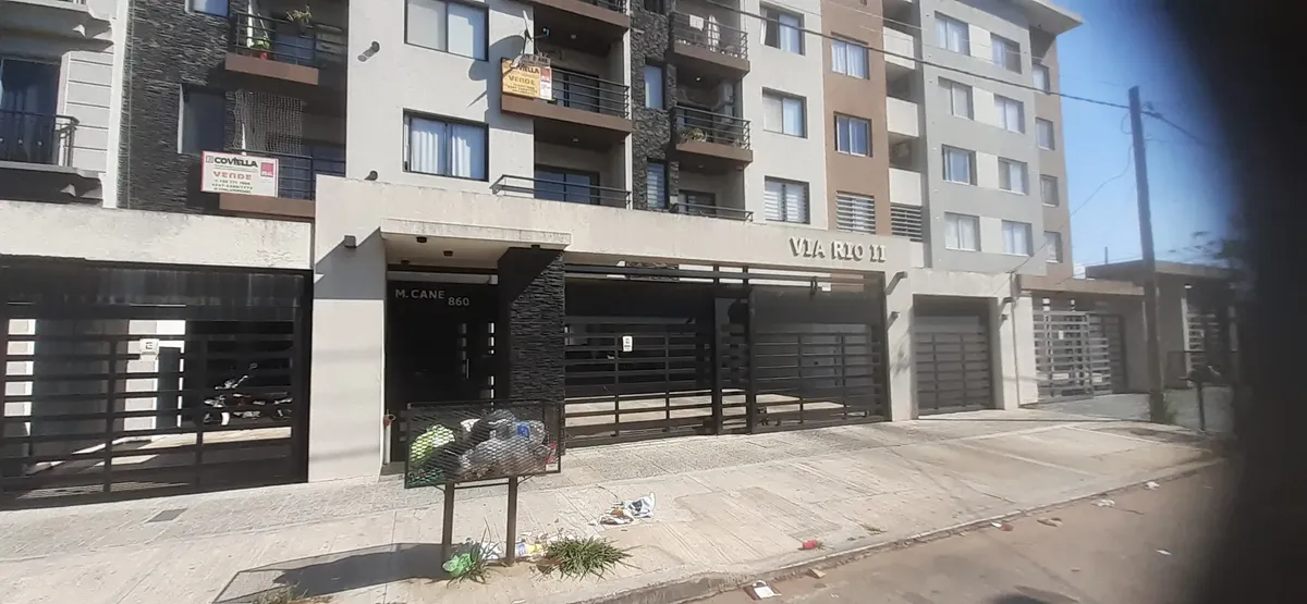 Apartamento de 2 ambientes no complexo Vía Río II, com 45 m² aprox., unidade no 1° andar “E” e voltada para os fundos. Inclui cozinha e sala na entrada, com armários embutidos (balcão superior e inferior), banheiro completo com banheira e quarto amplo com janelas e tiro balanceado. Tem varanda e é entregue pintado; condomínio de aprox. $125.000, incluindo luz comum, água e gás por caldeira.