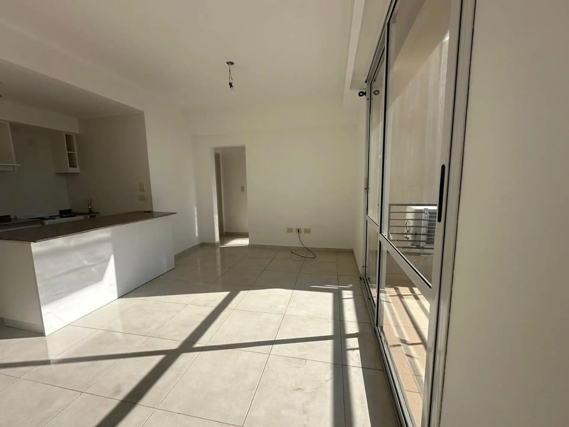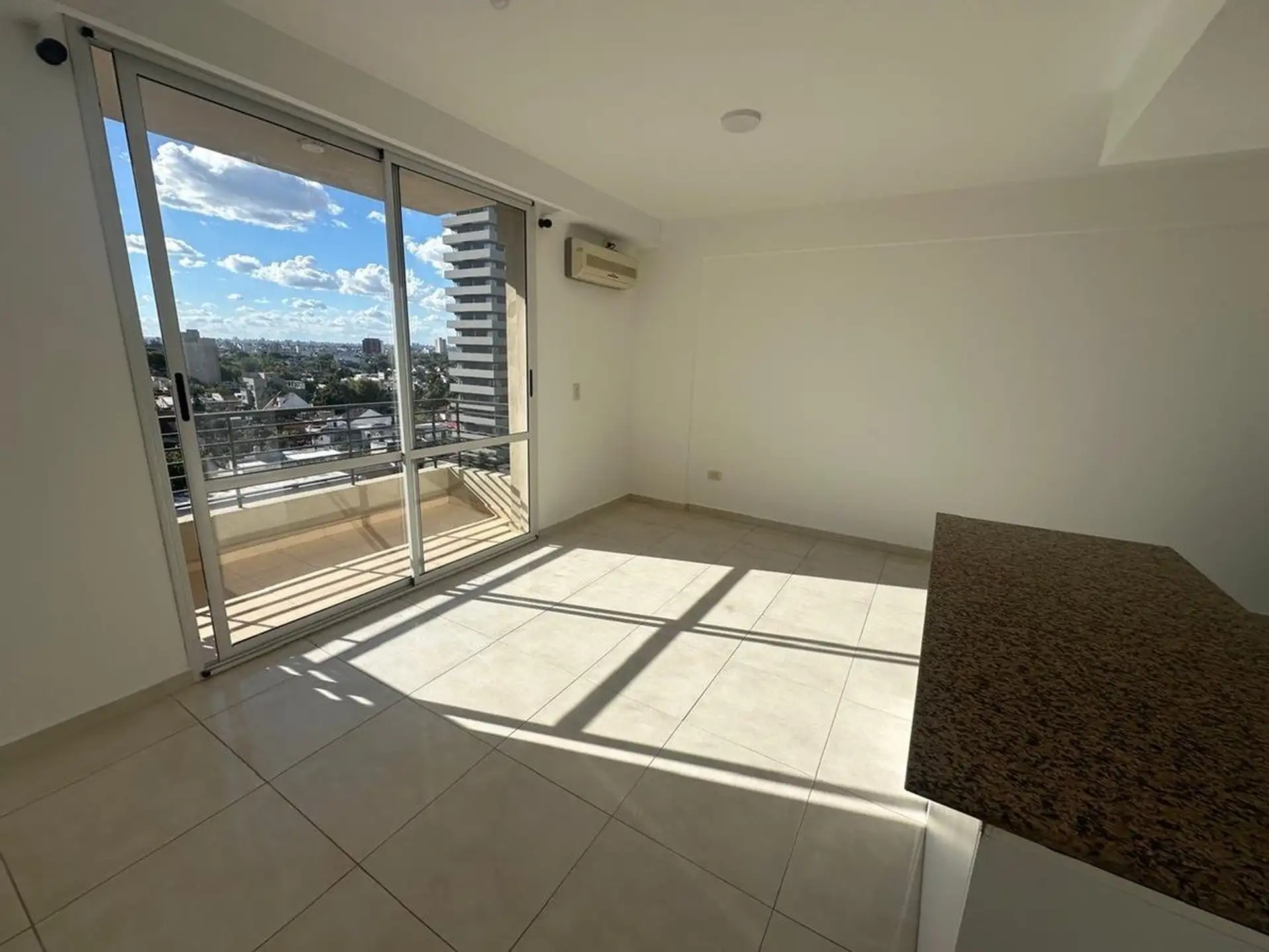 Apartamento de 2 ambientes no último piso (8º andar), com 1 quarto e vista aberta. Cozinha integrada com ilha e saída para a varanda, além de banheiro completo com ducha. Inclui vaga de garagem.