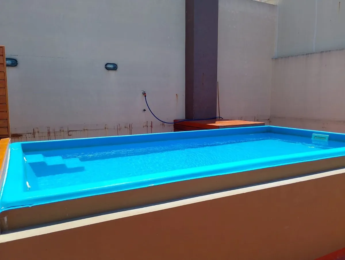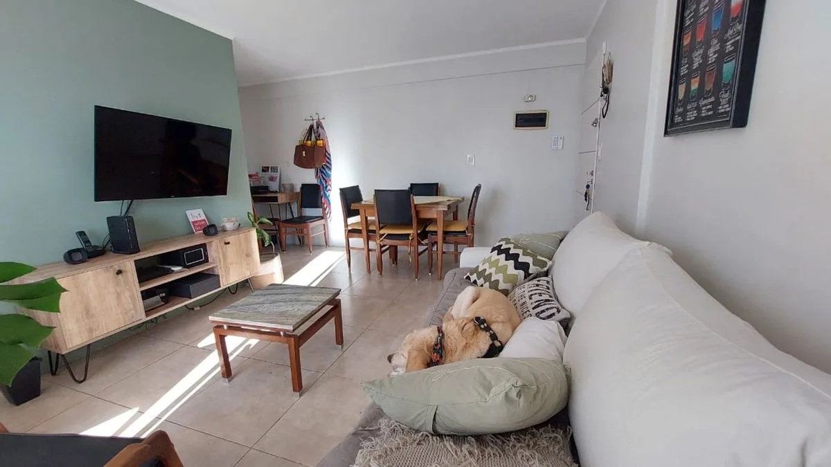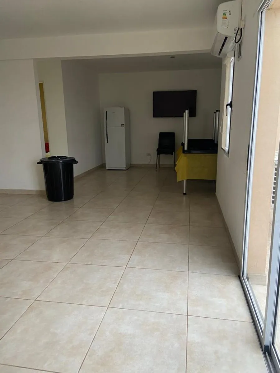 Apartamento de dois ambientes no primeiro andar, de fundos (contrafrente), com 1 dormitório e armário embutido. Possui banheiro completo e cozinha com área integrada de jantar e sala, além de varanda. É entregue com geladeira e ar-condicionado tipo frio-calor. O prédio tem academia, salão de festas e piscina na cobertura.