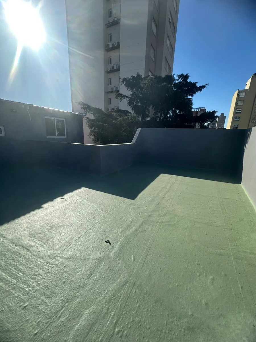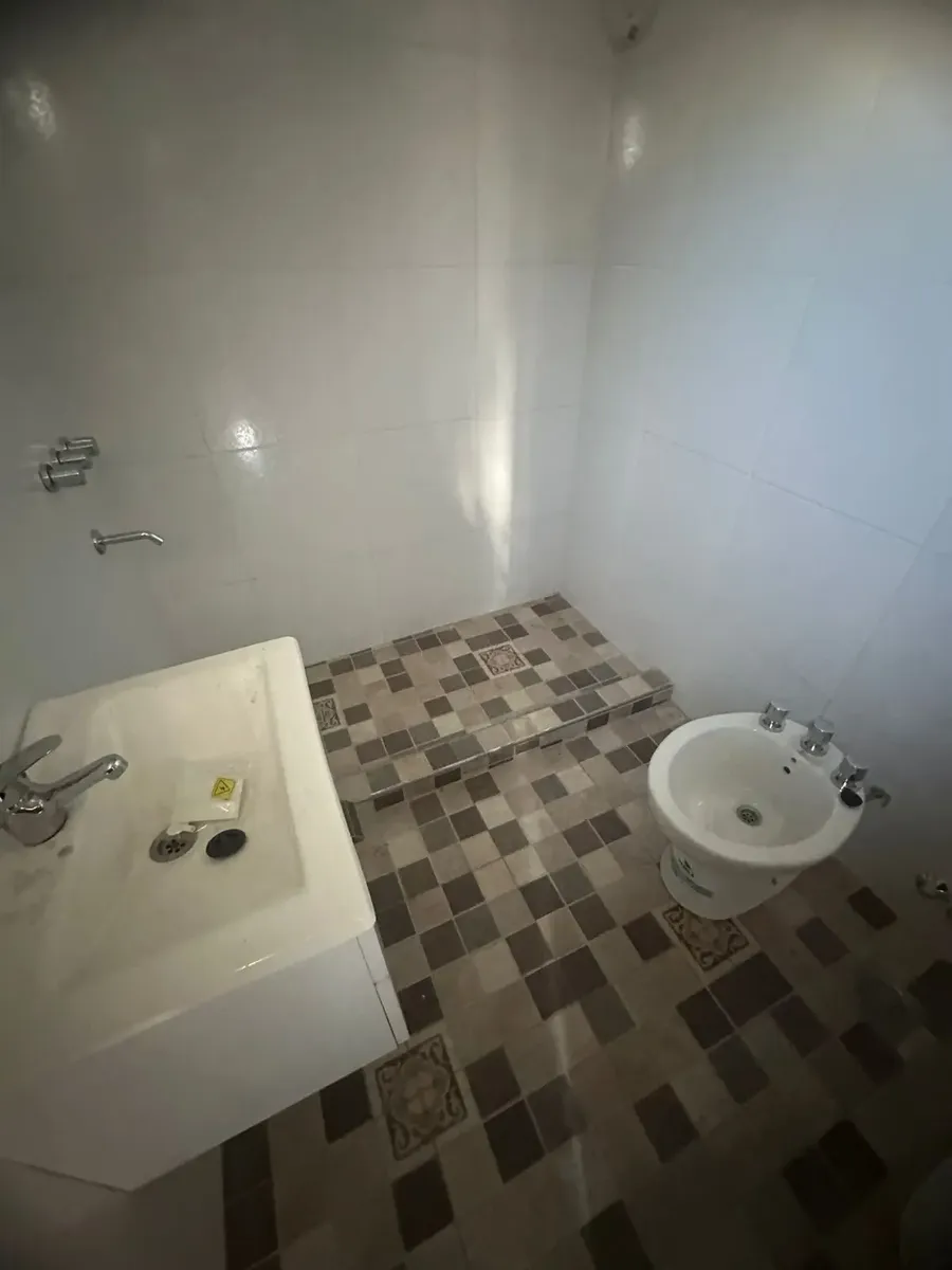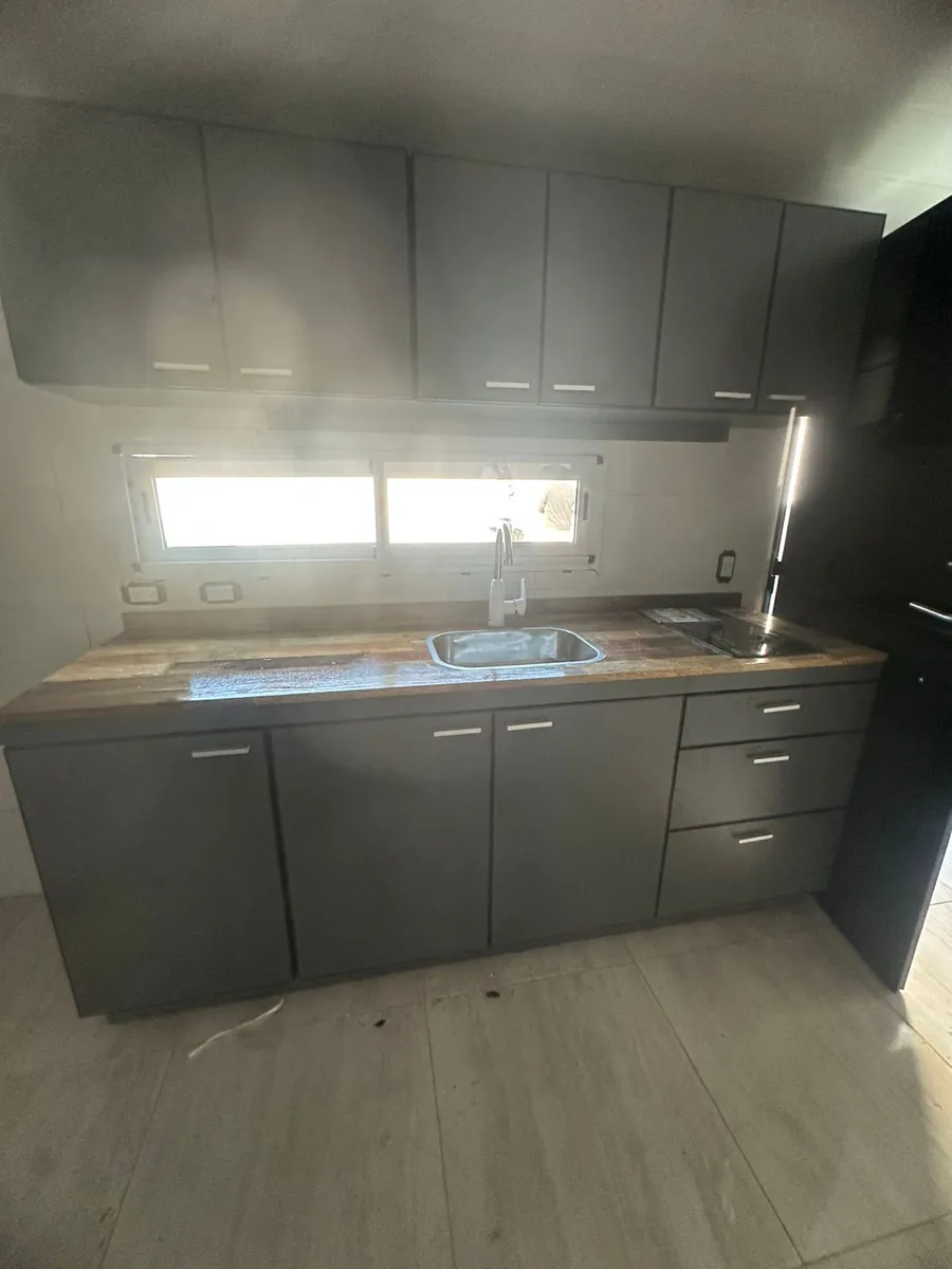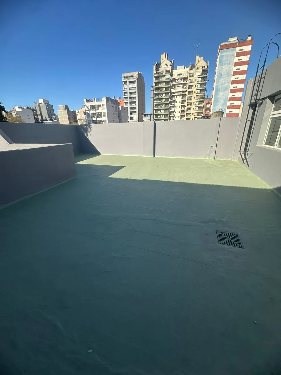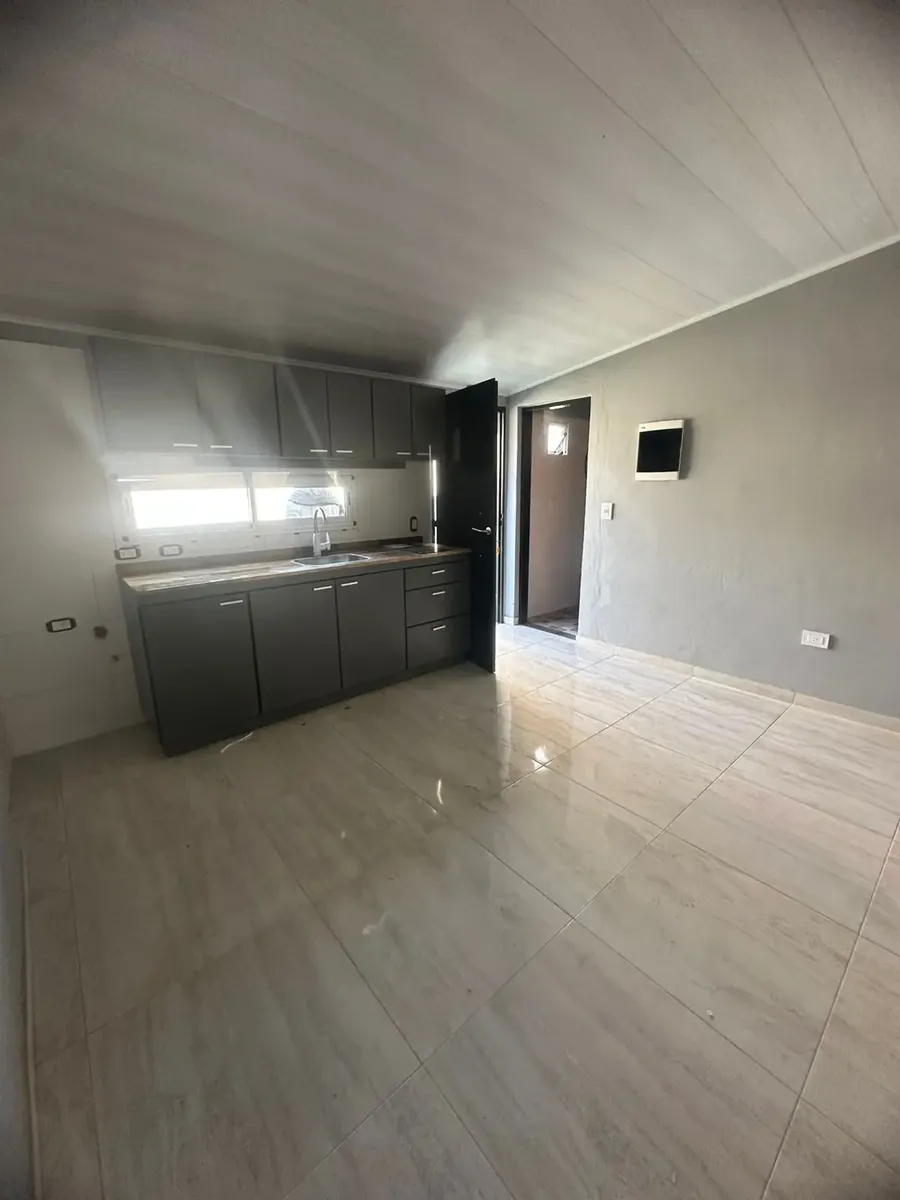 Apartamento em Lanús Oeste com 1 dormitório e 1 banheiro. A planta inclui área de cozinha com armário baixo, espaço para alacena e janela para o exterior. O dormitório tem janela para ventilação natural. O banheiro tem revestimento cerâmico e área de ducha, com bidê, vaso sanitário e lavatório. Pisos de placas cerâmicas nos ambientes. A unidade conta com ampla terraço de uso privado com acesso direto.