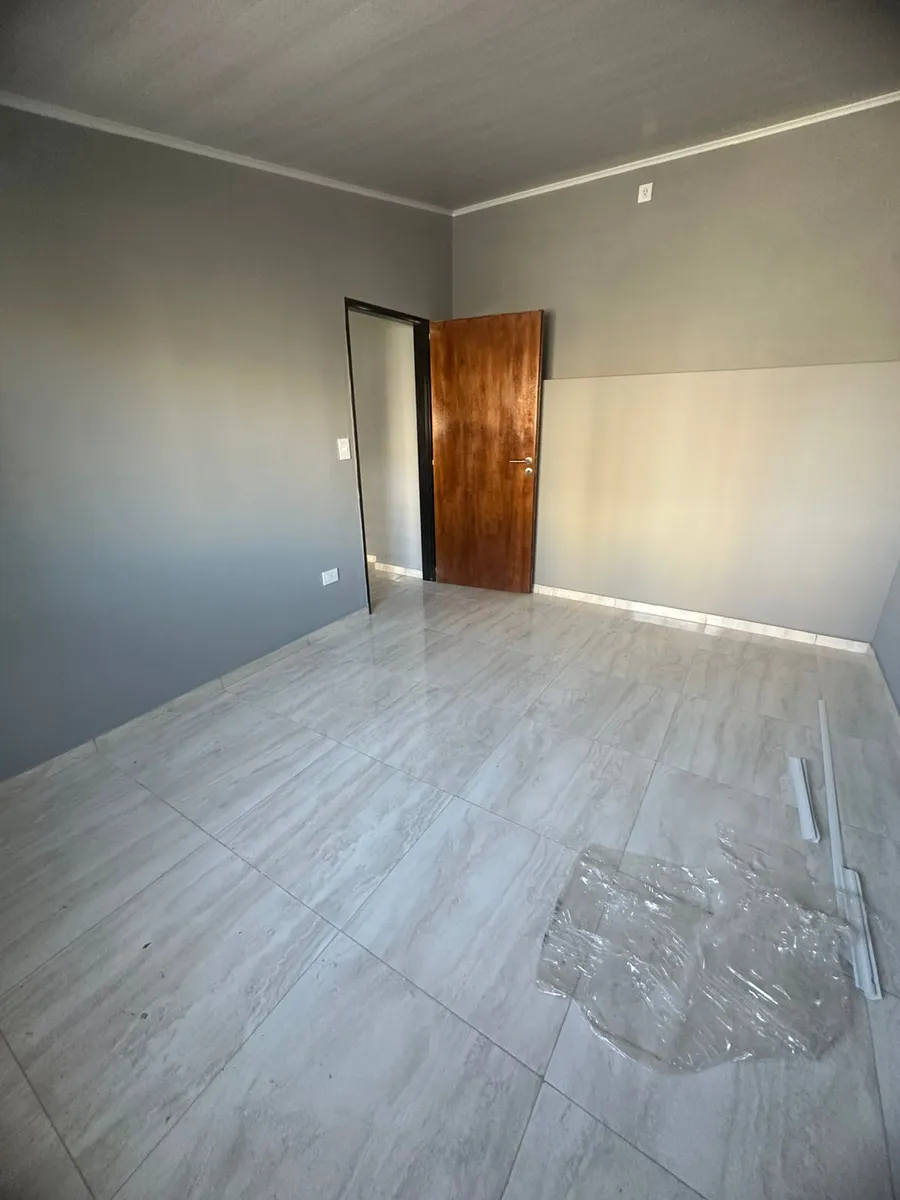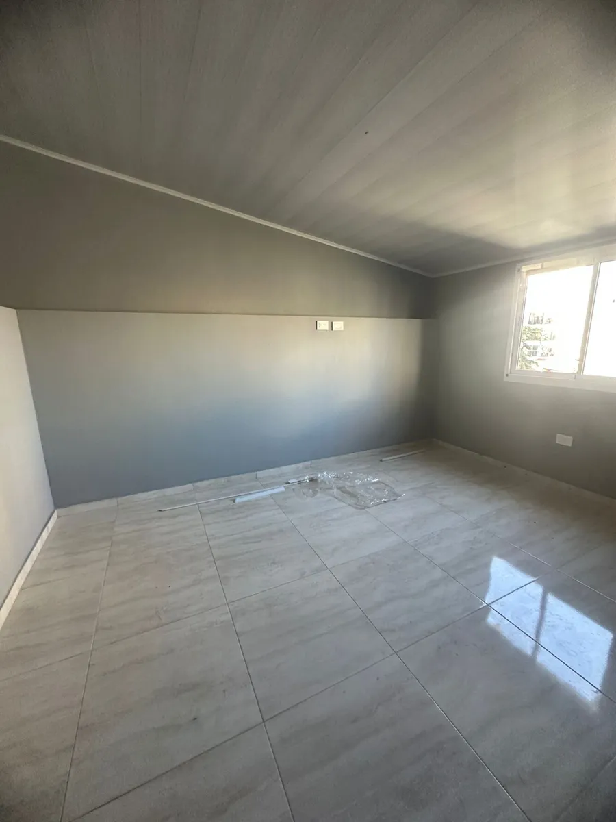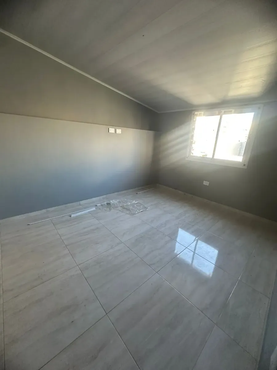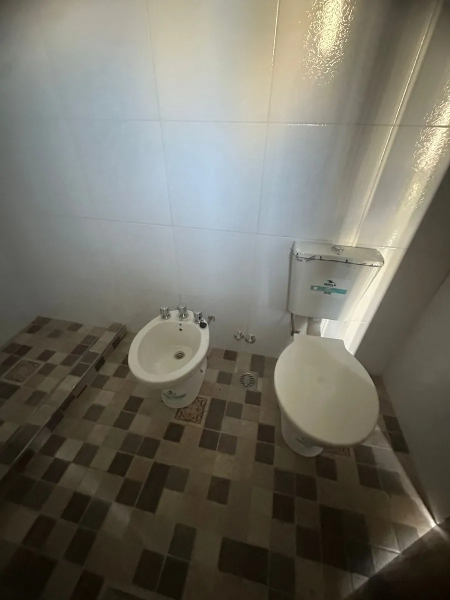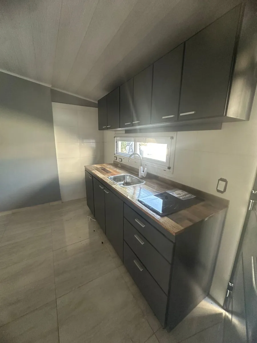 Apartamento em Lanús Oeste com 1 dormitório e 1 banheiro. A planta inclui área de cozinha com armário baixo, espaço para alacena e janela para o exterior. O dormitório tem janela para ventilação natural. O banheiro tem revestimento cerâmico e área de ducha, com bidê, vaso sanitário e lavatório. Pisos de placas cerâmicas nos ambientes. A unidade conta com ampla terraço de uso privado com acesso direto.