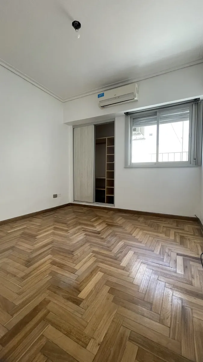 Apartamento de 2 ambientes em Liniers, com 1 quarto e cozinha separada. Inclui banheiro completo e um pequeno balcão. Há um amplo balcão coberto com teto de policarbonato.