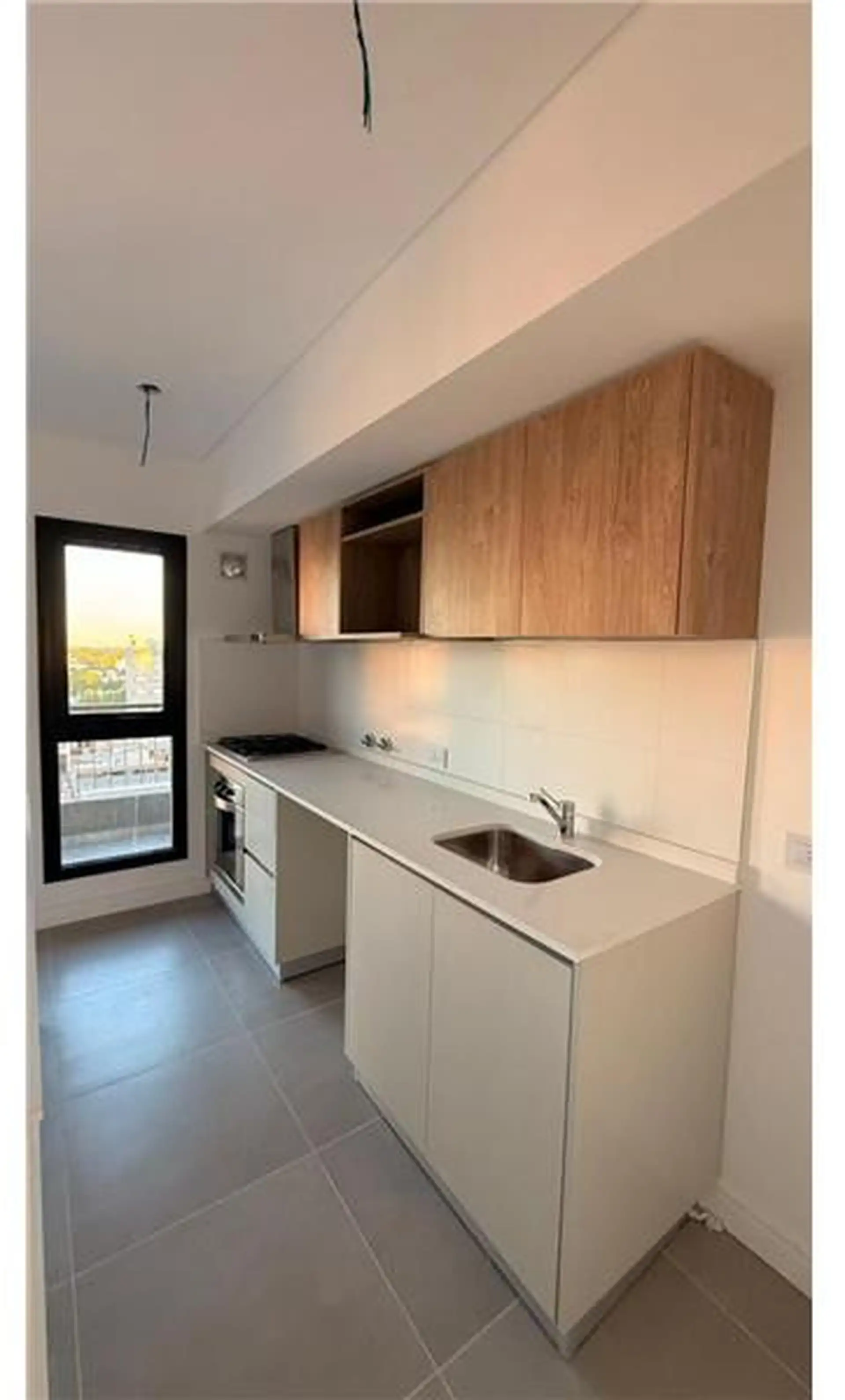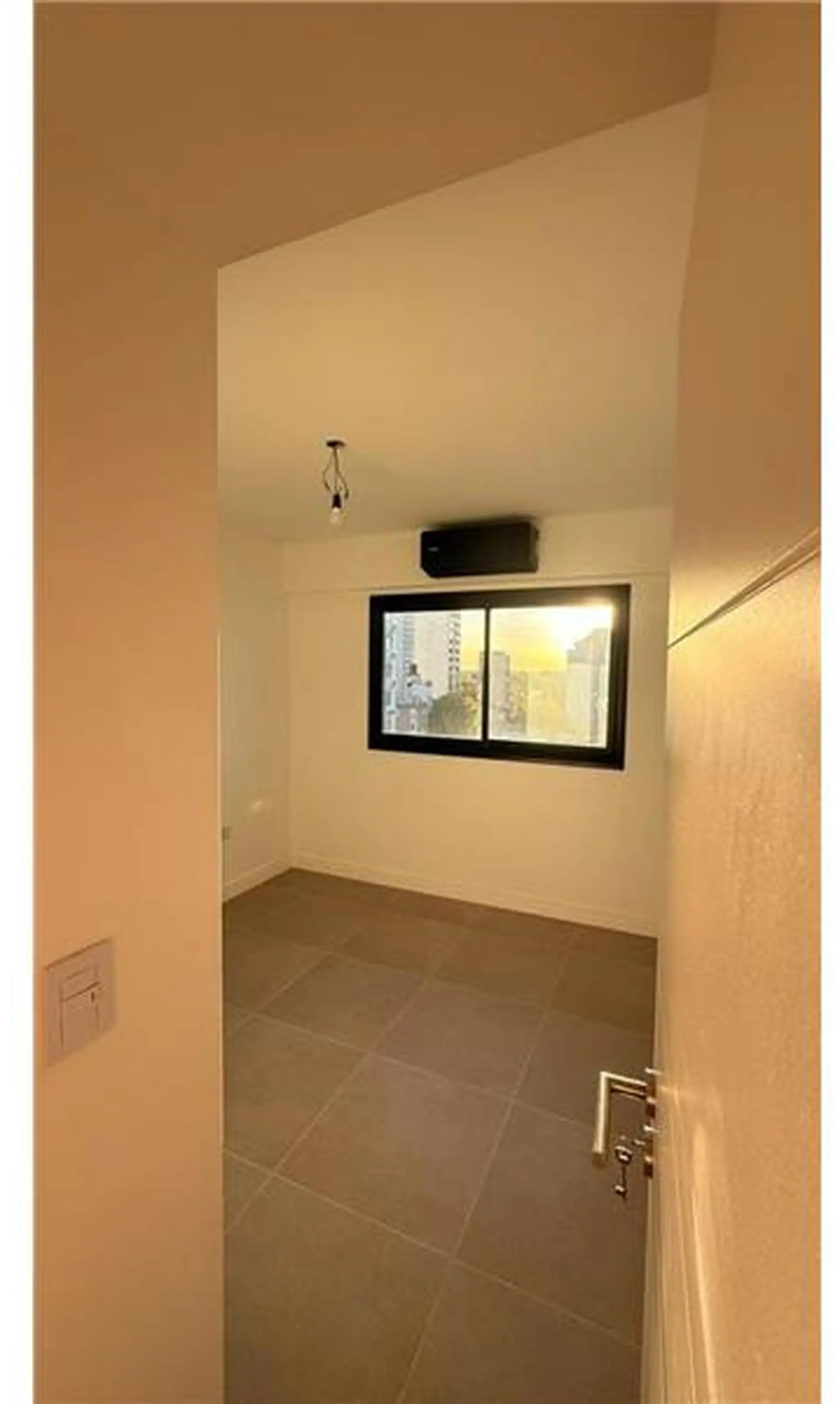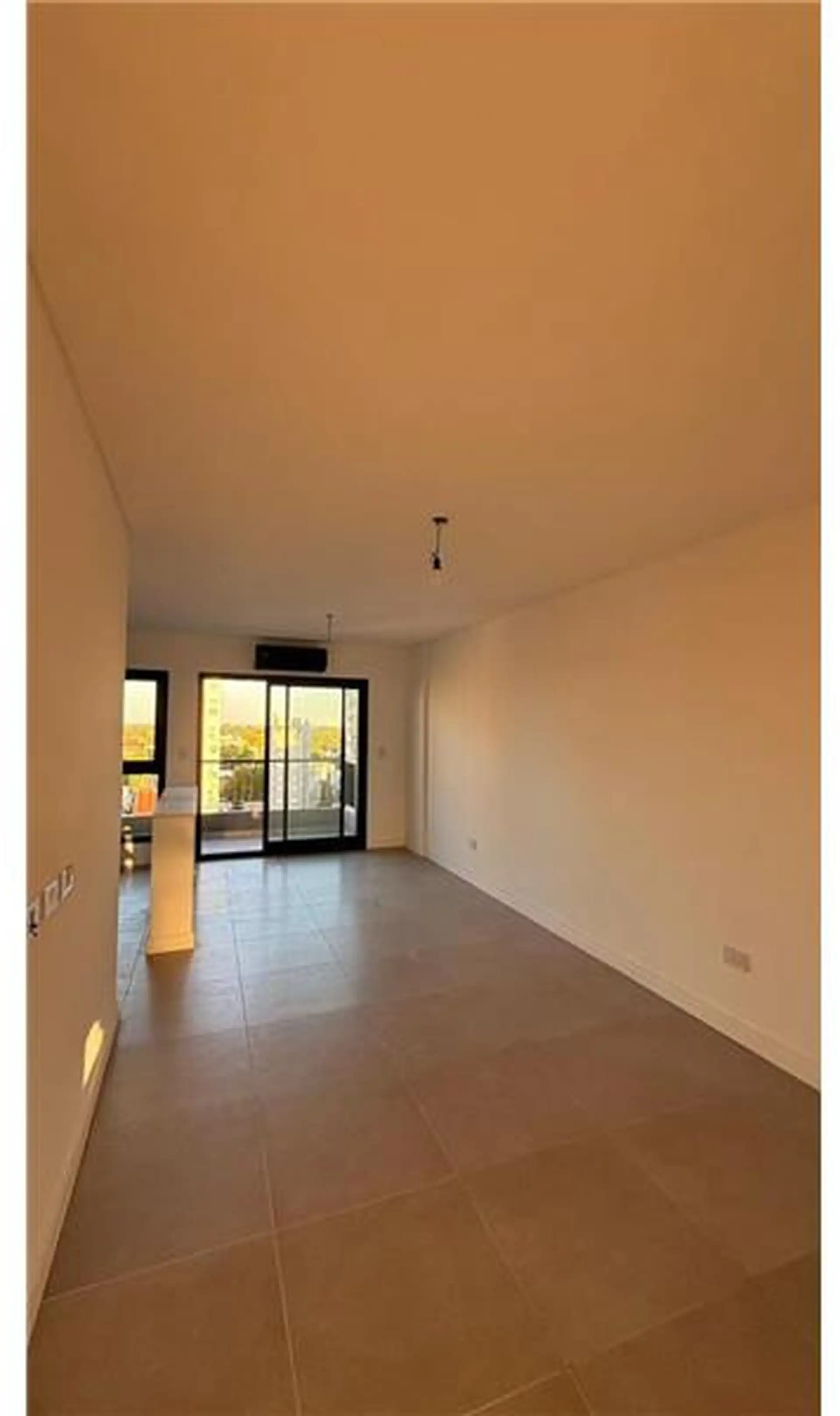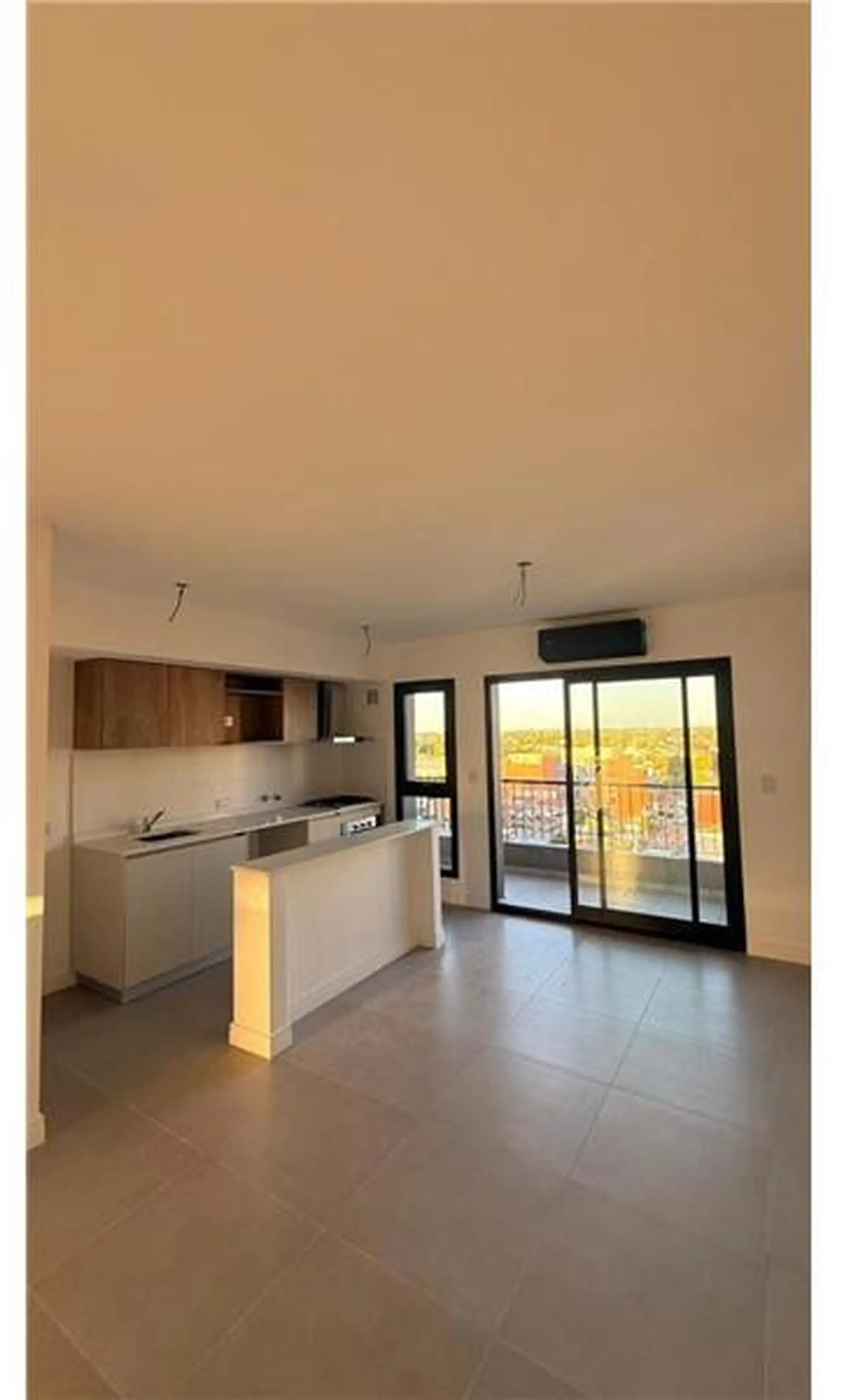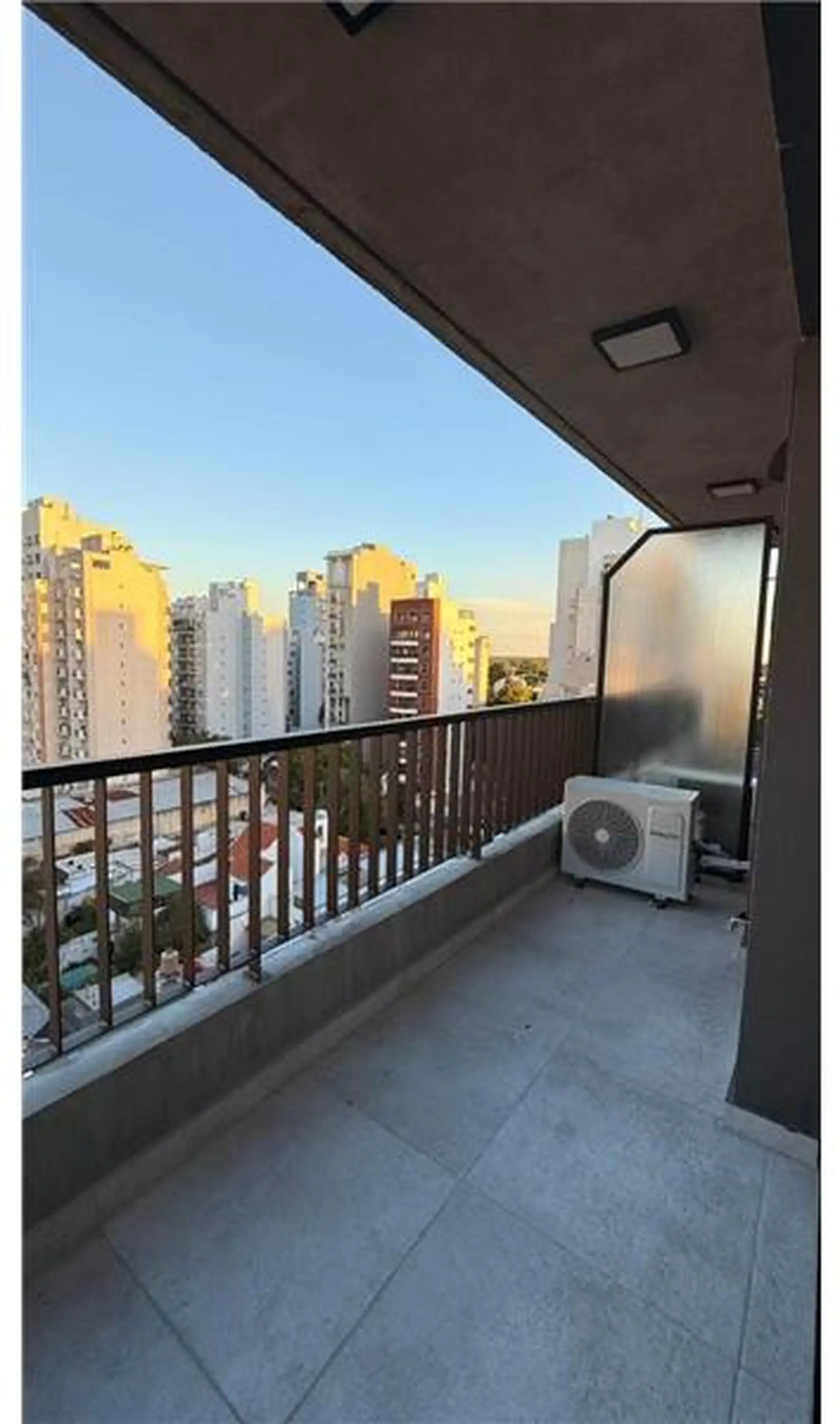 Apartamento de 2 ambientes com 45 m² no 8º andar, de frente para a rua, orientação leste, em Lomas de Zamora. Possui 1 quarto e 1 banheiro completo, com varanda-terraço. Inclui vaga de garagem coberta e ar-condicionado individual. O condomínio dispõe de SUM. O aluguel indica acesso a água corrente, esgoto, gás natural, eletricidade, internet e cabo.