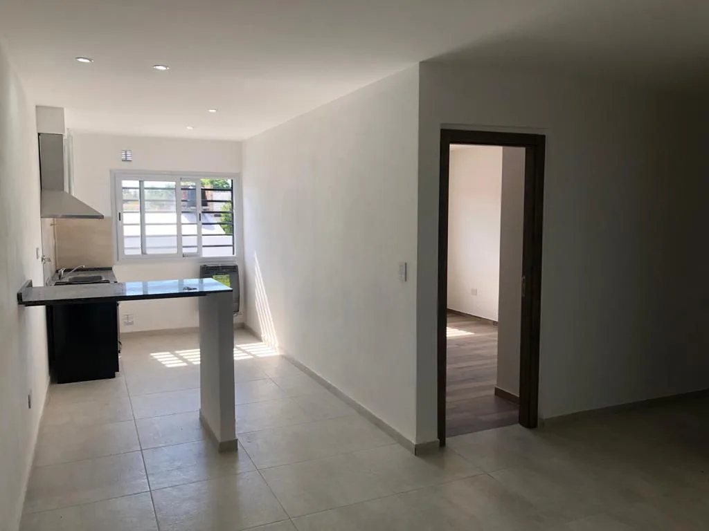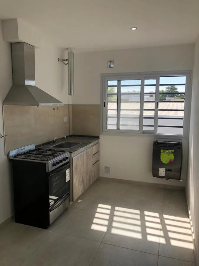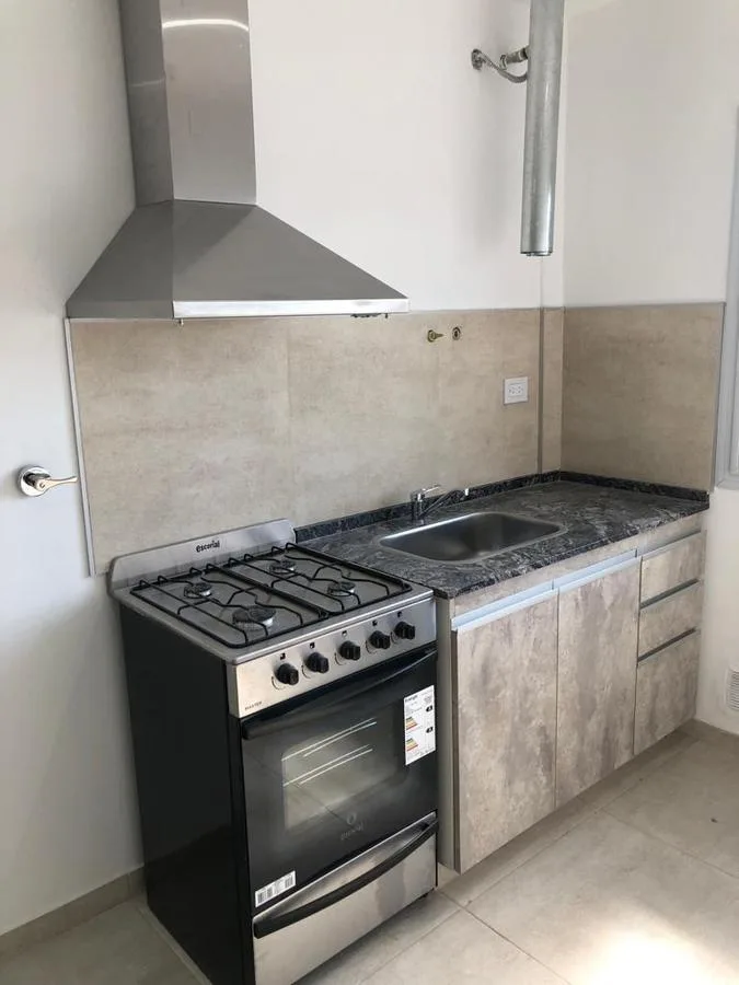 Apartamento de dois ambientes no bairro Sarmiento, com cozinha com armário inferior instalado. Sala de estar e jantar com balcão para refeições e banheiro completo. Quarto com armário embutido e calefator. Próximo ao Ferrocarril Oeste e a paradas de coletivos. Não são permitidas crianças nem animais; máximo de 2 pessoas. Condomínio com baixo valor; contrato de 24 meses com reajuste a cada 4 meses pelo ICL.