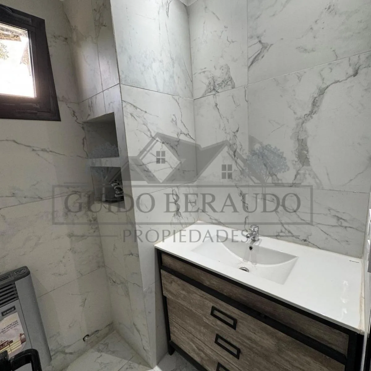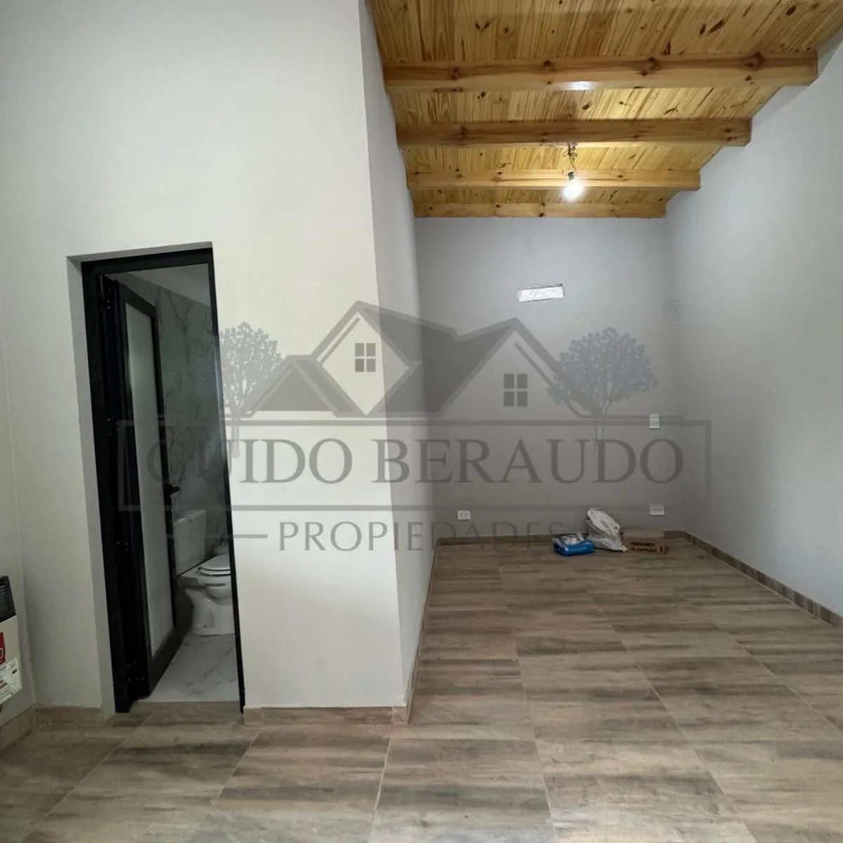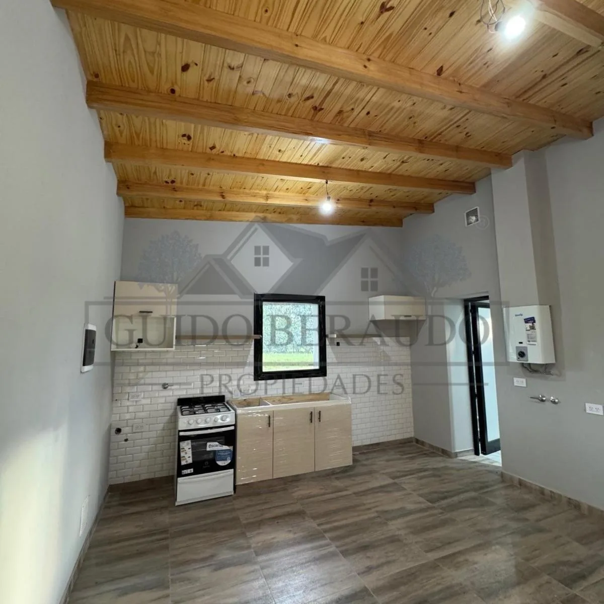 Apartamento de dois ambientes em Santa Matilde, Comarcas de Luján, com 1 quarto e vista para o jardim. Possui cozinha mobiliada com fogão Escorial de 4 bocas, bancada inferior com pia, prateleiras e duas aéreas, além de 2 banheiros. O quarto em suíte inclui banheiro completo e móveis embutidos, com acesso ao jardim que tem galeria e área de churrasco. O valor do aluguel é de USD 1.000 e inclui condomínio.