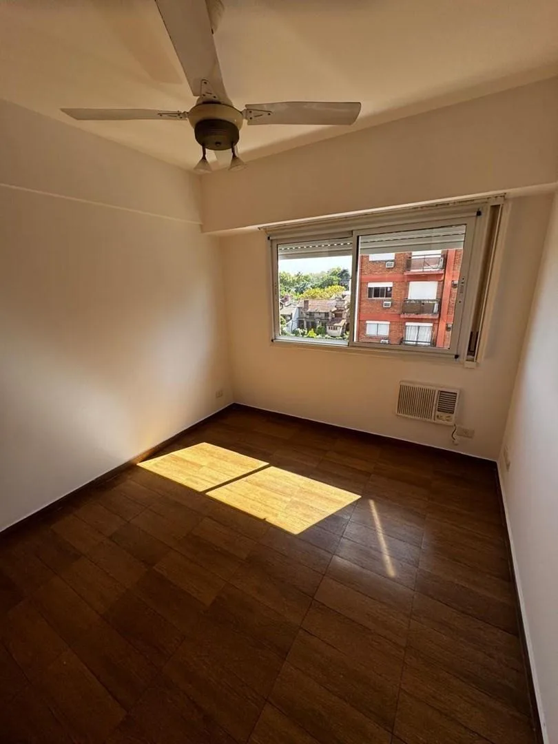 Apartamento de 2 ambientes com 1 quarto em Acassuso, San Isidro, no 3º andar, com boa vista e entrada de luz natural. Sala de estar e jantar com varanda, quarto com armário embutido e ar-condicionado, cozinha independente com móveis na parte inferior e armários superiores e acesso direto à varanda, além de banheiro completo e hall de distribuição. O prédio tem dois elevadores. O aluguel tem contrato de 2 anos, com reajuste trimestral pelo IPC e exige comprovação de renda e garantia; o condomínio