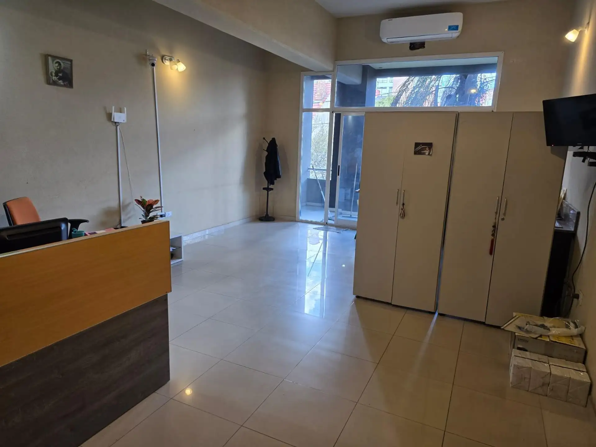 Apartamento de 2 ambientes para locação em Martínez, localizado no 1º andar, sobre a rua Emilio Mitre, a cerca de meio quarteirão da Av. Santa Fe. Possui 1 quarto, banheiro completo e lavabo, kitchenette e varanda coberta. Tanto a sala quanto o quarto têm ar-condicionado frio/calor. O condomínio tem valores baixos e inclui os serviços; imóvel apto para uso profissional.