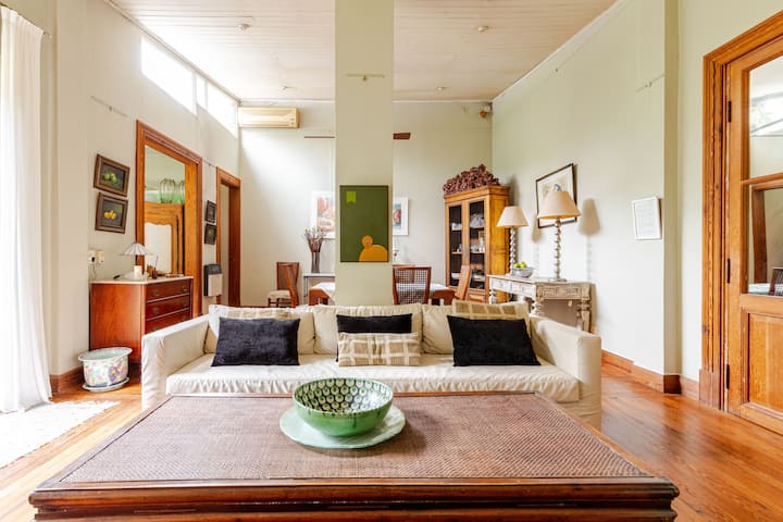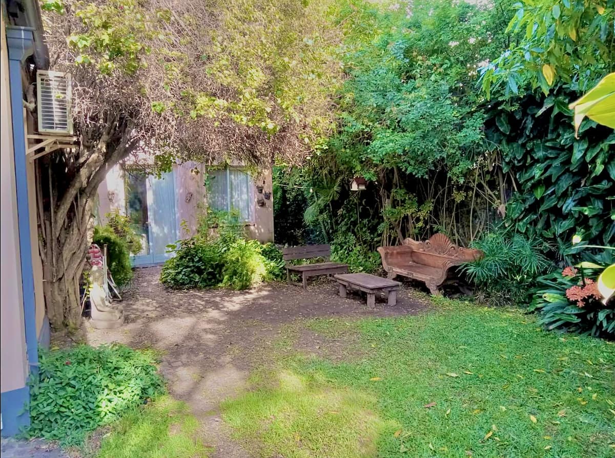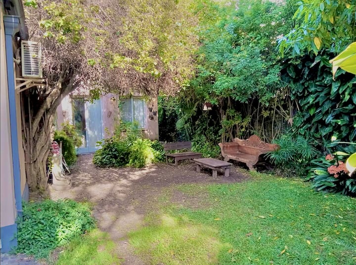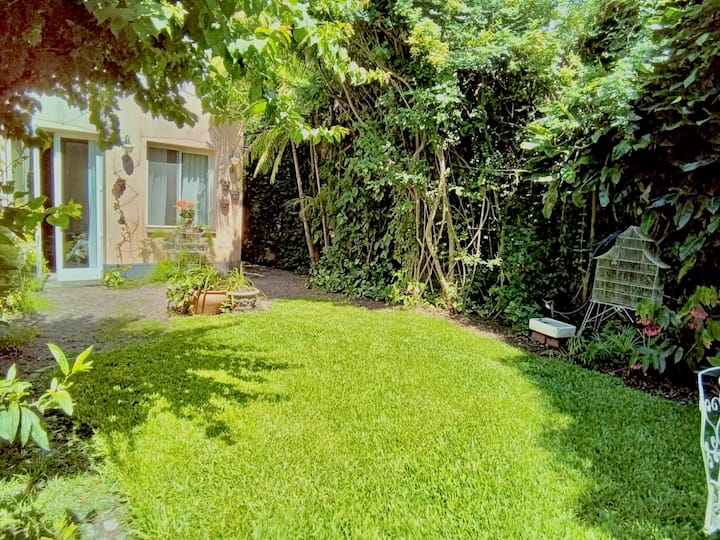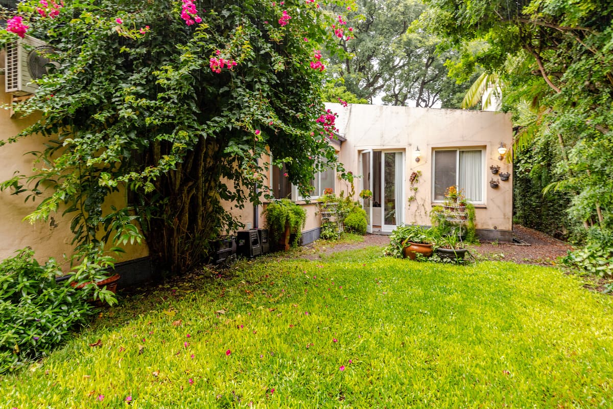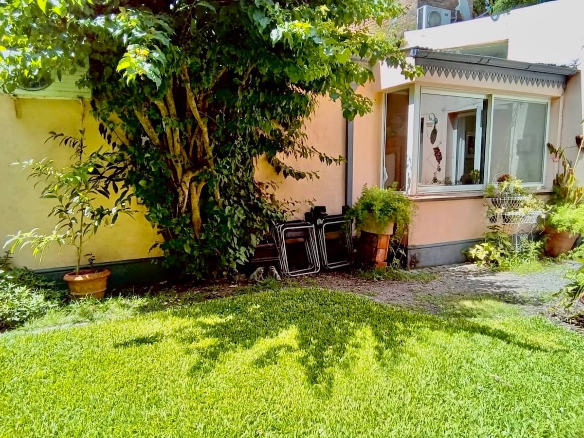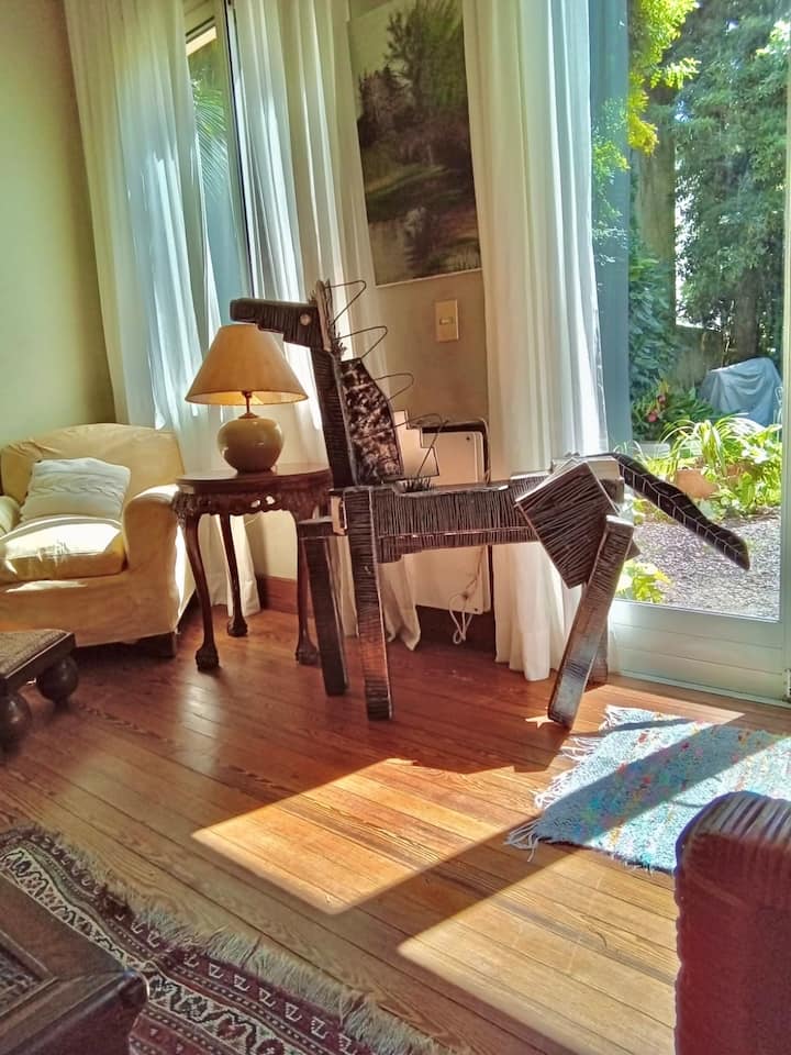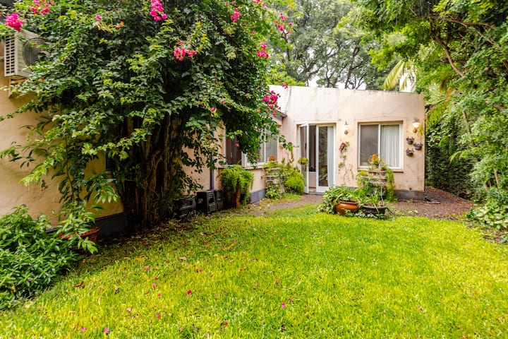 Apartamento reformado em Martínez. A descrição menciona espaços abertos, muitas janelas e iluminação natural ligada ao jardim. O bairro fica a cerca de 4 quarteirões a pé de opções de comércio e transporte ferroviário, com trens funcionando até meia-noite. A viagem a Retiro é descrita como aproximadamente 30 minutos.