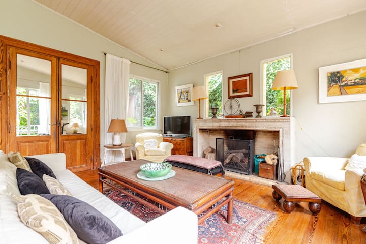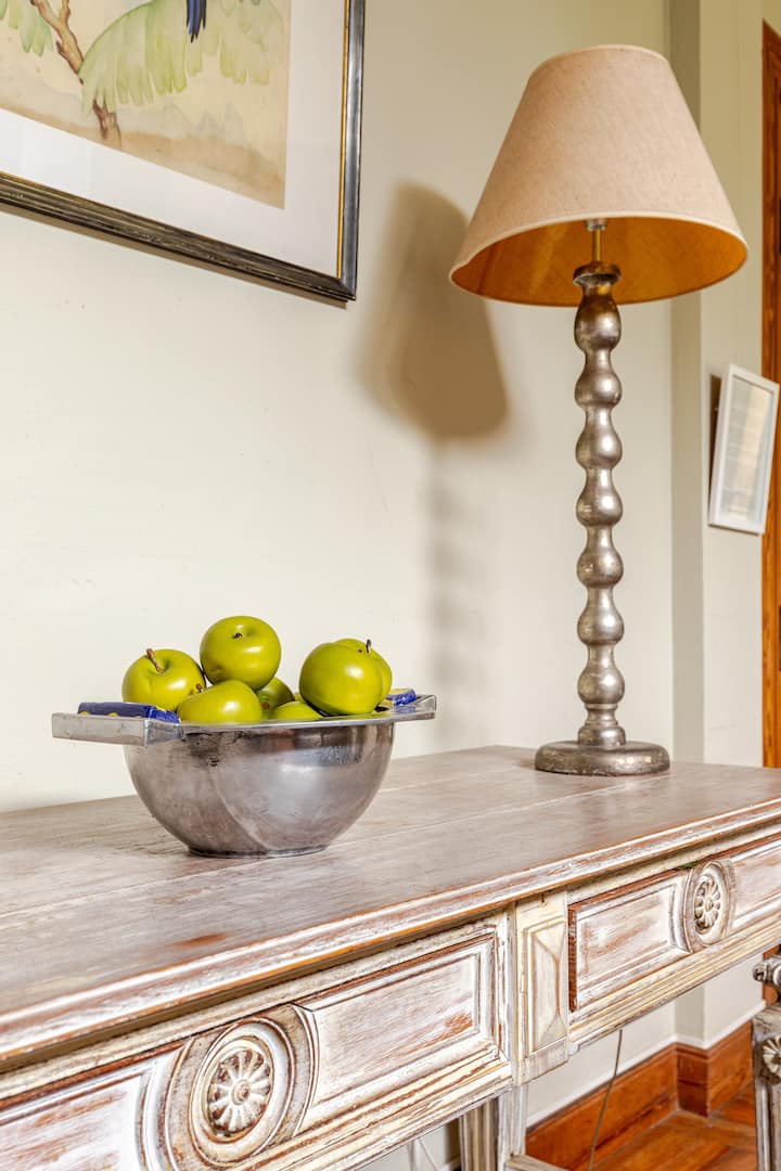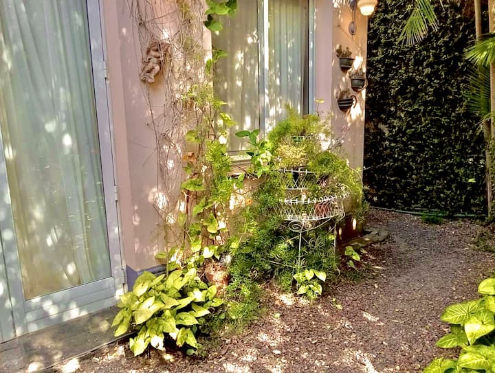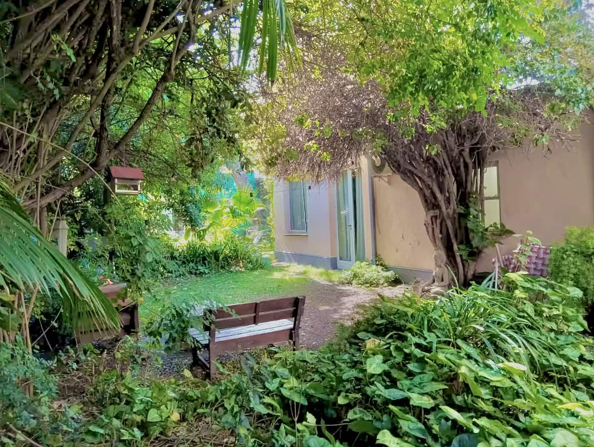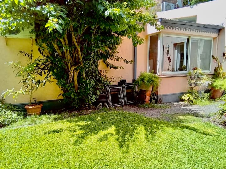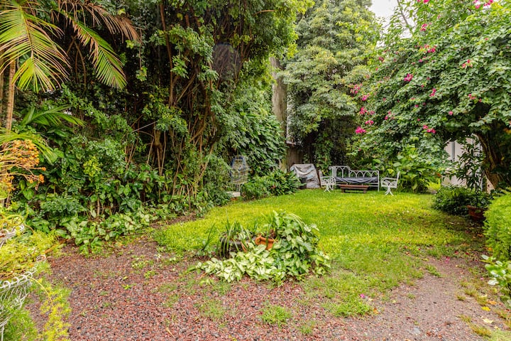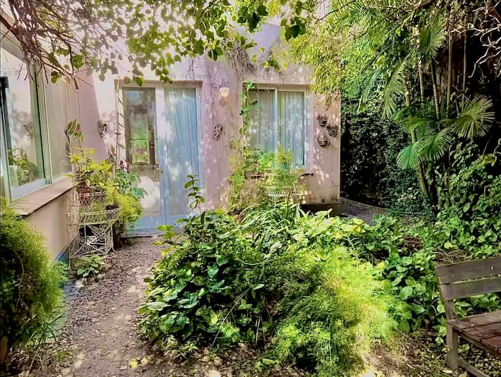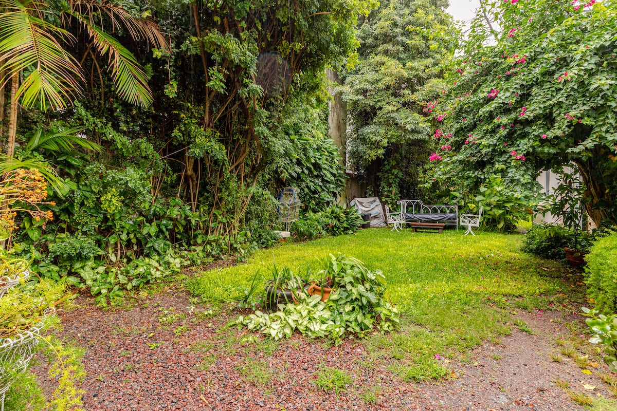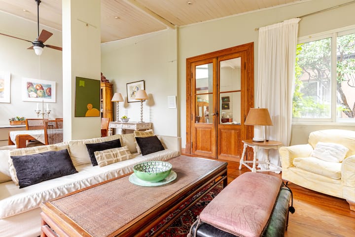 Apartamento reformado em Martínez. A descrição menciona espaços abertos, muitas janelas e iluminação natural ligada ao jardim. O bairro fica a cerca de 4 quarteirões a pé de opções de comércio e transporte ferroviário, com trens funcionando até meia-noite. A viagem a Retiro é descrita como aproximadamente 30 minutos.